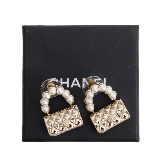 Chanel 2022 Gold Plated Faux Pearl Purse Drop Earrings w/ Box