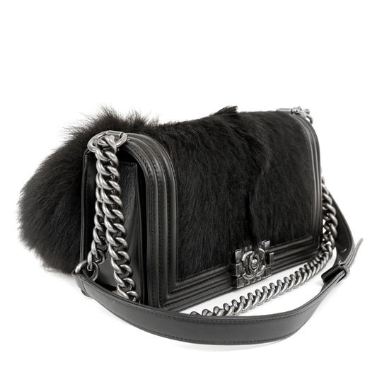 Chanel Black Fox Fur Boy Bag with Tail & Ruthenium Hardware
