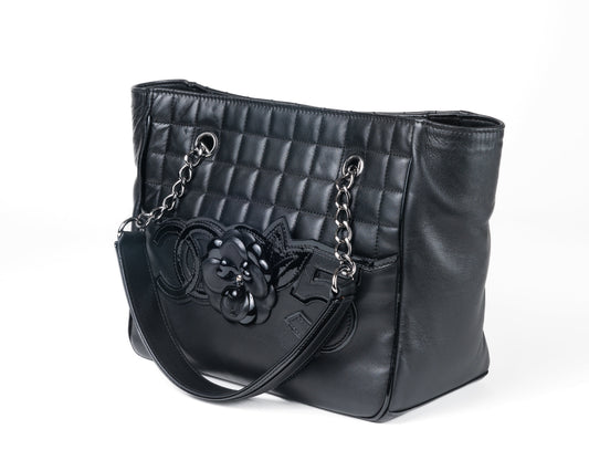 Chanel Black Lambskin Leather Camellia Logo Tote Bag