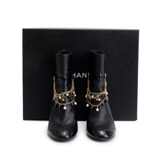 Chanel Black Leather Faux Pearl Bead Charms Interlocking CC Logo Chain Lace Up Ankle Boots, Size 40 w/ Box