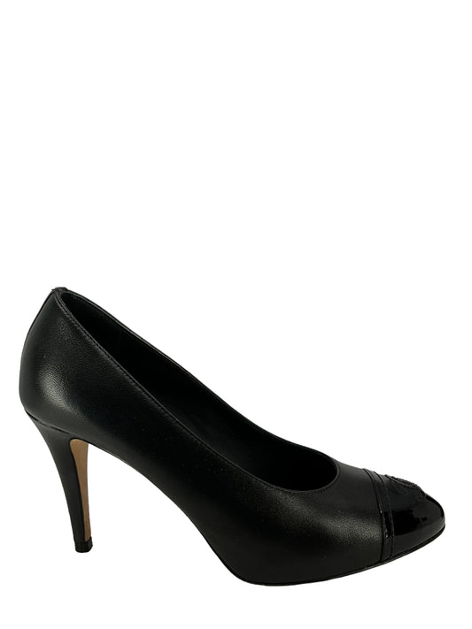 Chanel Black Lambskin Pumps With Patent Leather CC Size 6.5