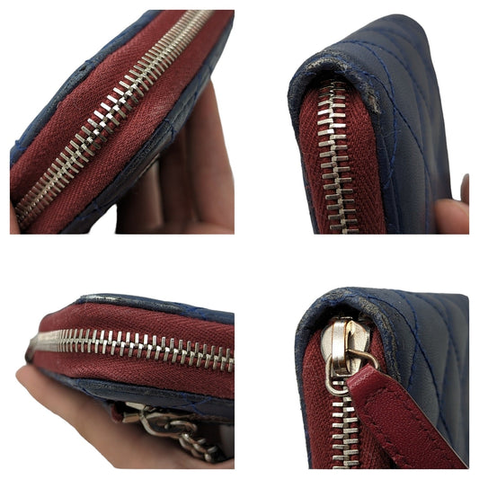 Chanel Blue Bicolor Quilted Maroon Trim Compact Zip Around Wallet