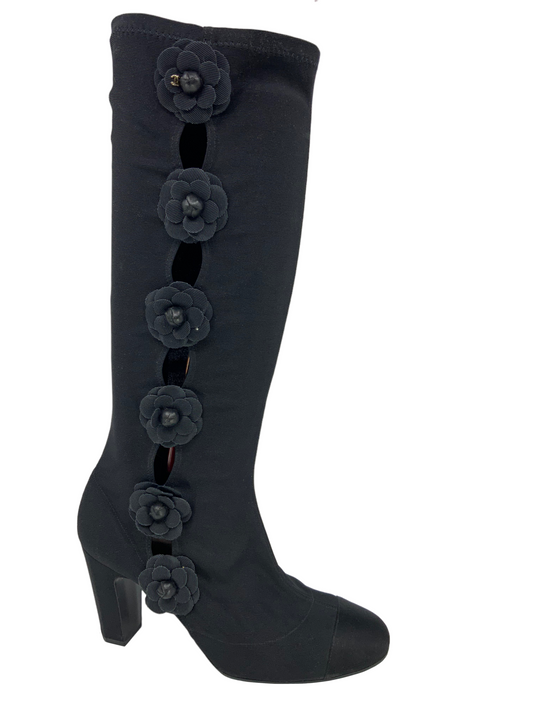CHANEL Camellia Satin Sock Mid Calf Boots Size 10