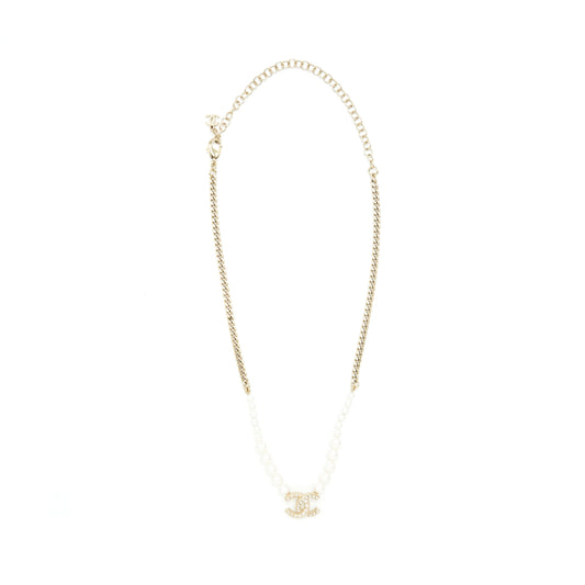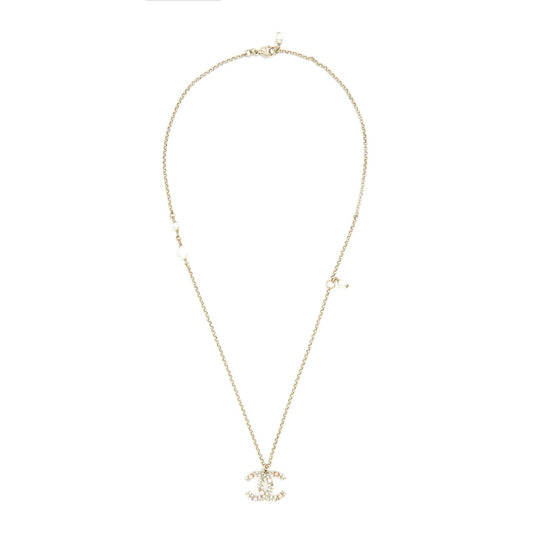 Chanel CC Logo And Crystal Necklace Light Gold Tone