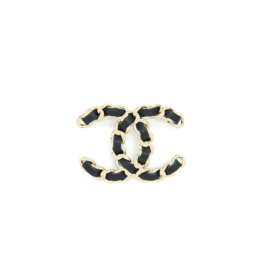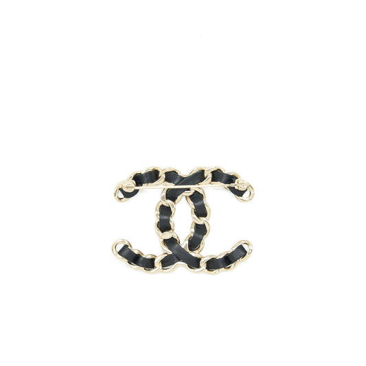 Chanel CC Logo Leather Chain Brooch Black And Light Gold Tone