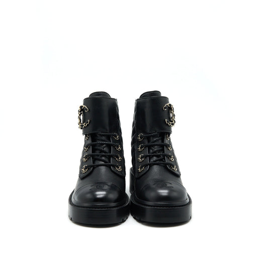 CHANEL LEATHER LACE UP BOOTS BLACK SIZE35