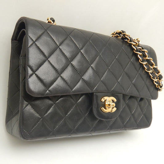 CHANEL Matelasse 25 Double Flap Chain Bag Lamb Skin Black Gold CC 109063A