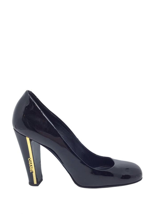 Chanel Patent Leather Metal Logo Heel Pumps Size 7.5
