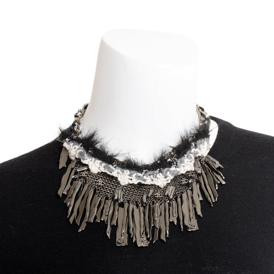 Chanel Ruthenium Faux Fur & Tweed Chainmail & CC Logo Fringe Necklace w/ Box