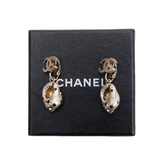 Chanel Vintage Gold Plated Silver Strass Shell CC Clip On Drop Earrings w/ Box