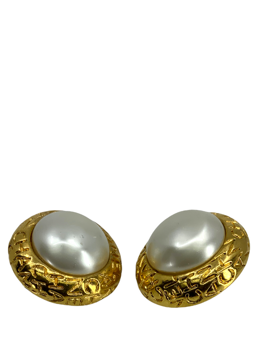 Chanel Vintage Gold Logo Pearl Clip-On Earrings