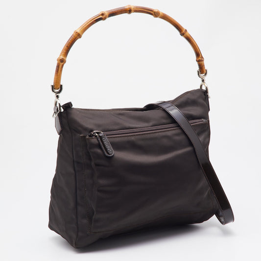 GUCCI Brown Nylon and Leather Bamboo Hobo