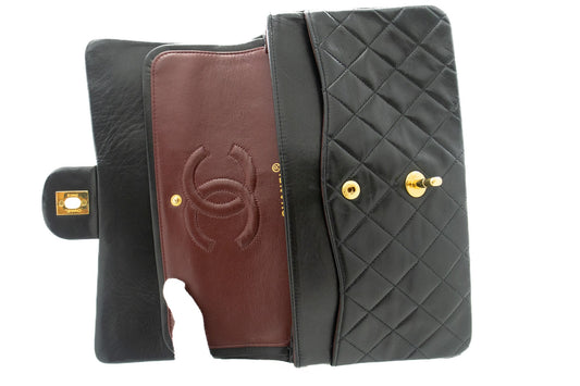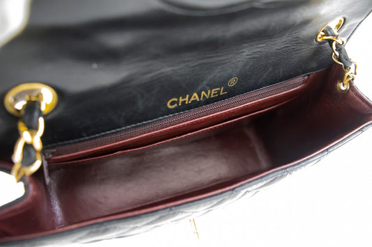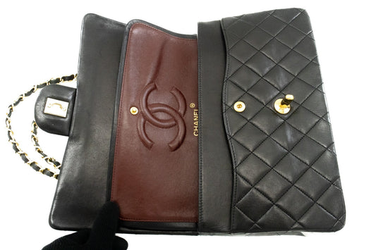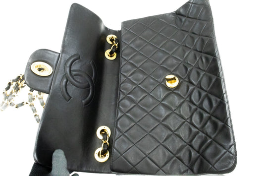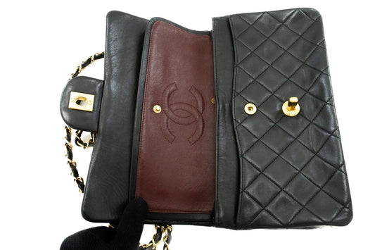 CHANEL Classic Double Flap 10" Chain Shoulder Bag Black Lambskin k66
