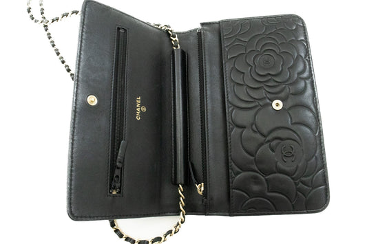 CHANEL Black Camellia Embossed Wallet On Chain WOC Shoulder Bag k53