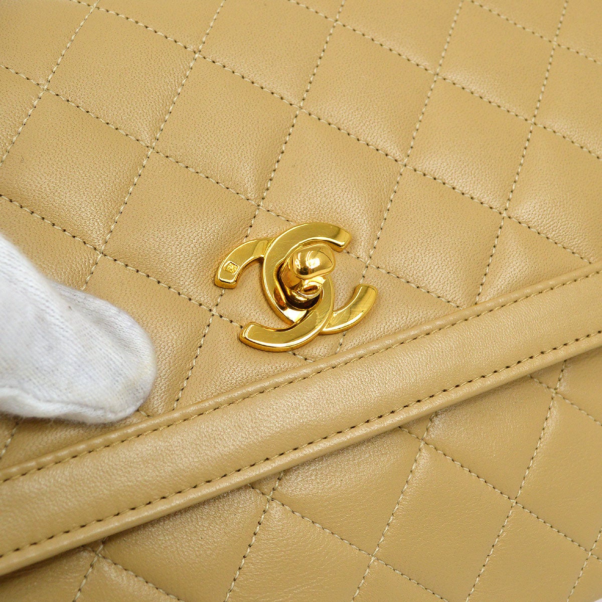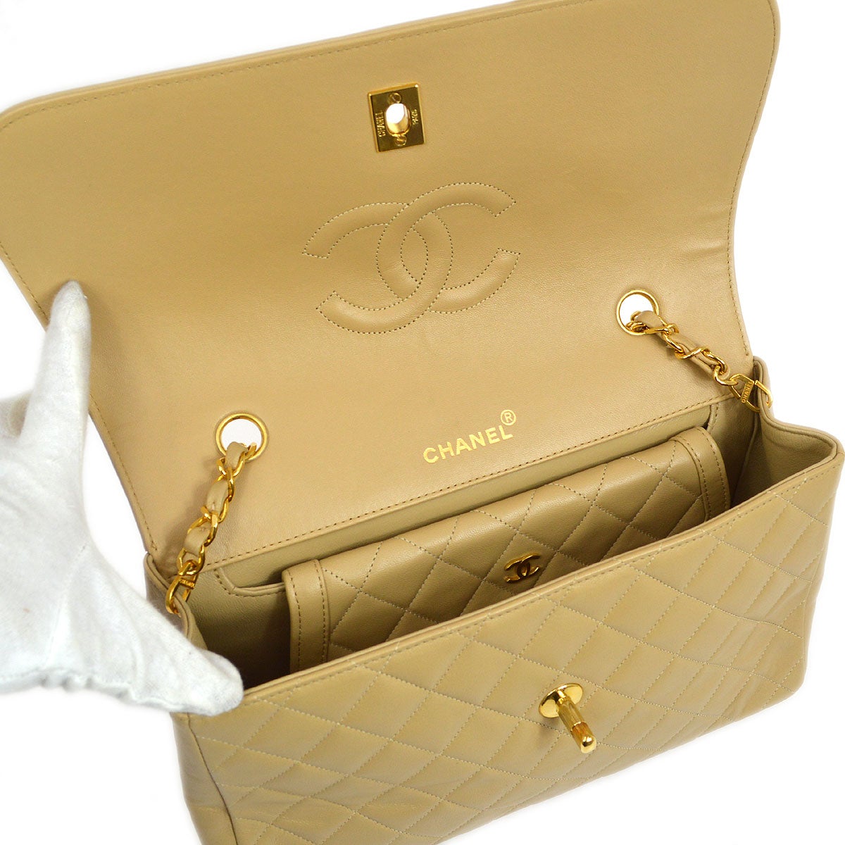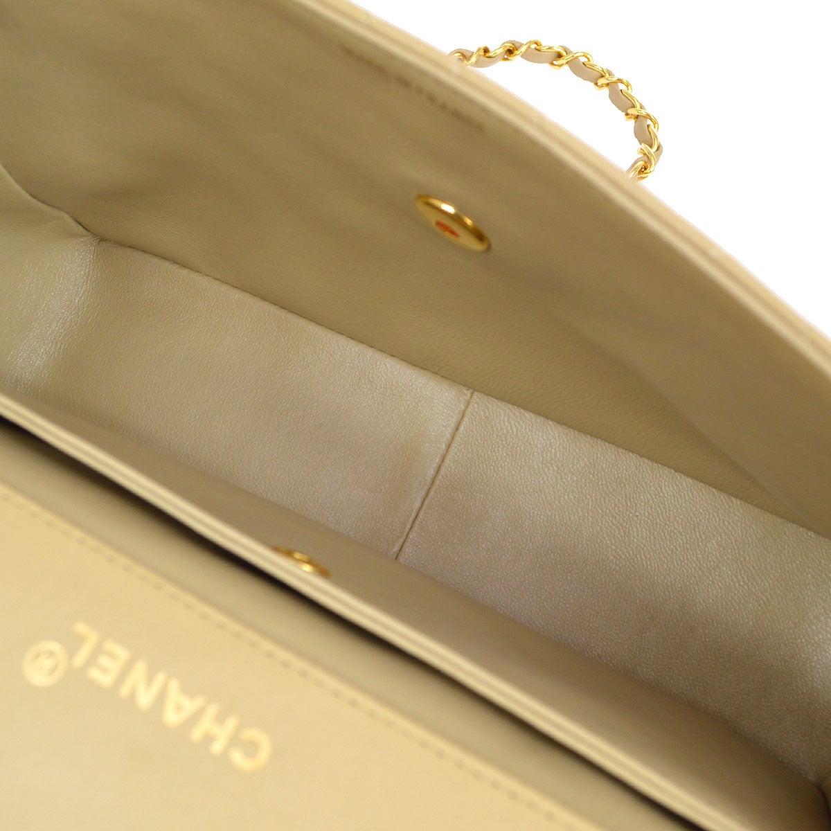 CHANEL 1989-1991 Round Border Flap Large & Pouch Set Beige Lambskin