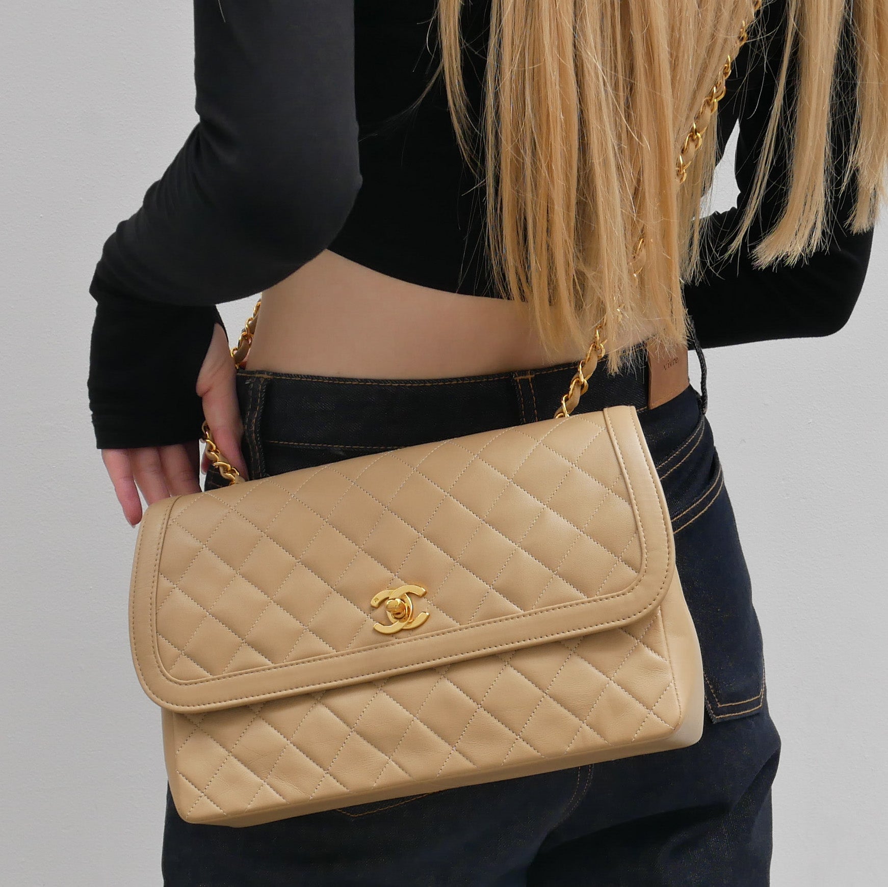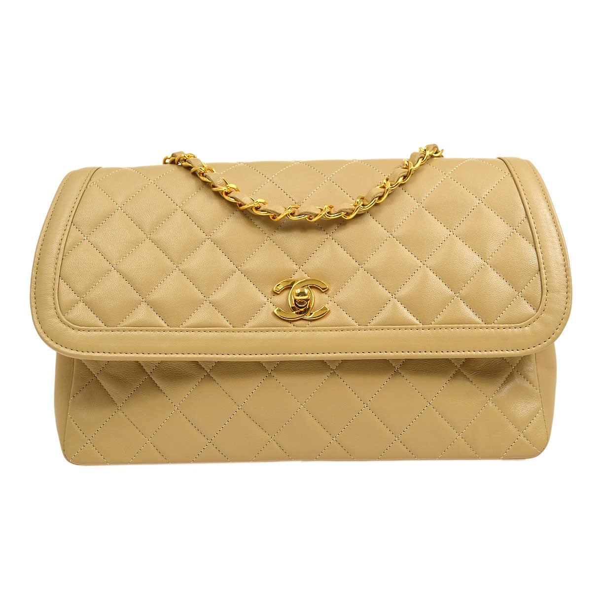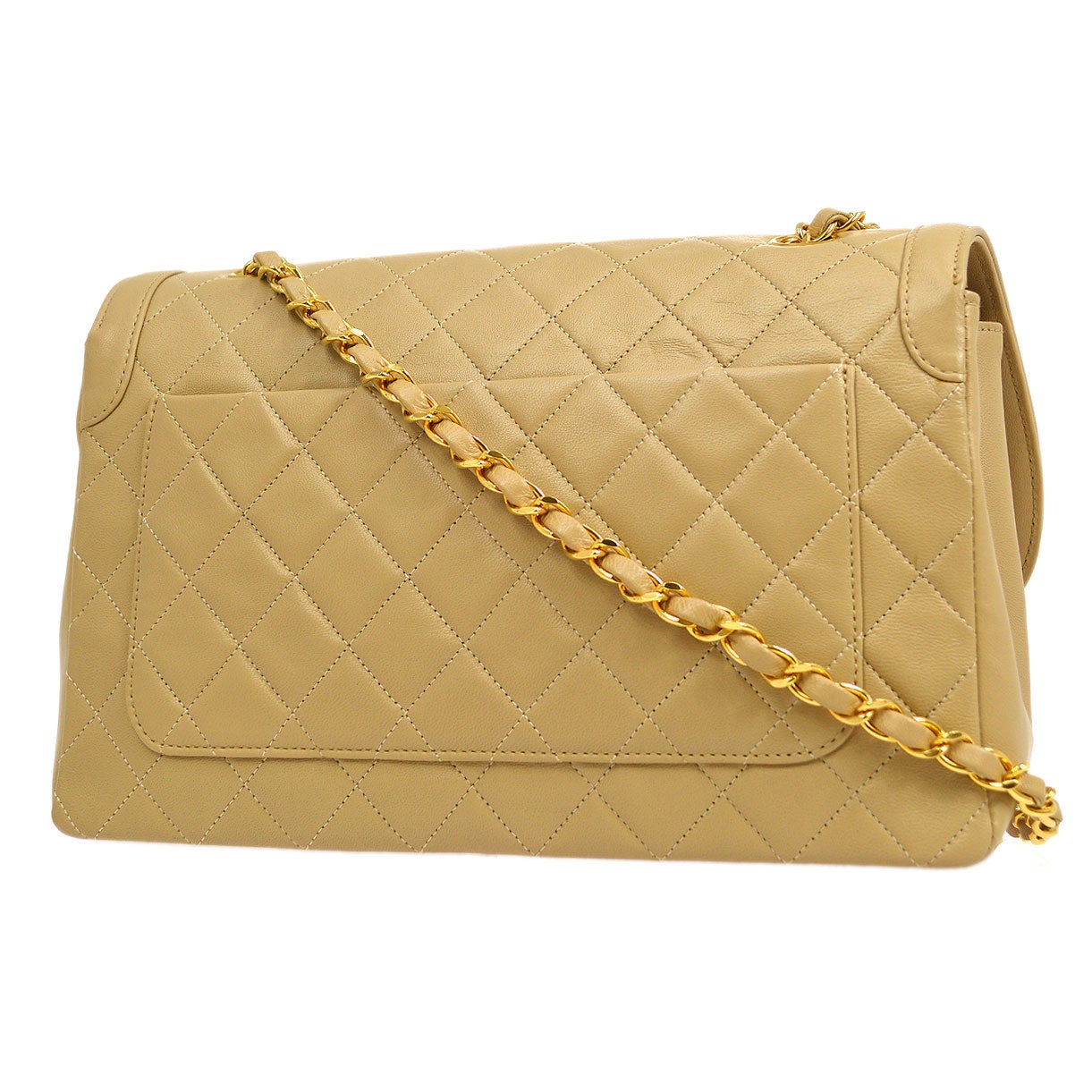 CHANEL 1989-1991 Round Border Flap Large & Pouch Set Beige Lambskin