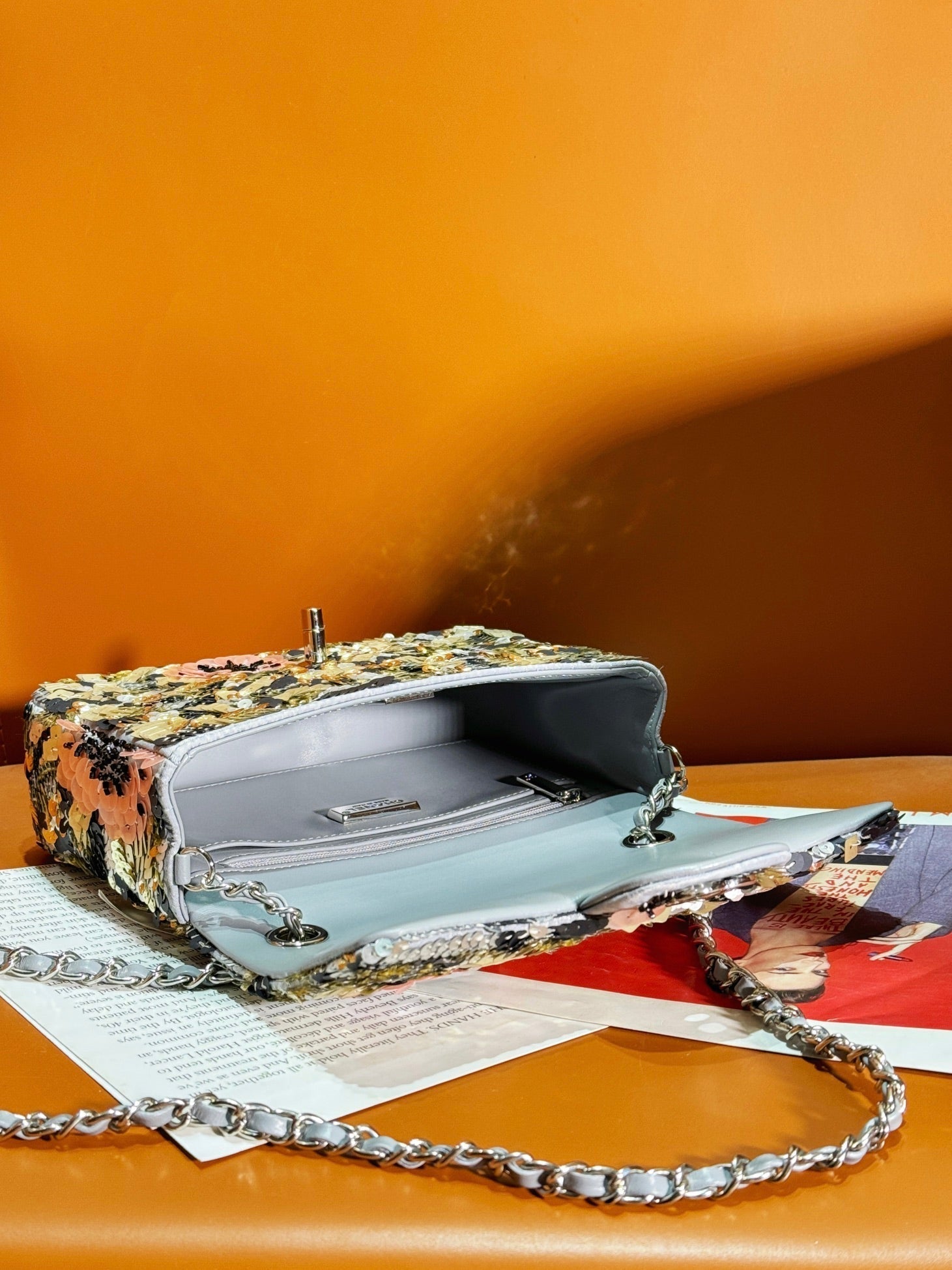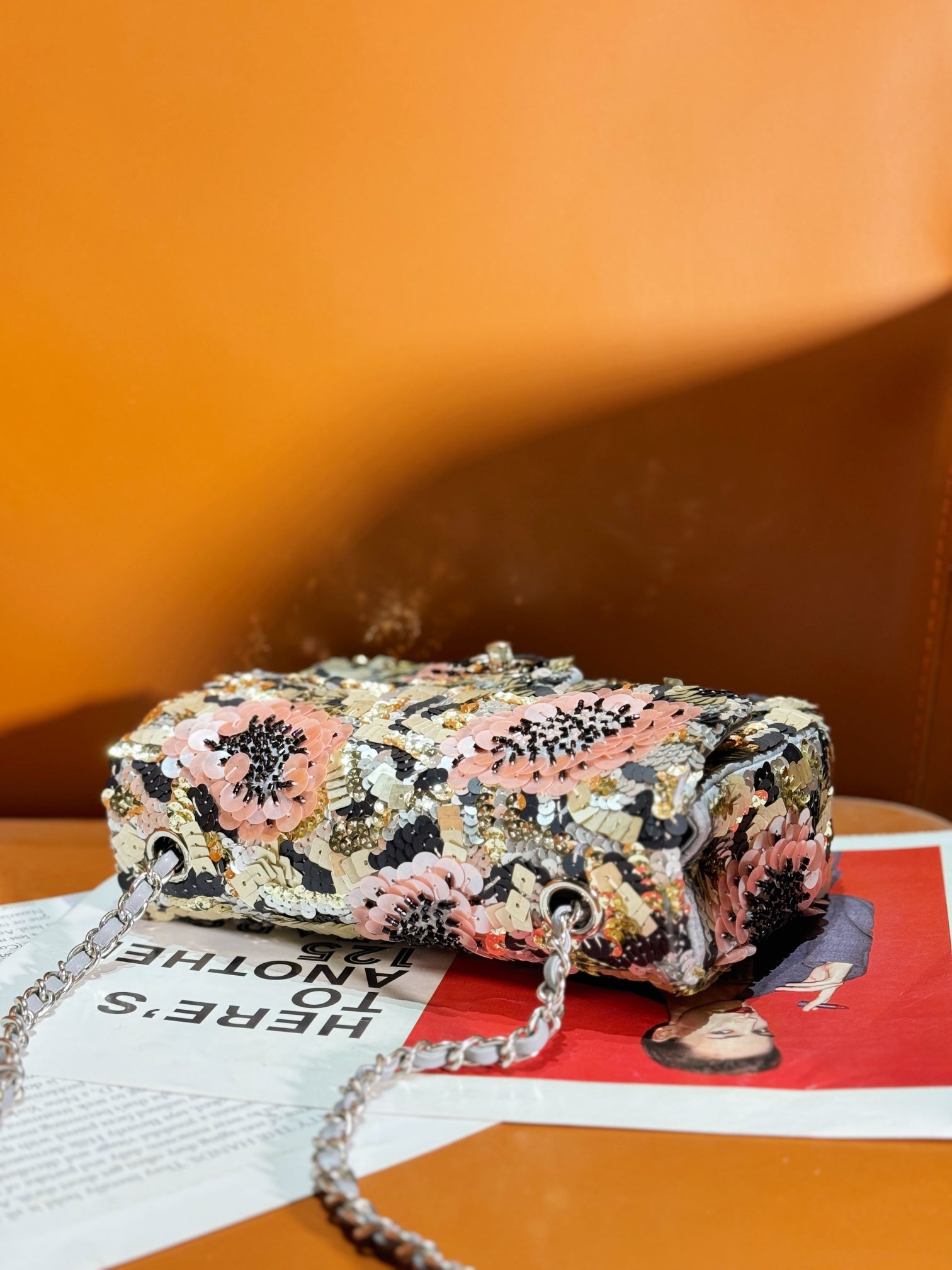 CHANEL 24S Flap Bag 20cm Multicolor Sequin Pink Flower Pearl Caflskin