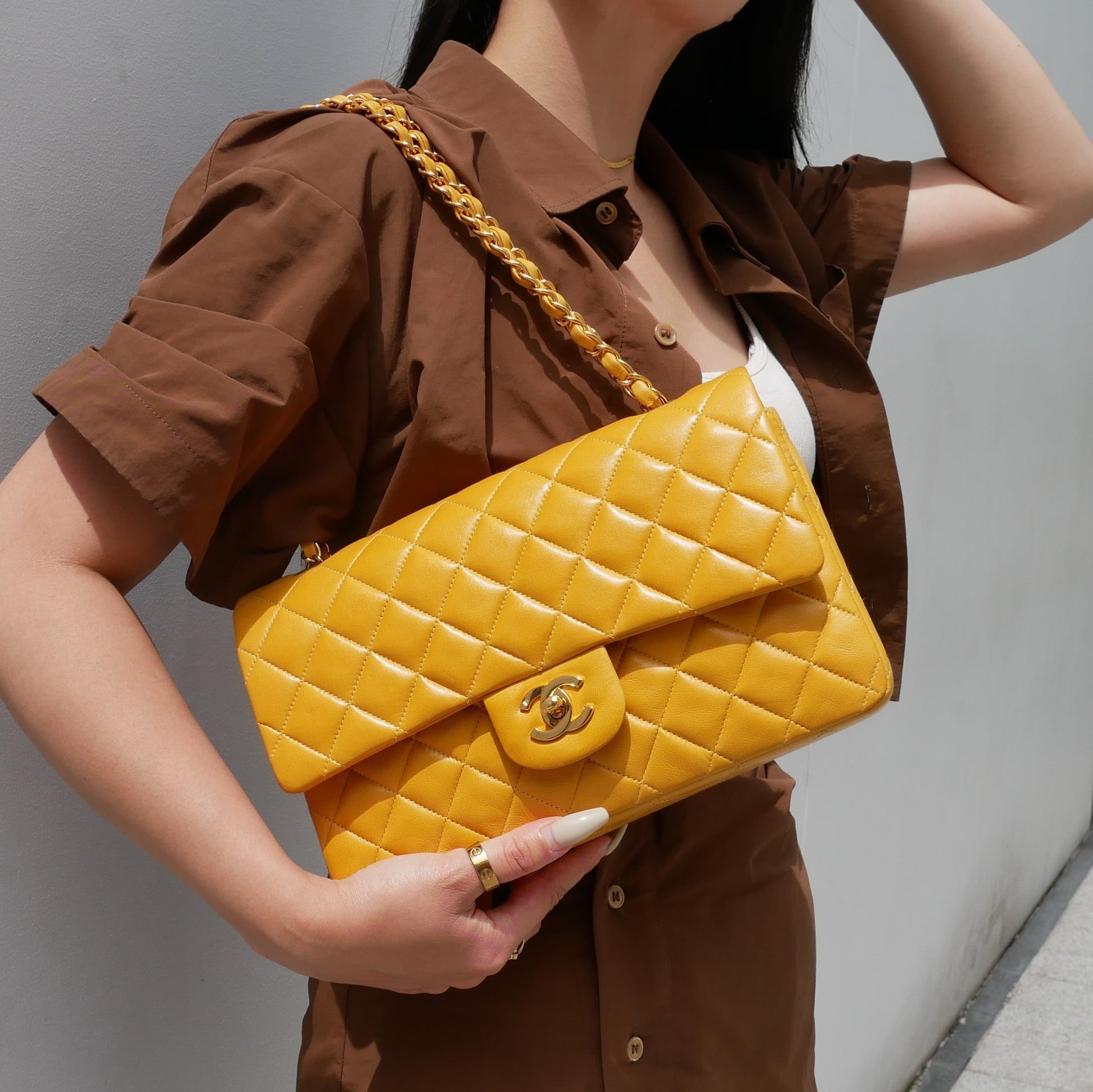 CHANEL Classic Double Flap Medium Shoulder Bag Yellow Lambskin