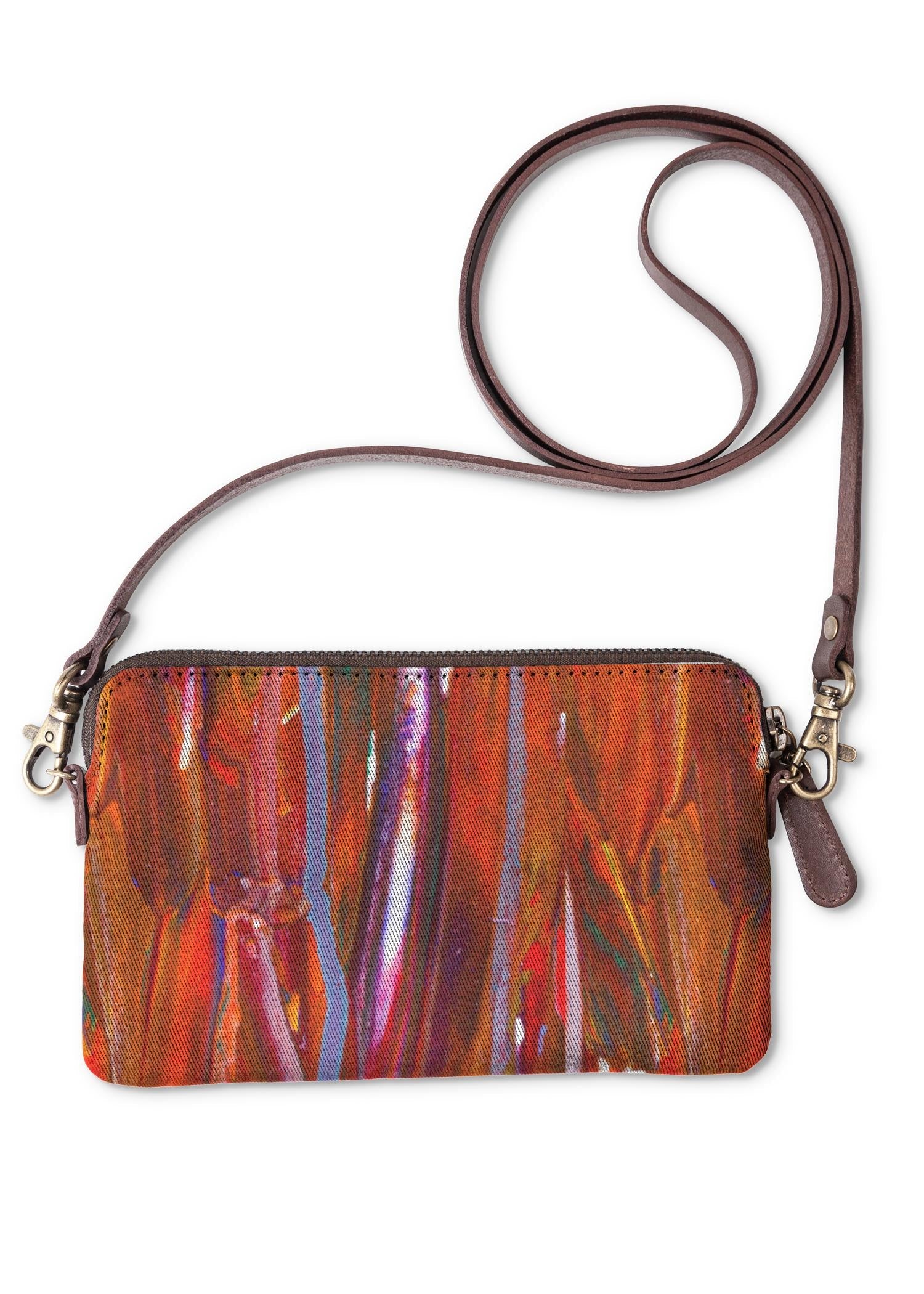Make a statement with this clutch. Crafted from genuine leather and canvas and adorned with original art by independent designers.
