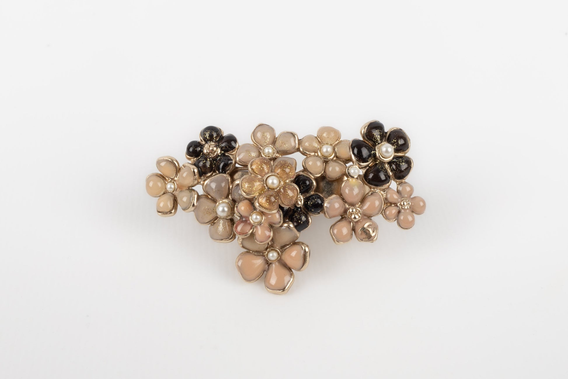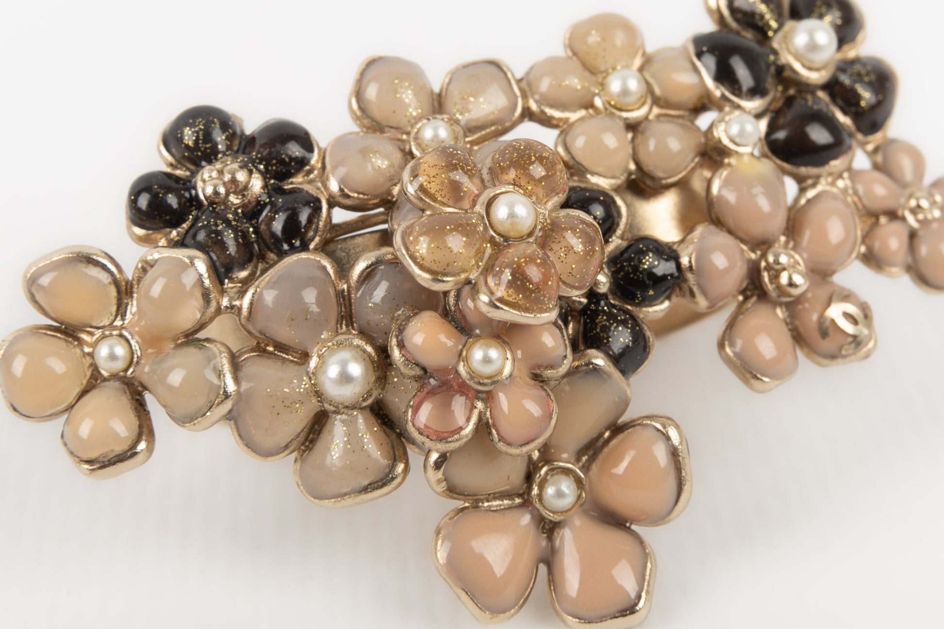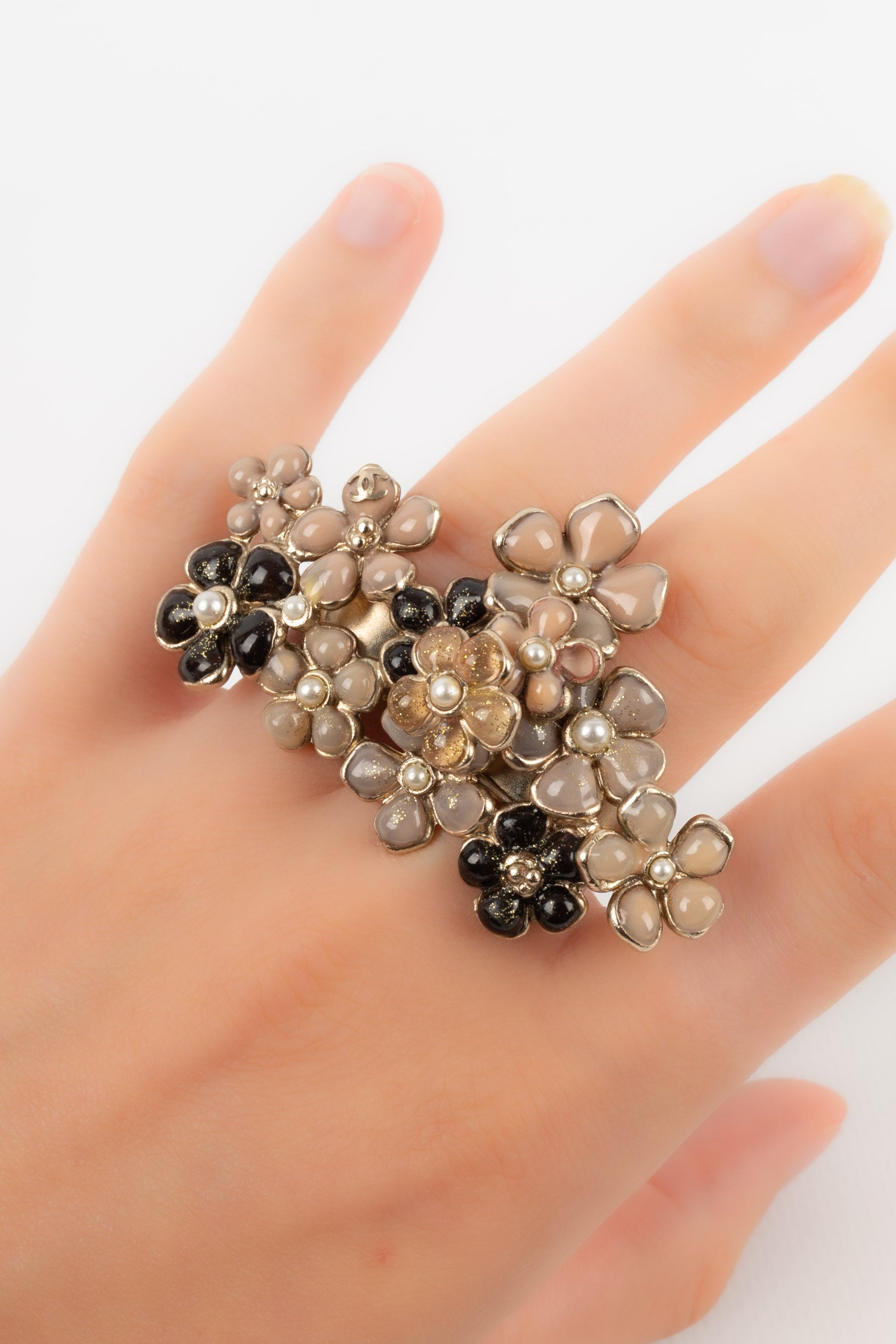 CHANEL - Bague en mtal dor dcor de fleur en rsine dans les tons de beige et marron. Bijou non sign issu des ventes prives.