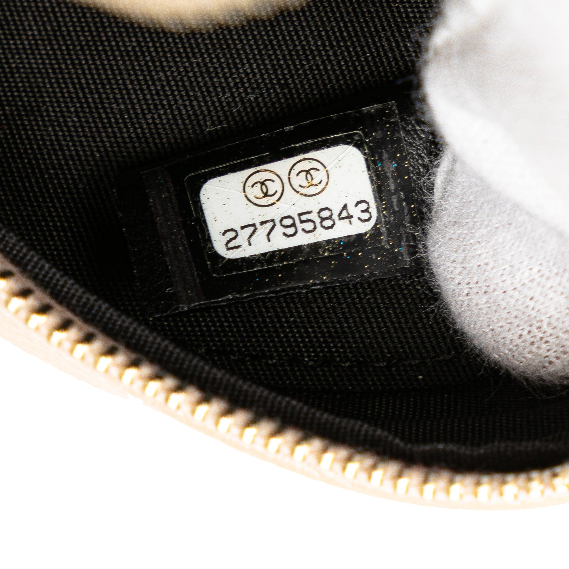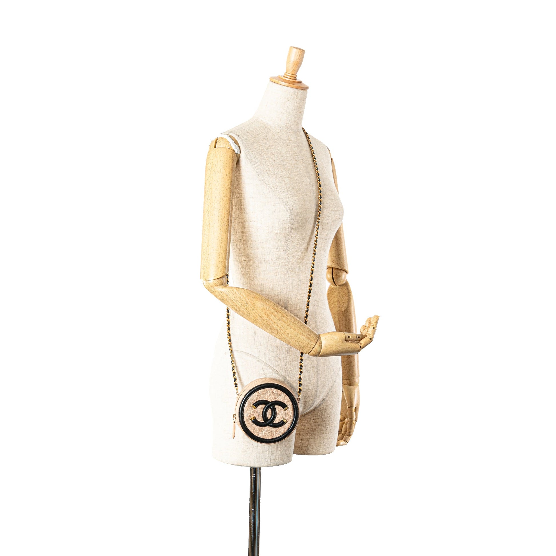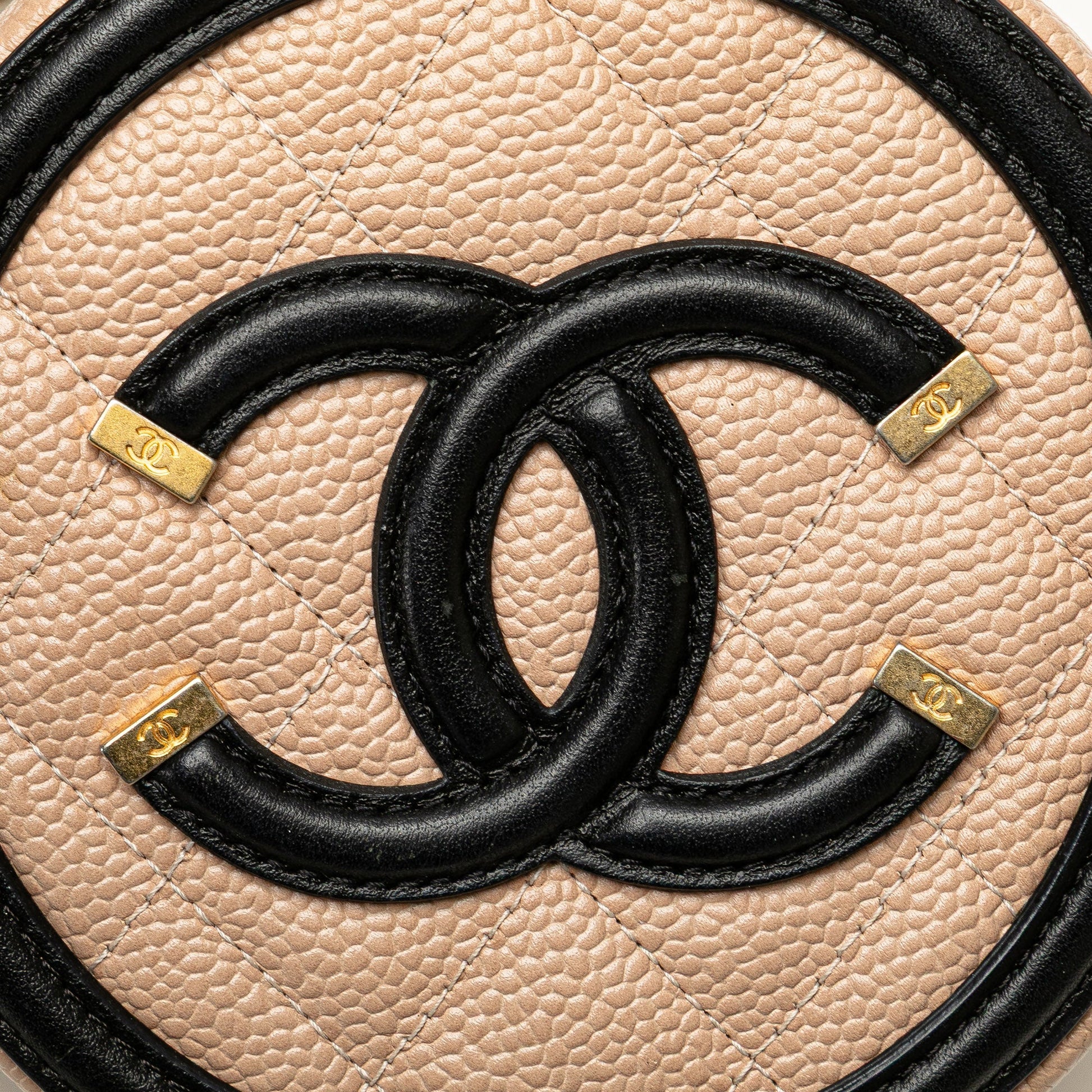 Product Details: Beige Chanel Caviar CC Filigree Round Crossbody. The CC Filigree features a quilted caviar leather body, a leather woven chain link strap, a top zip closure, and interior slip pockets. 4.7" L x 4.7" W x 2.2" D. Serial number 27795843.
