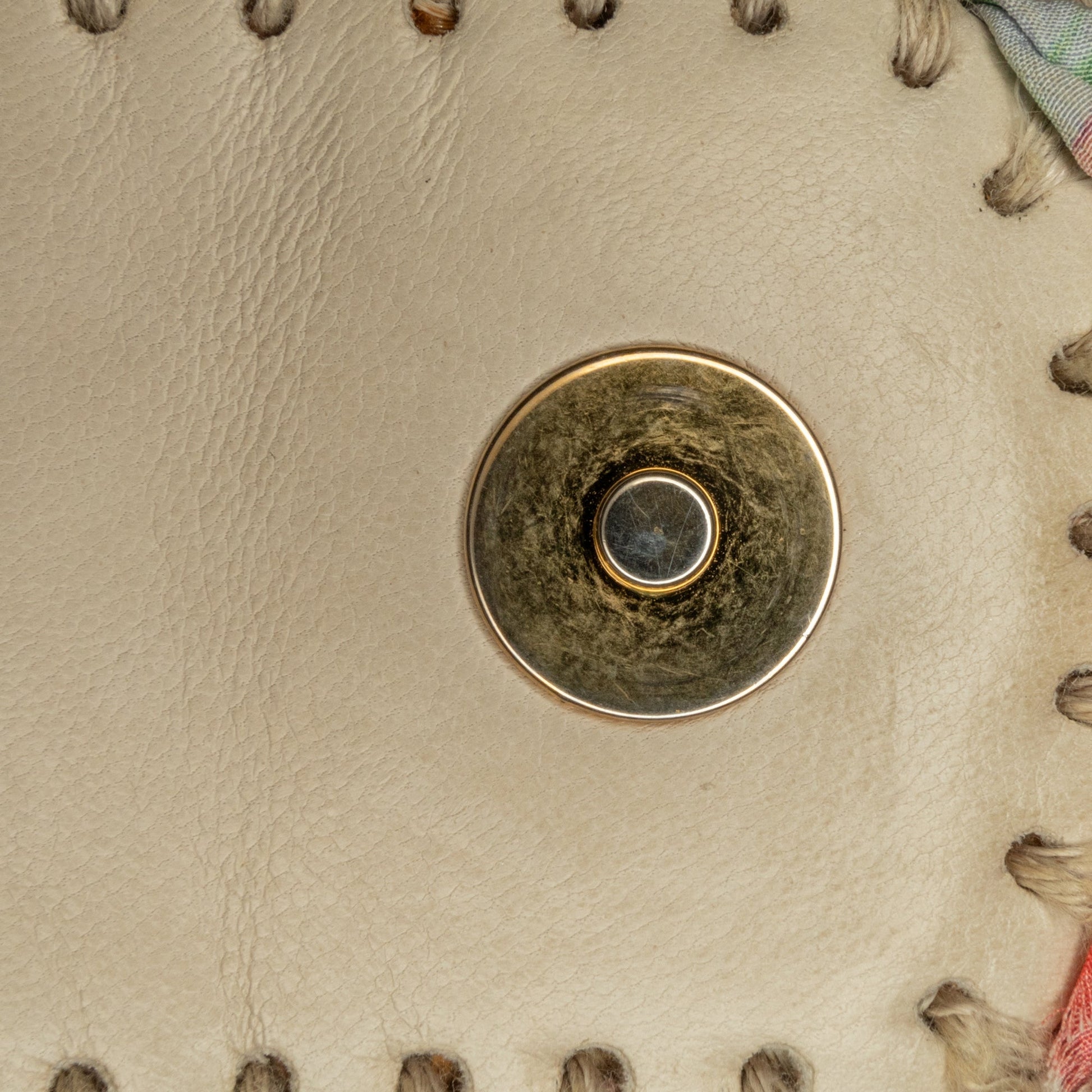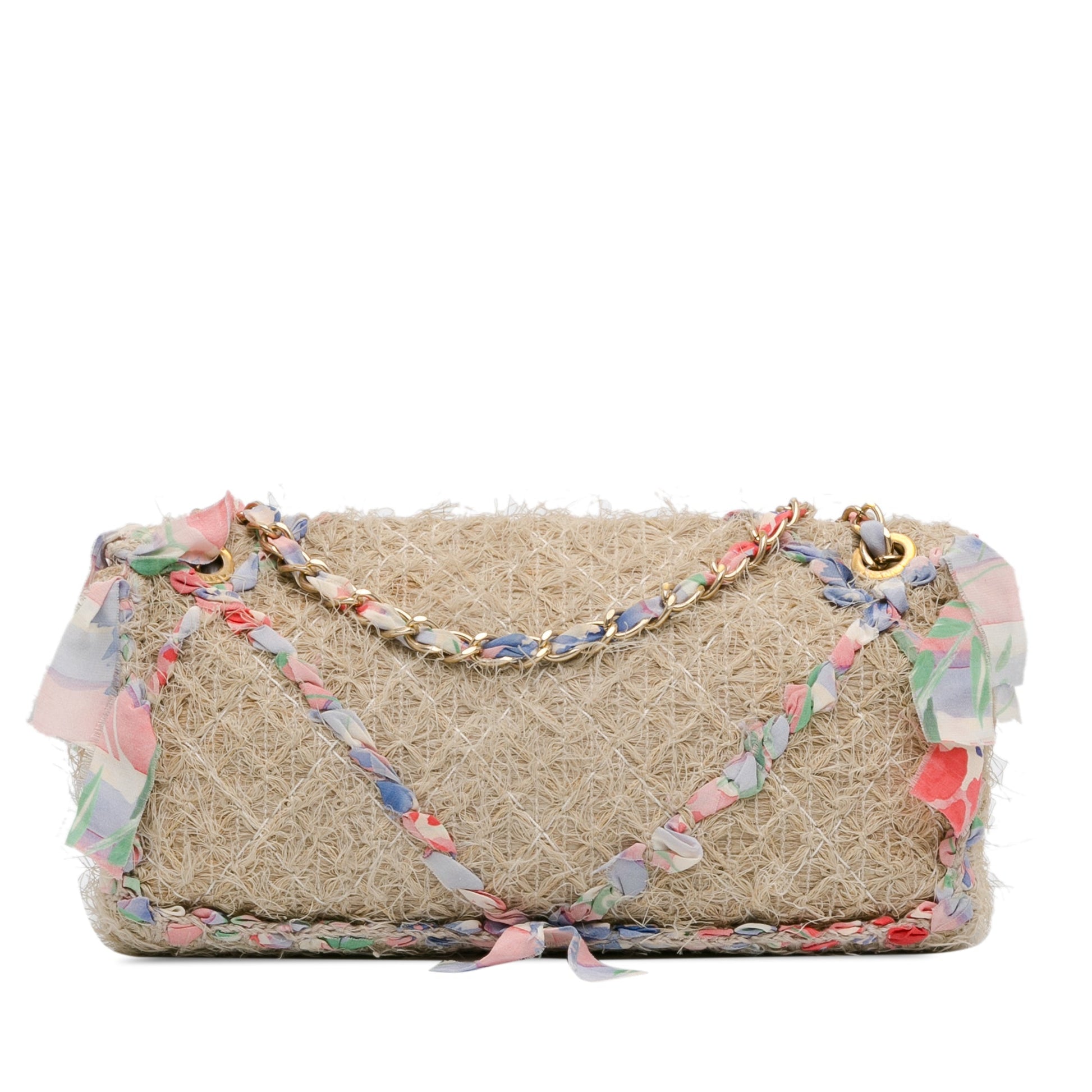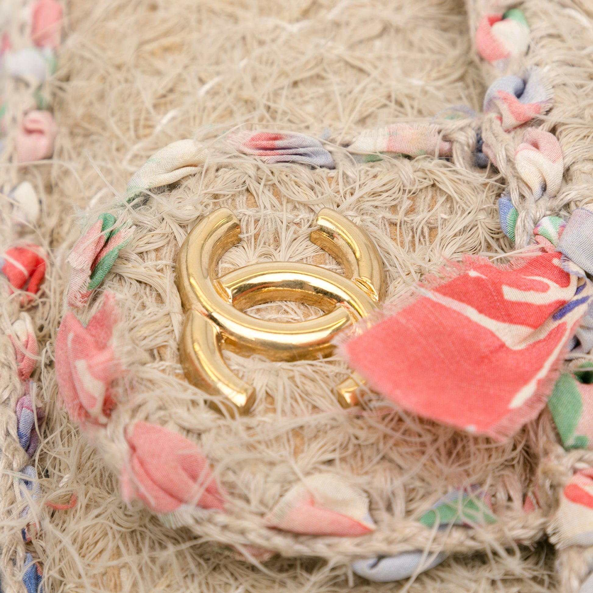 Product Details: Beige Chanel CC Straw Country Flap Shoulder Bag. This crossbody features a straw body with multicolor ribbon details, a fabric-woven chain strap, a flap with magnetic button closure, and an interior zip pocket. 6.3" L x 12.2" W x 2.8" D, 7.9" drop. Serial number 13548533.