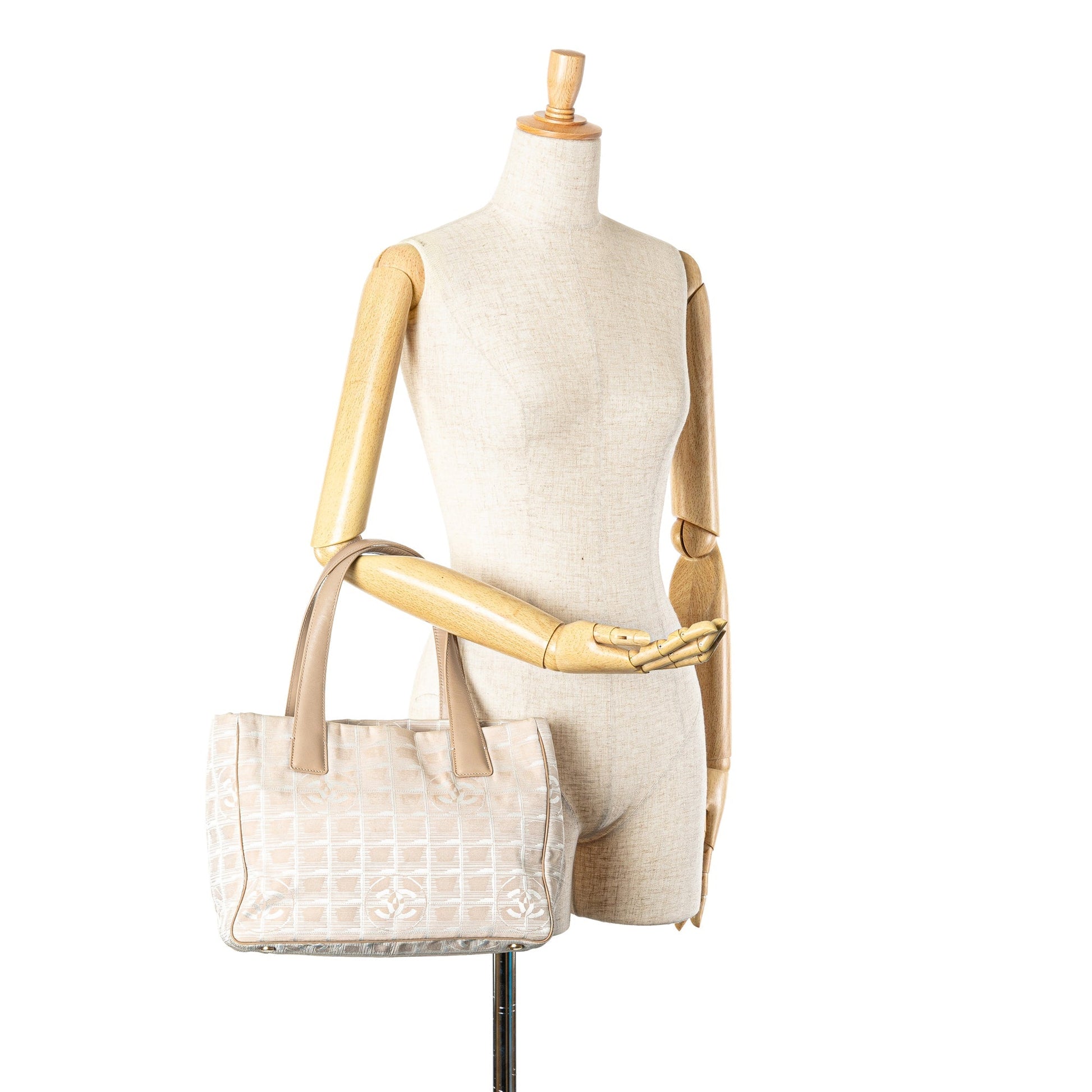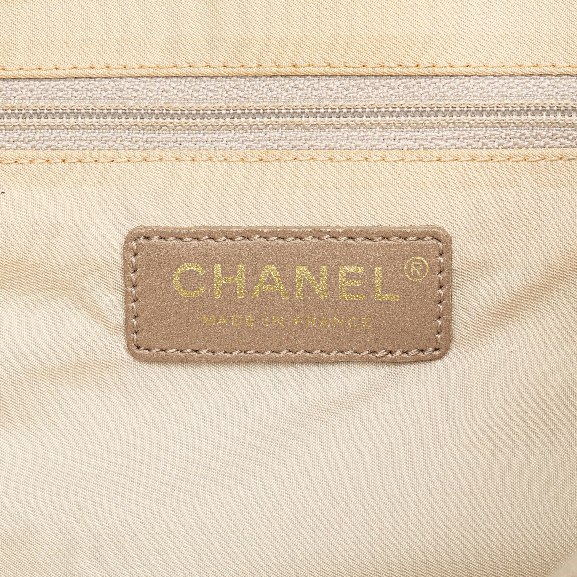 Product Details: Beige Chanel Nylon New Travel Line Tote. This tote bag features a nylon body with leather trim, flat leather straps, an open top, and interior zip pockets. 8.3" L x 114.2" W x 4.7" D. Serial number 8724811.