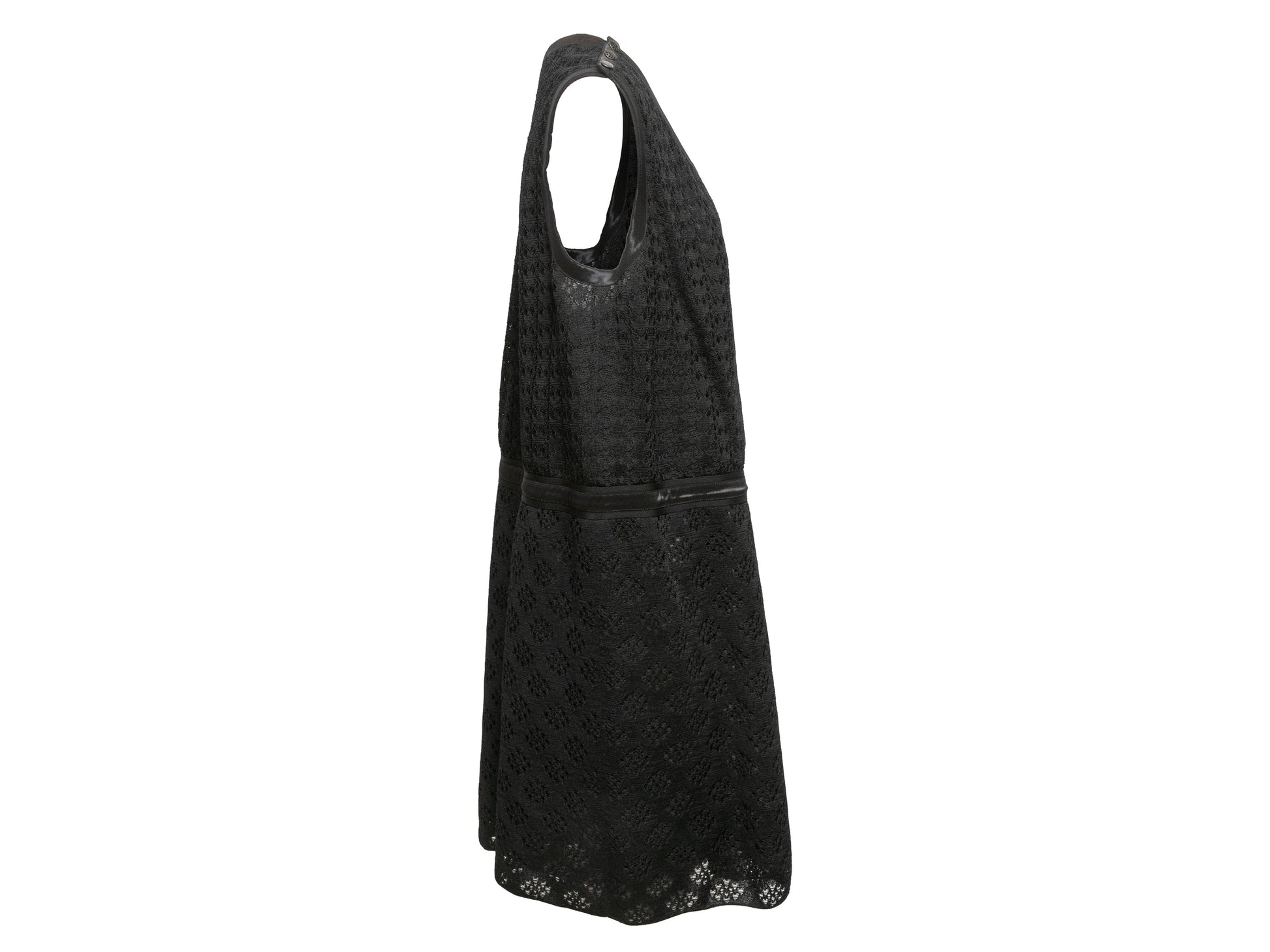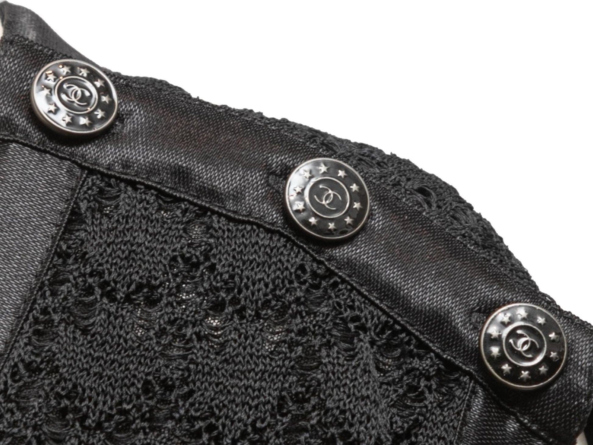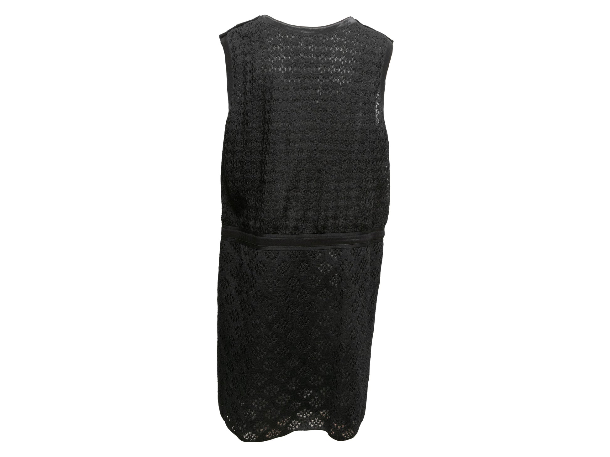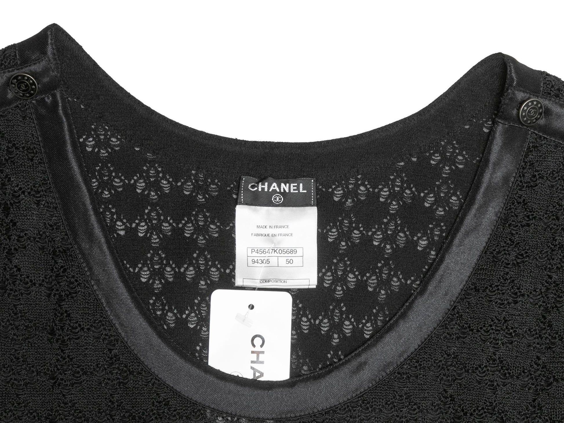 Product Details:Black sleeveless semi-sheer dress by Chanel. Circa 2013. Crew neck. Button closures at shoulder. 39" bust, 40" waist, 38" length, 17" shoulder width.