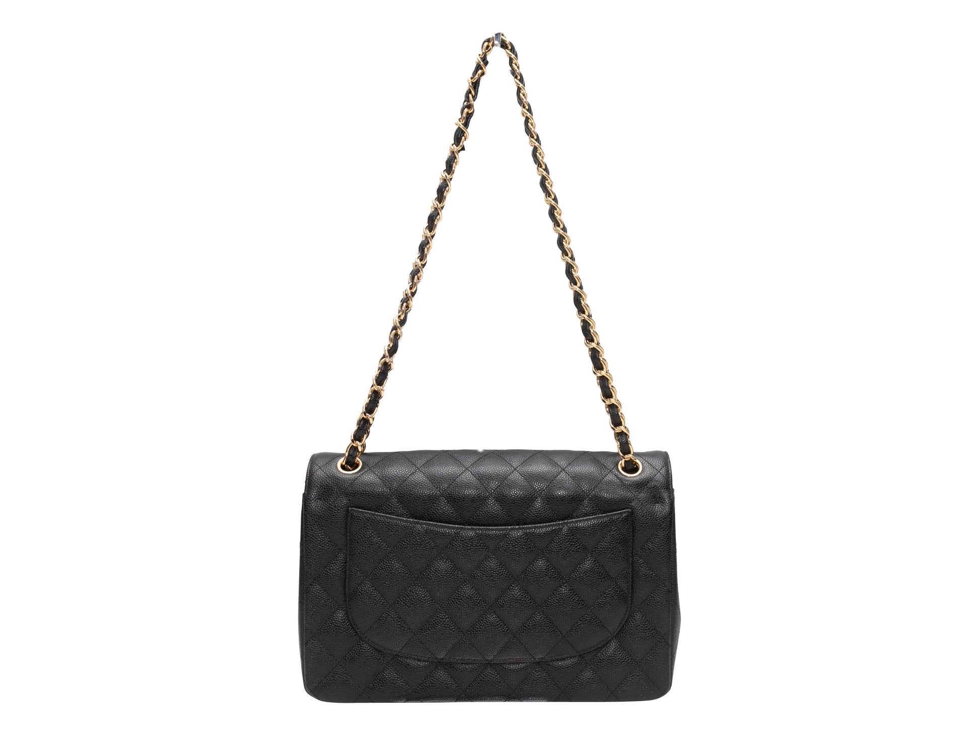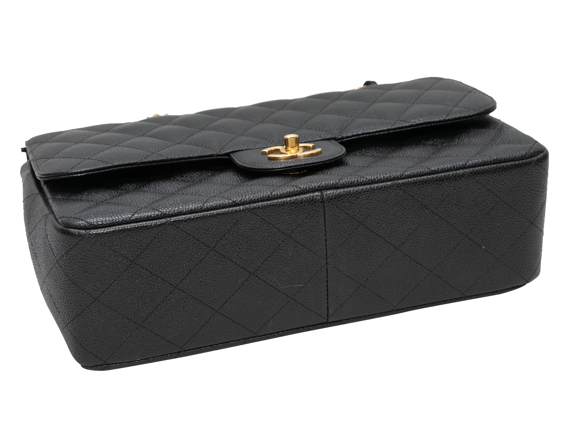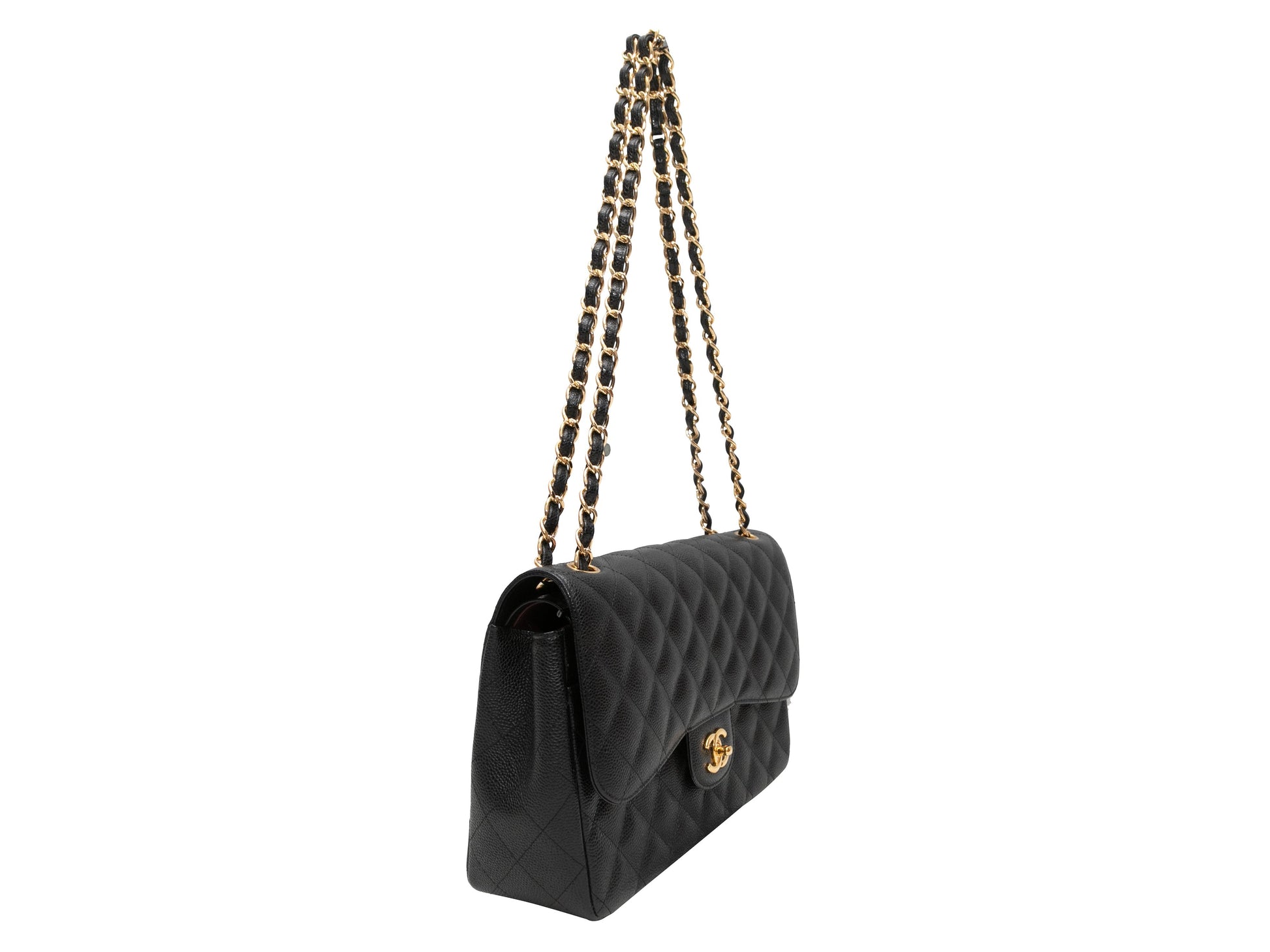 Product Details: Black Chanel 2017 Classic Jumbo Caviar Double Flap Bag. The Classic Jumbo Double Flap Bag features a caviar leather body, gold-tone hardware, dual chain-link and leather shoulder strap, an exterior back pocket, and a front CC turn-lock flap closure. 12" L x 8" H x 3.75" D, 13.25" handle drop, 23" shoulder strap drop. Serial number 23098703.