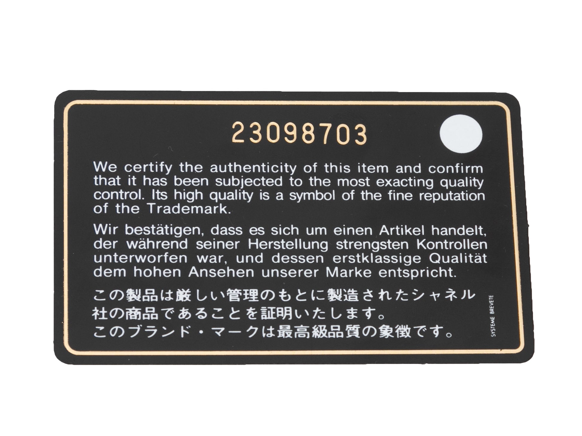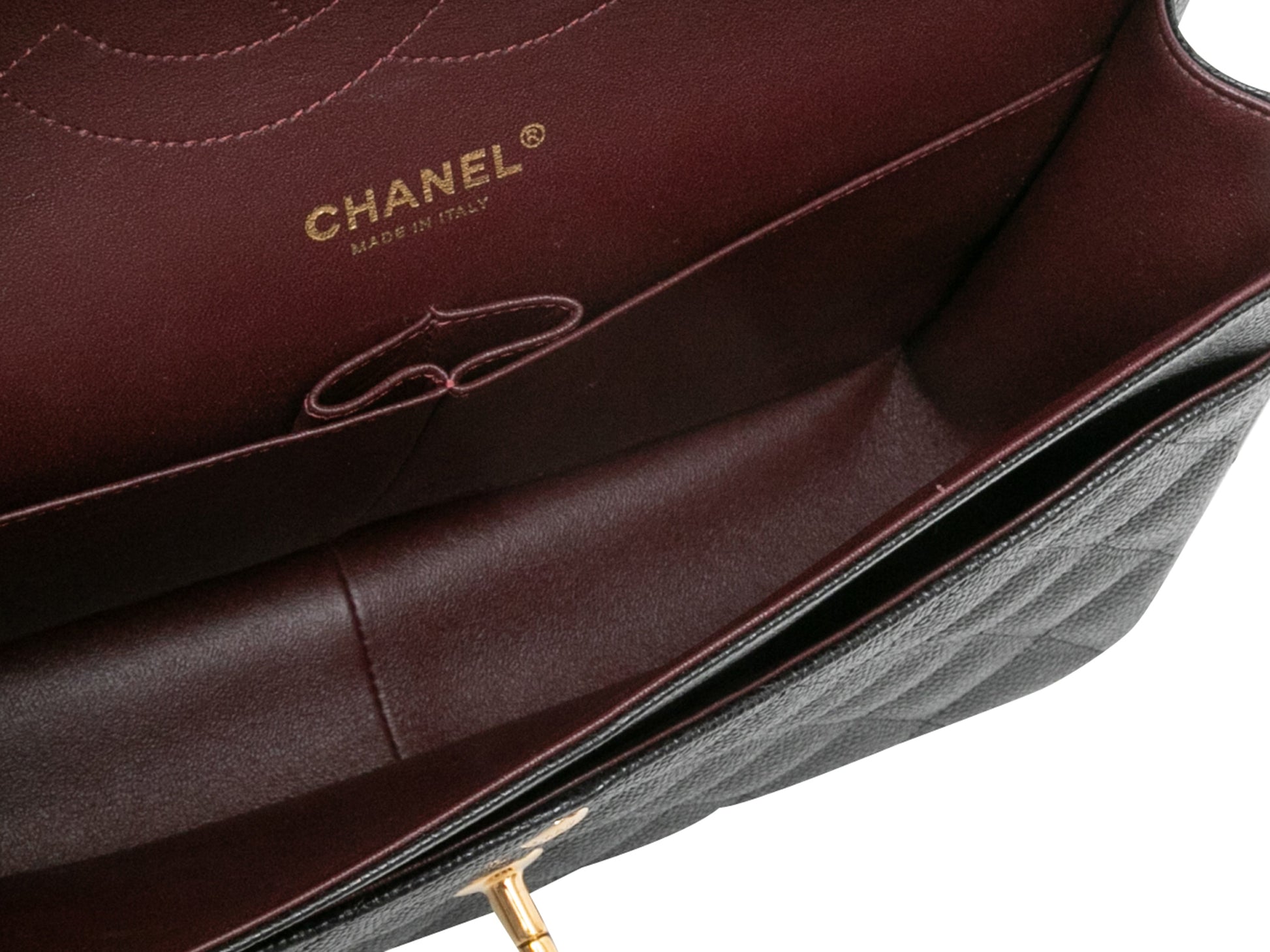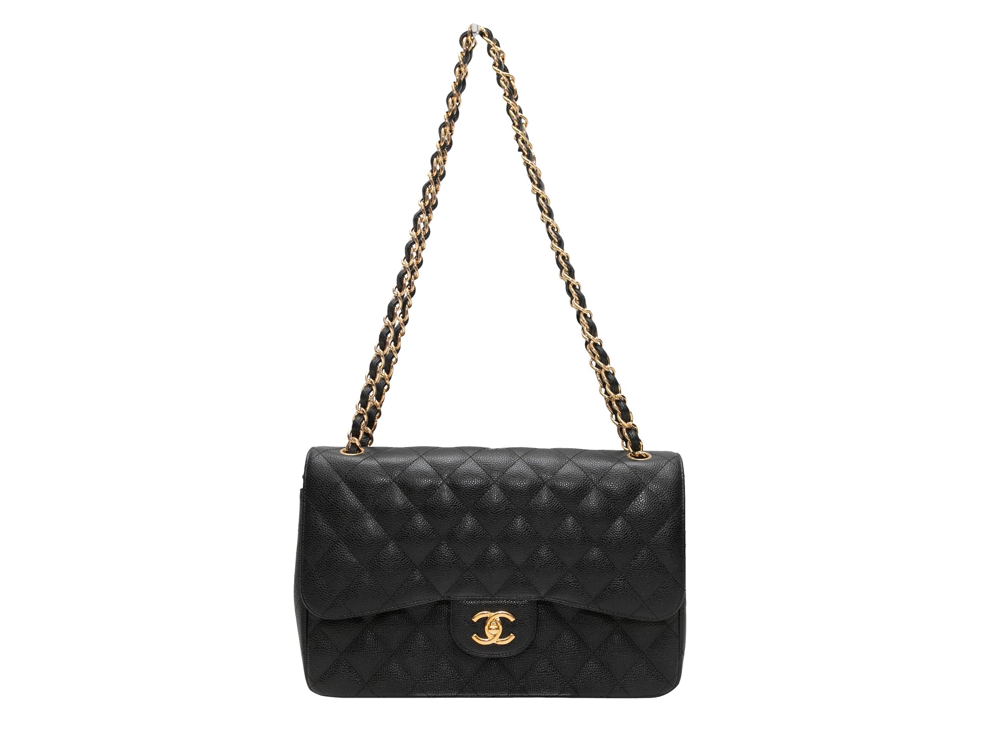 Product Details: Black Chanel 2017 Classic Jumbo Caviar Double Flap Bag. The Classic Jumbo Double Flap Bag features a caviar leather body, gold-tone hardware, dual chain-link and leather shoulder strap, an exterior back pocket, and a front CC turn-lock flap closure. 12" L x 8" H x 3.75" D, 13.25" handle drop, 23" shoulder strap drop. Serial number 23098703.