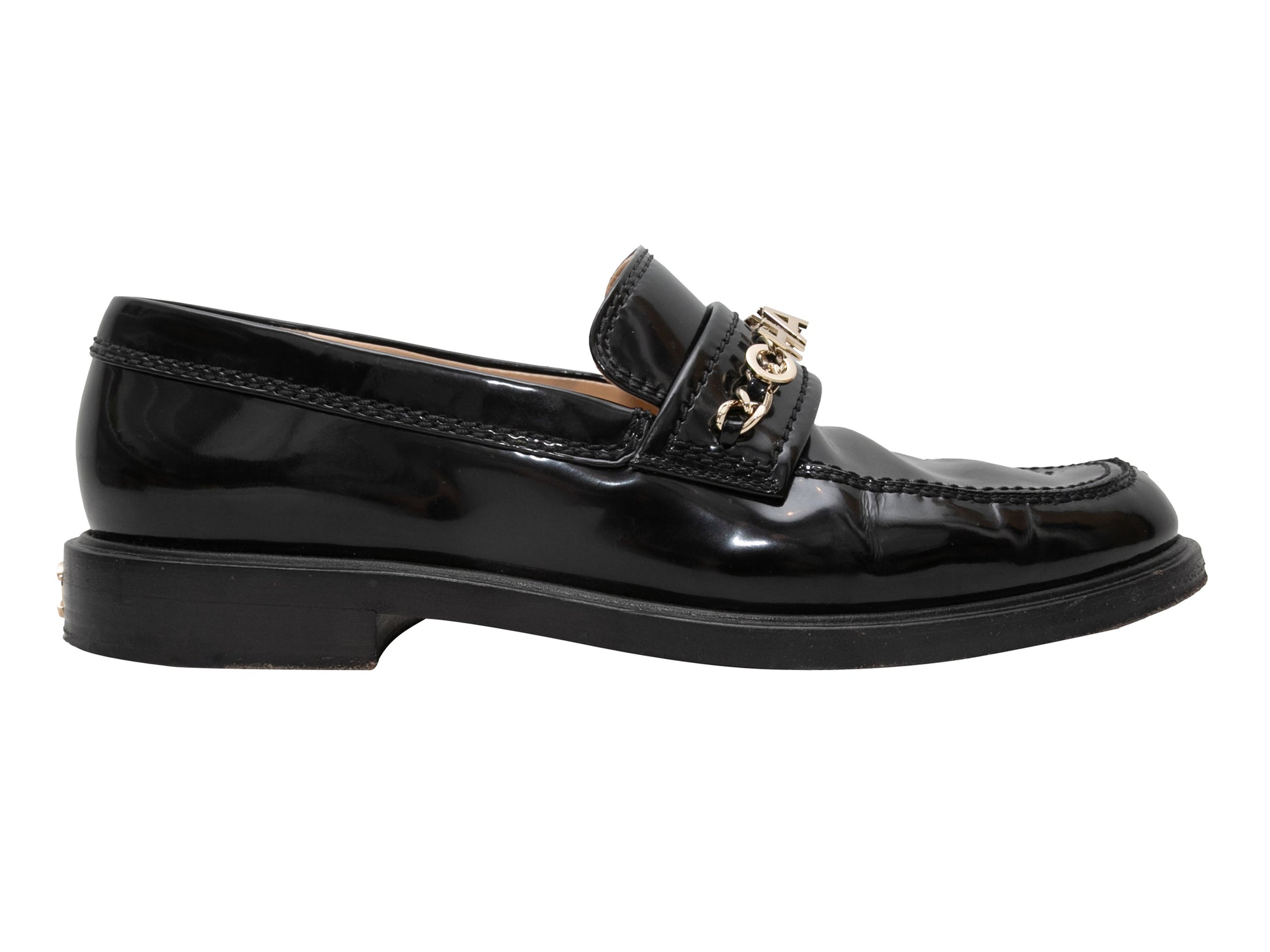 Product Details: Black patent leather loafers by Chanel. Circa 2021. Gold-tone metal spellout detailing at tops. 1.5" heel height.