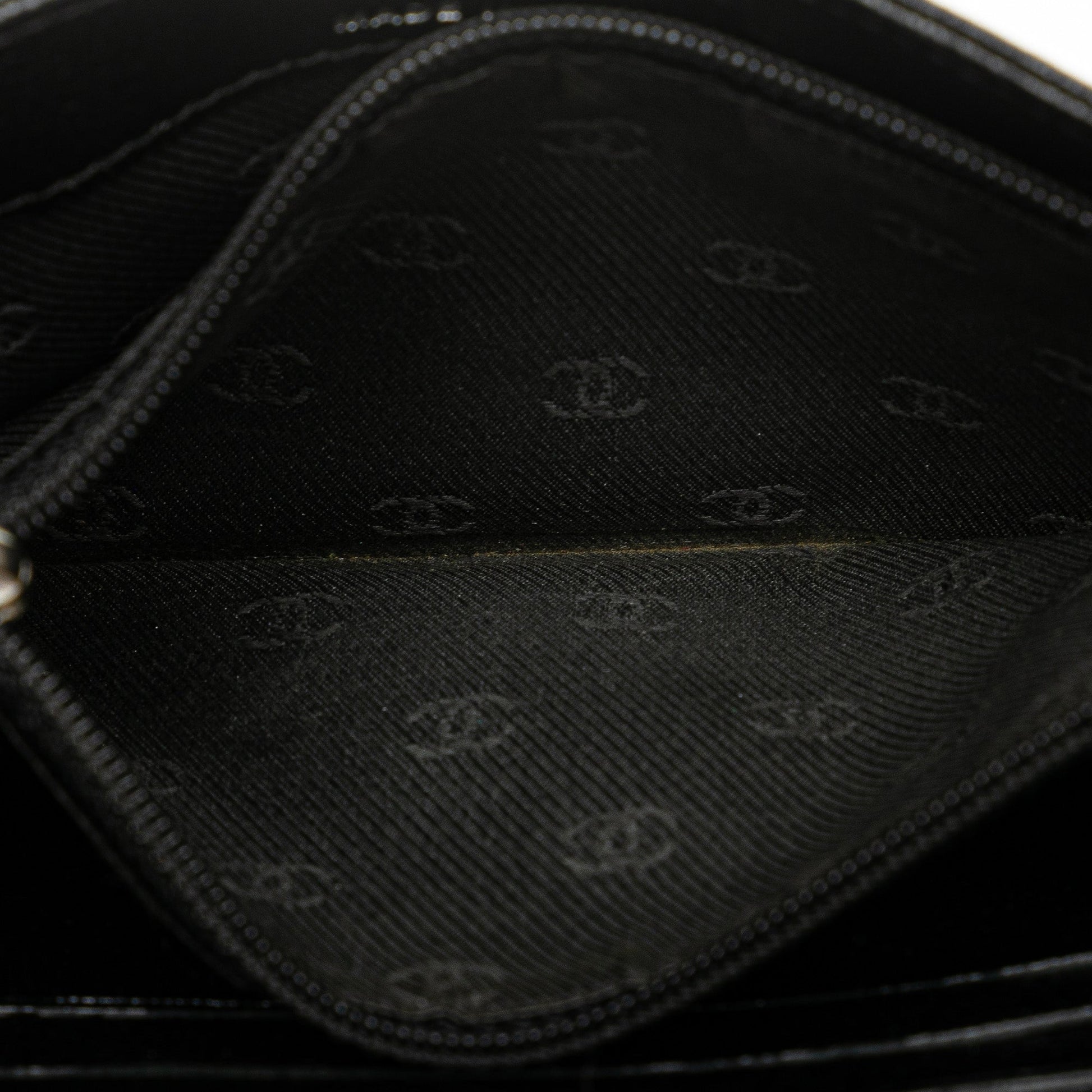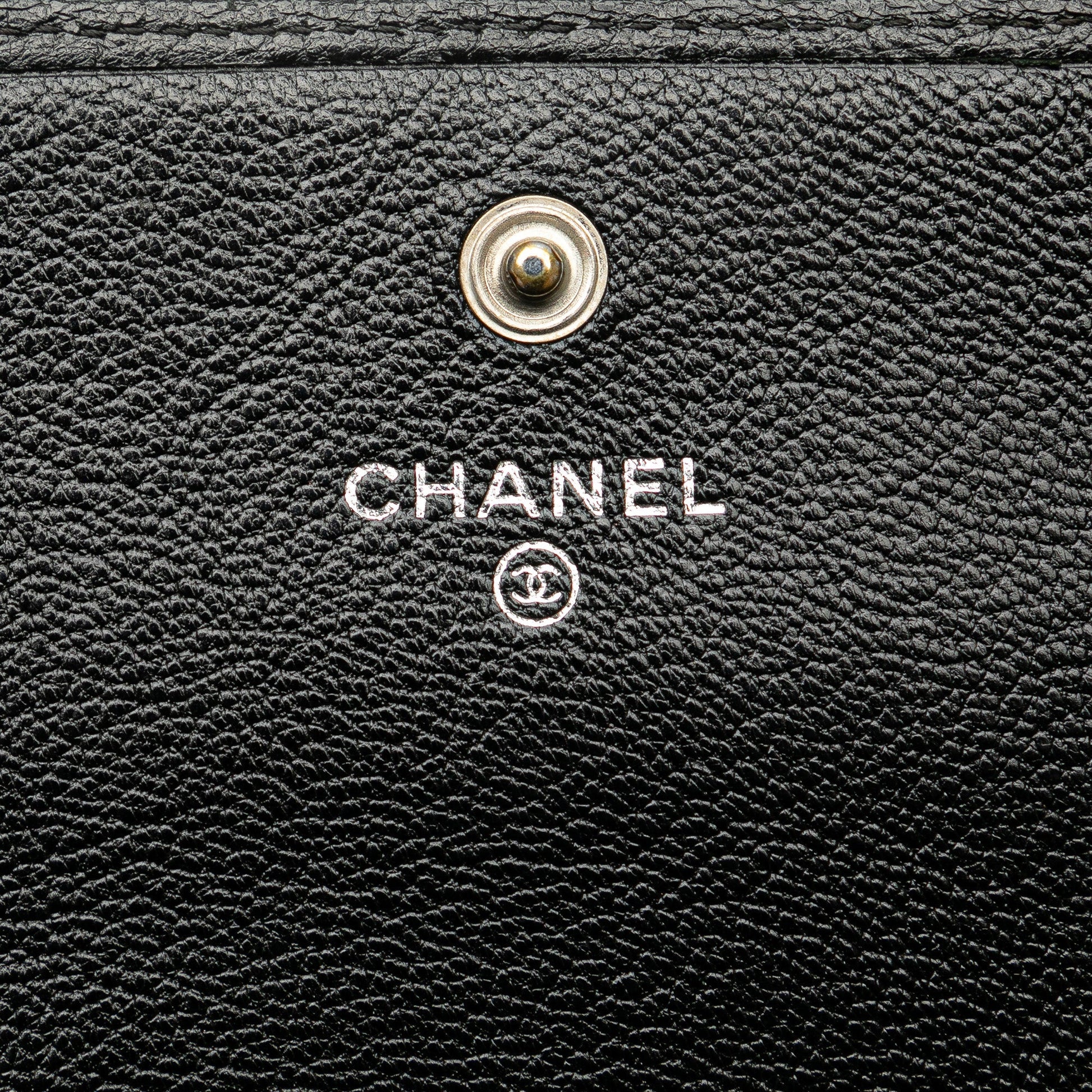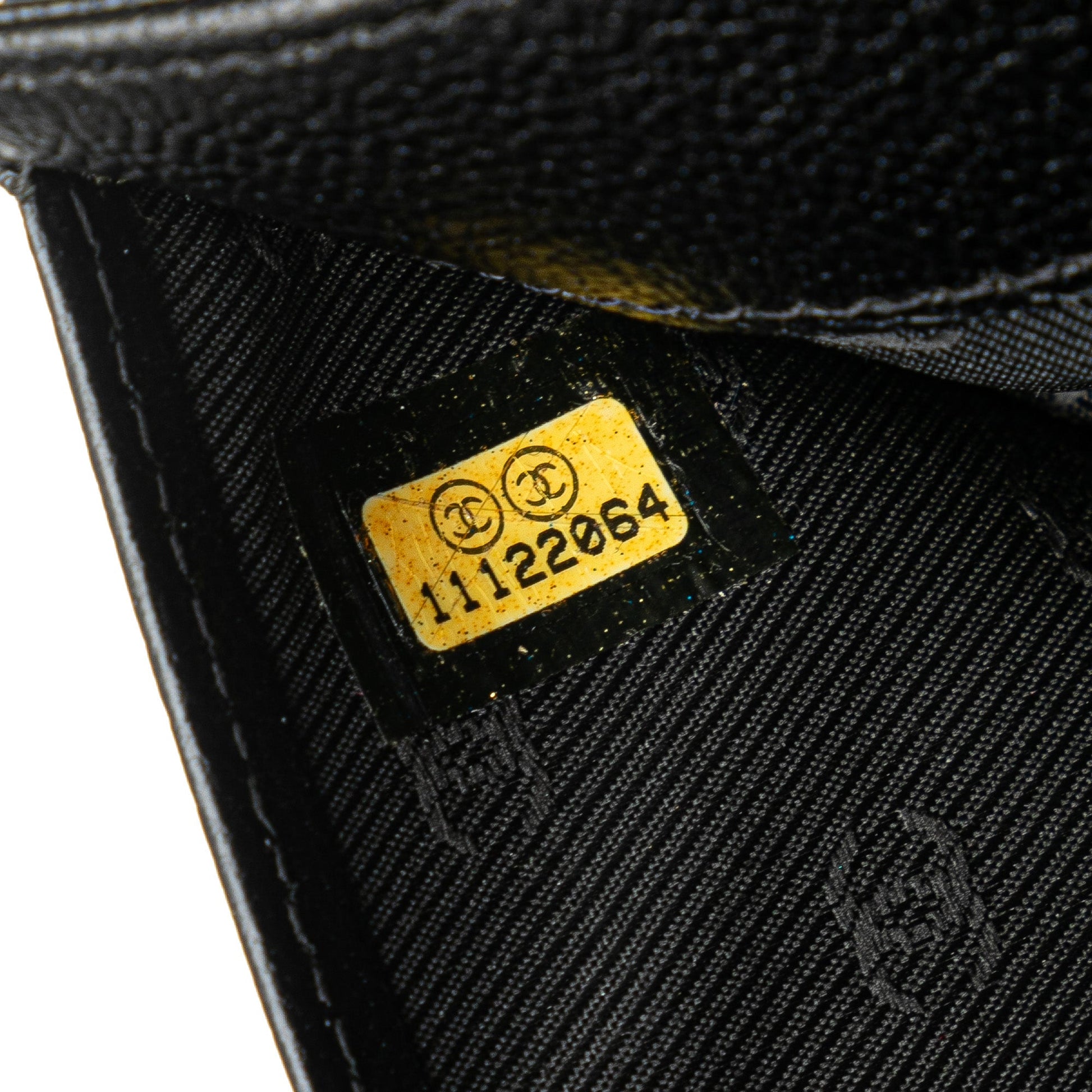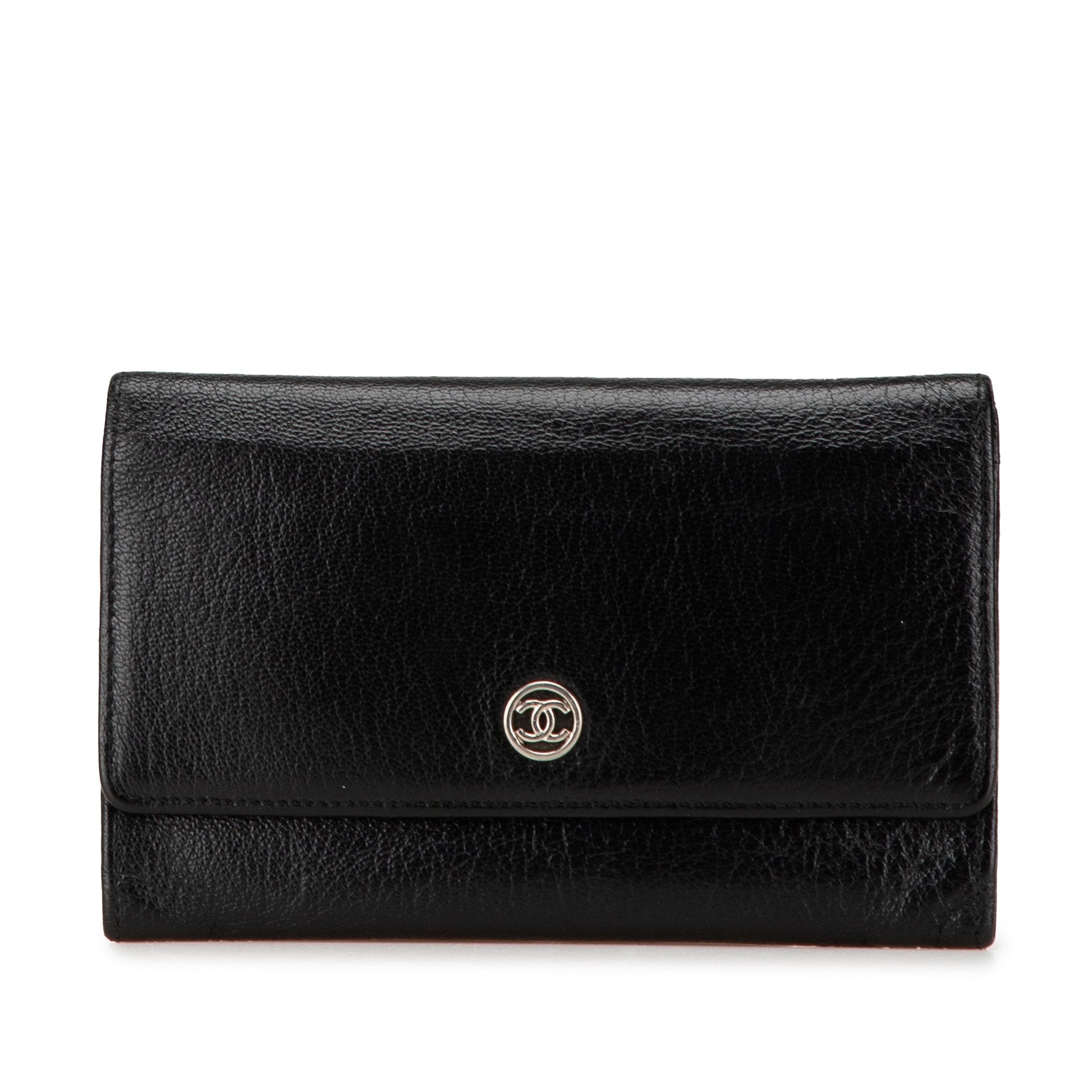 Product Details: Black Chanel Calfskin CC Compact Wallet. This wallet features a leather body, a flap with snap closure, and interior zip and slip pockets. 3.9" L x 6.1" W x 0.6" D. Serial number 11122064.