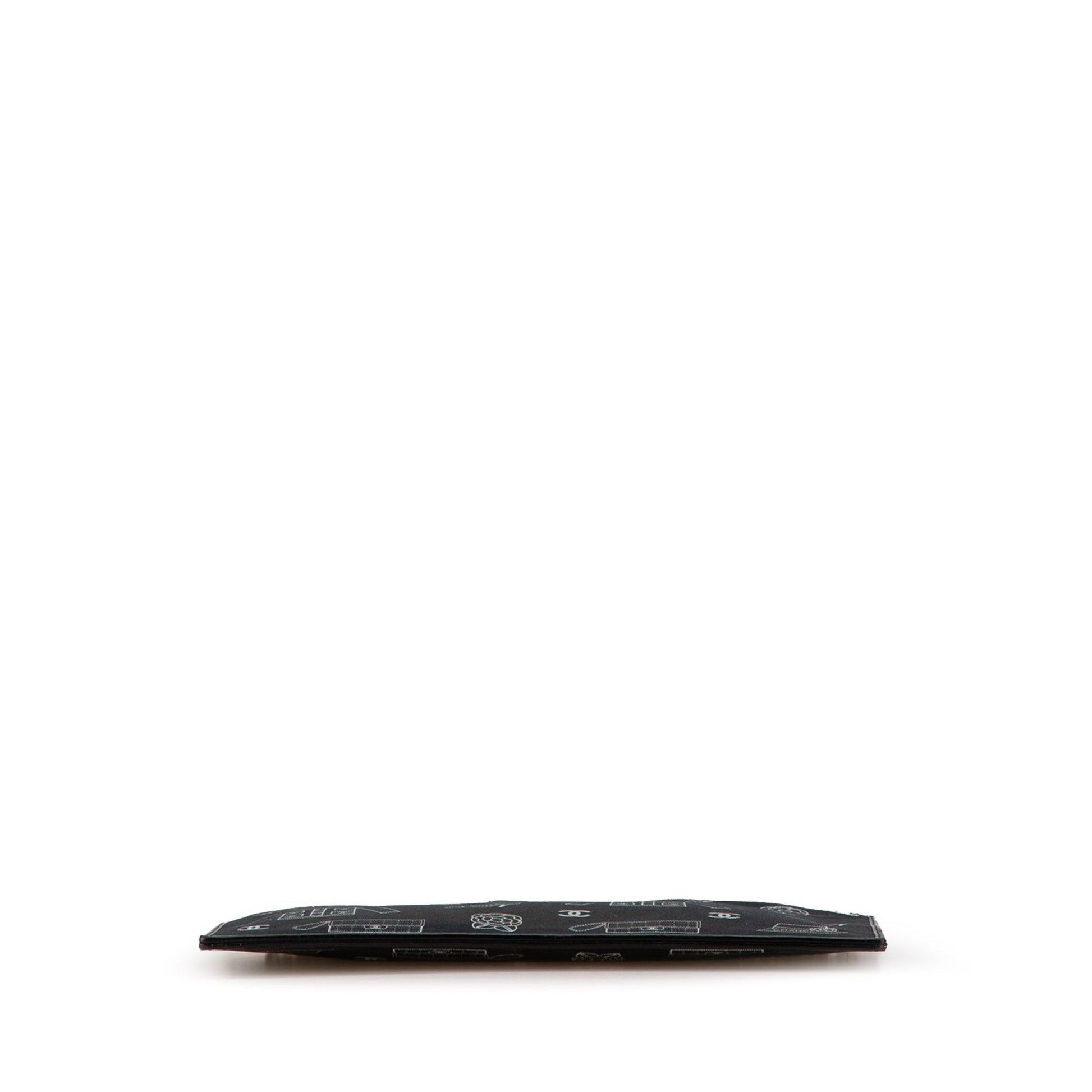 Product Details: Black Chanel Canvas Symbols Chain Pochette Shoulder Bag. This handbag features a printed canvas body, leather woven chain handle, and a top zip closure 5.5" L x 10.6" W x 2" D. Serial number 7797417.