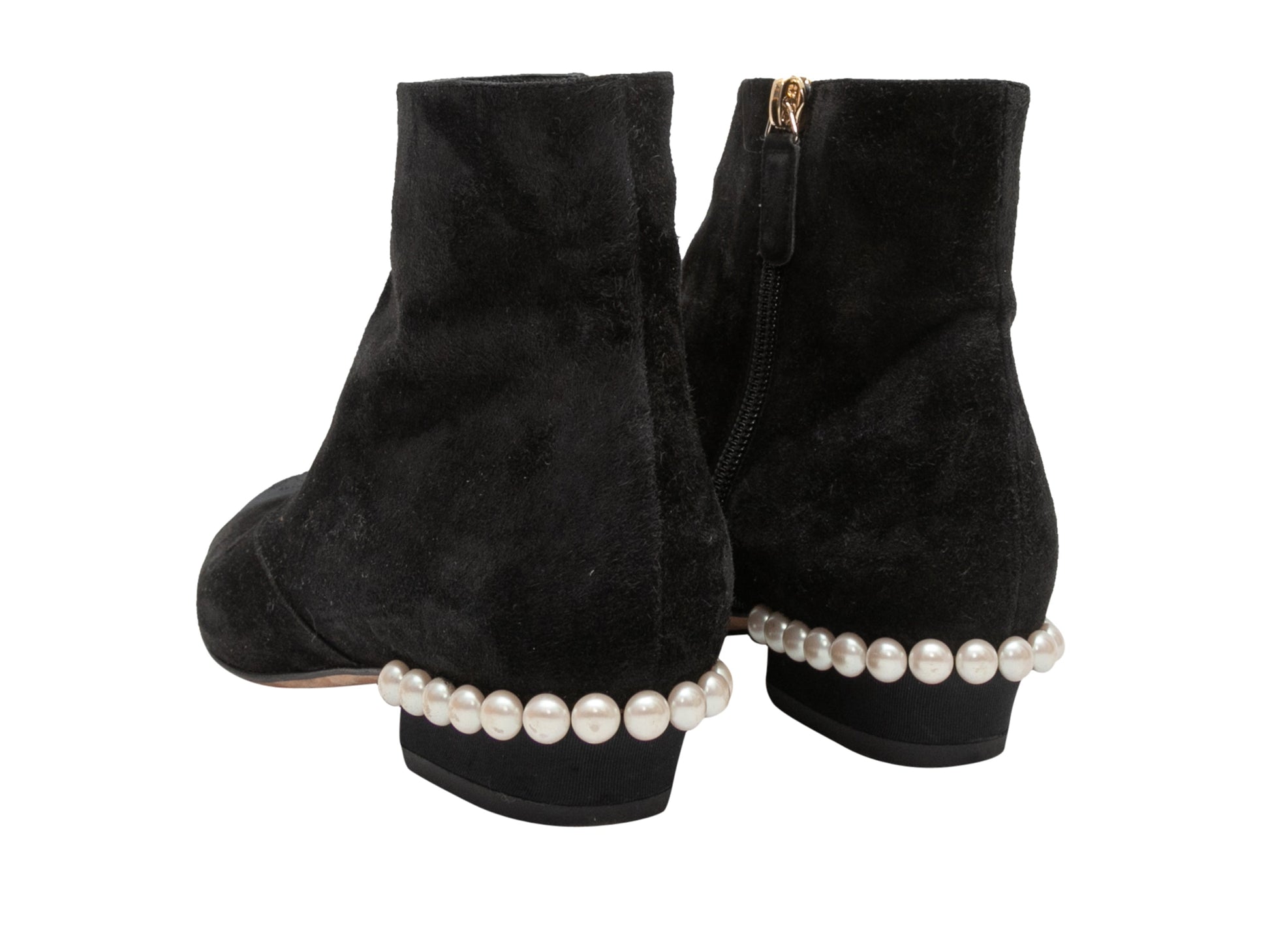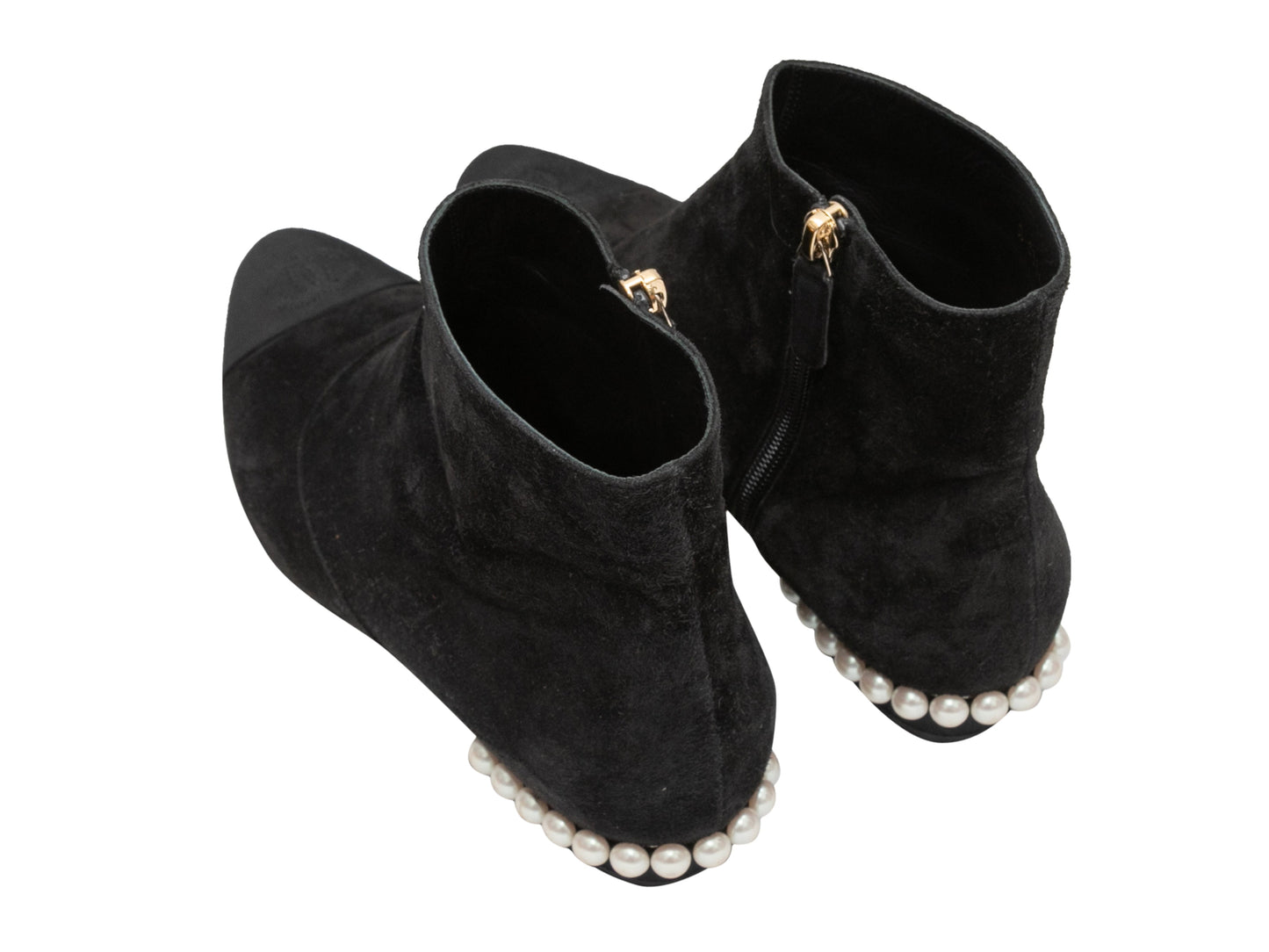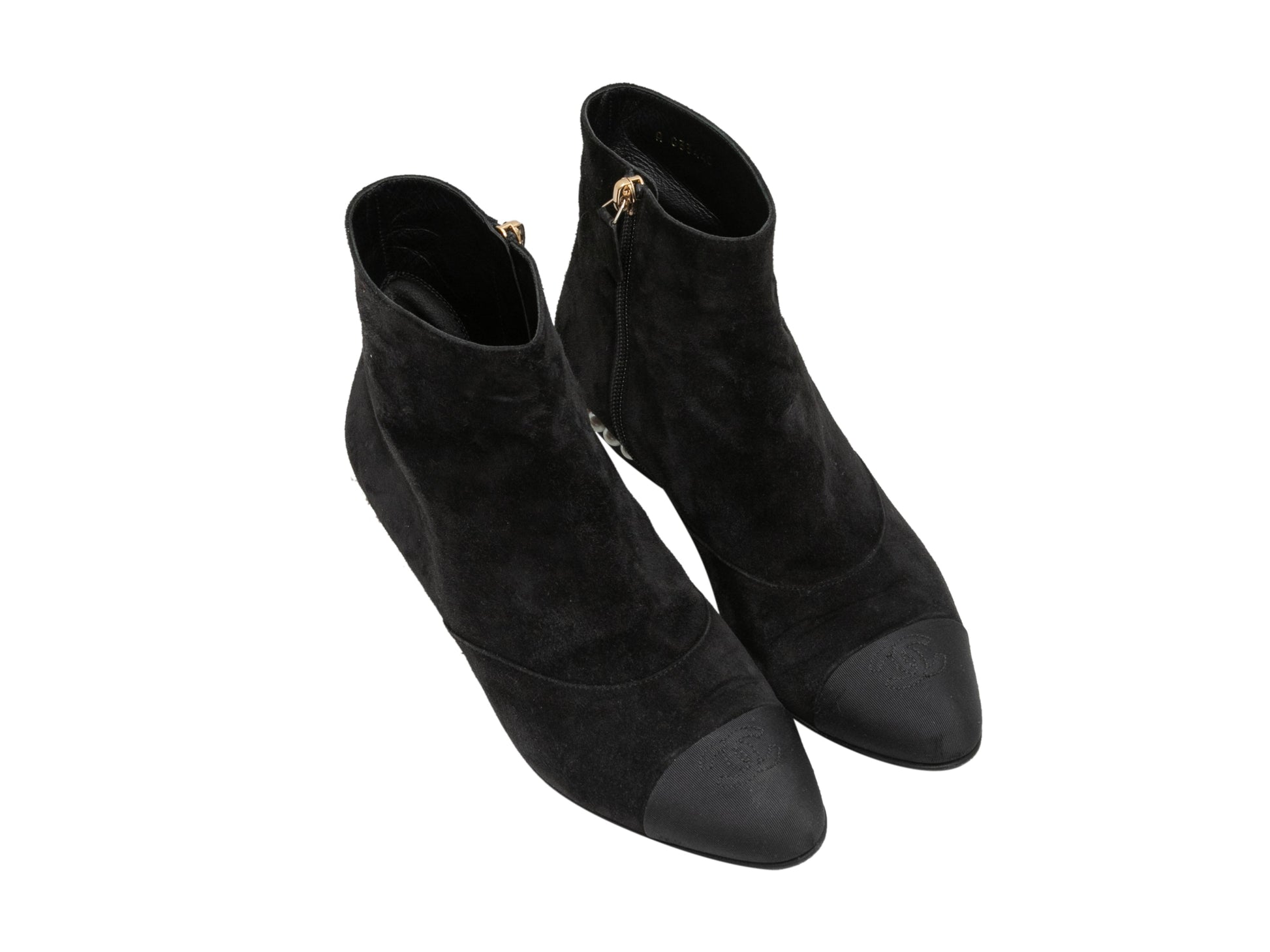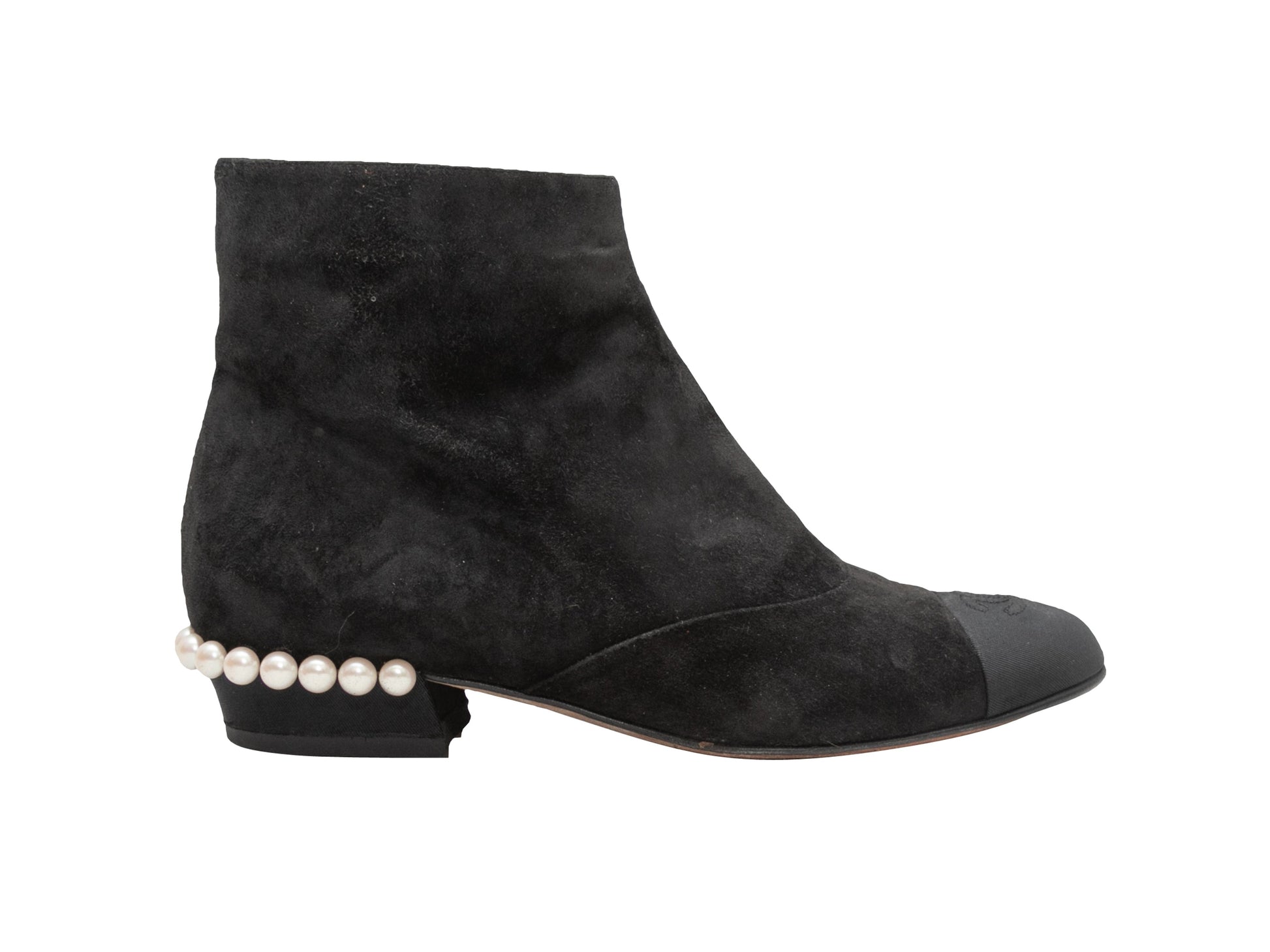 Product Details: Black suede cap-toe ankle boots by Chanel. Faux pearl accents at grosgrain block heels. Zip closures at inner sides. 5" shaft height, 1" heel height.