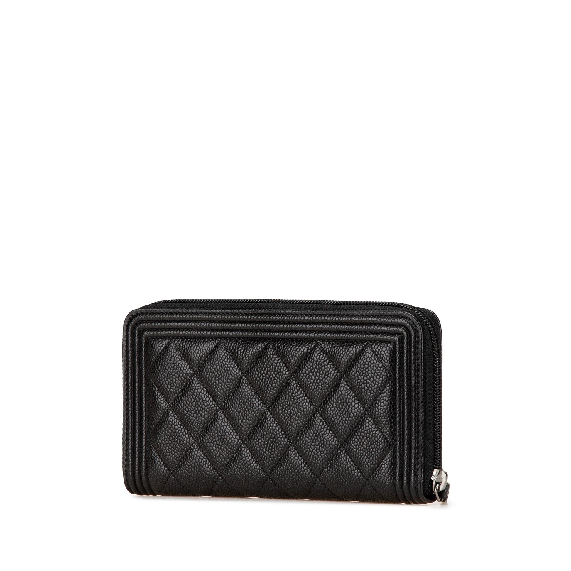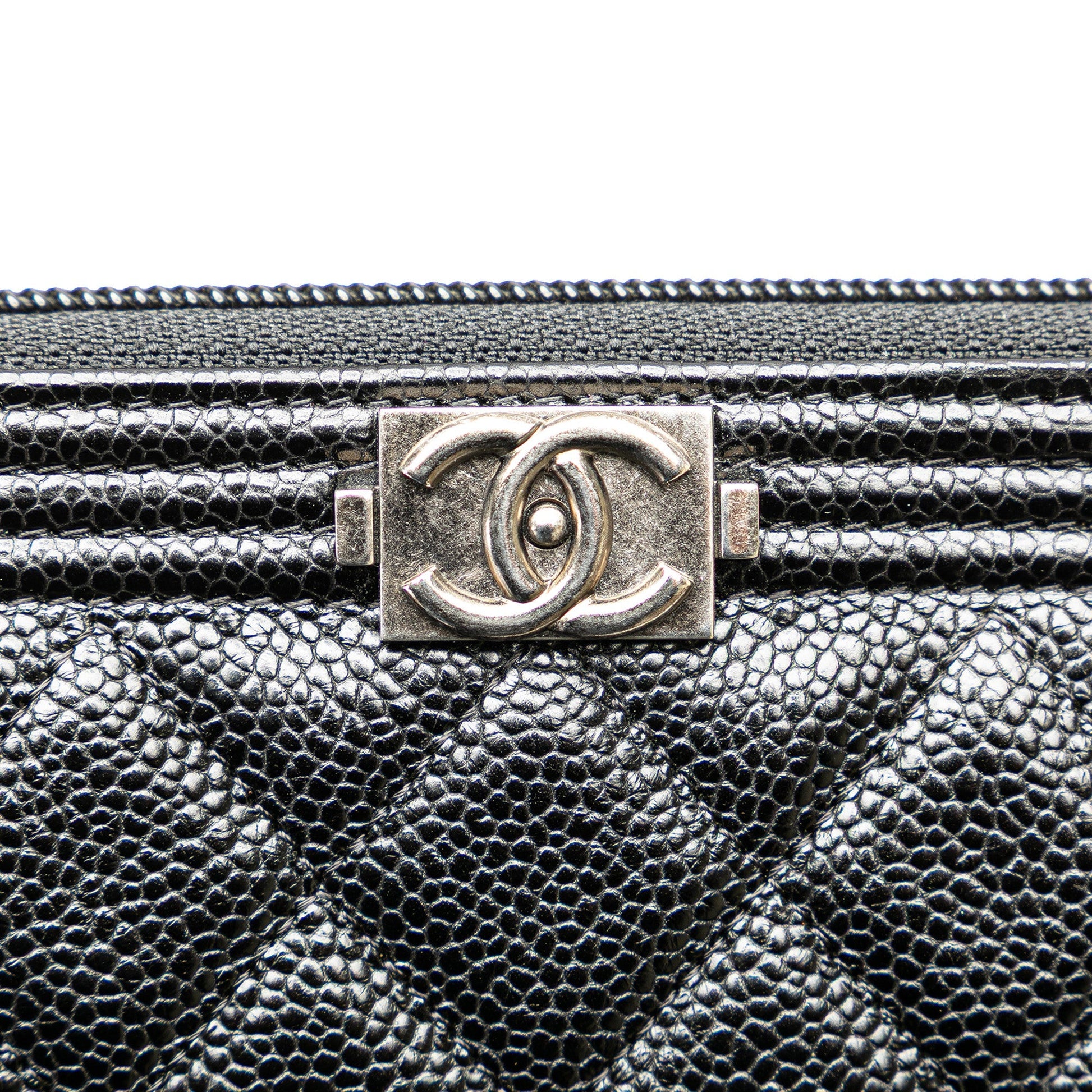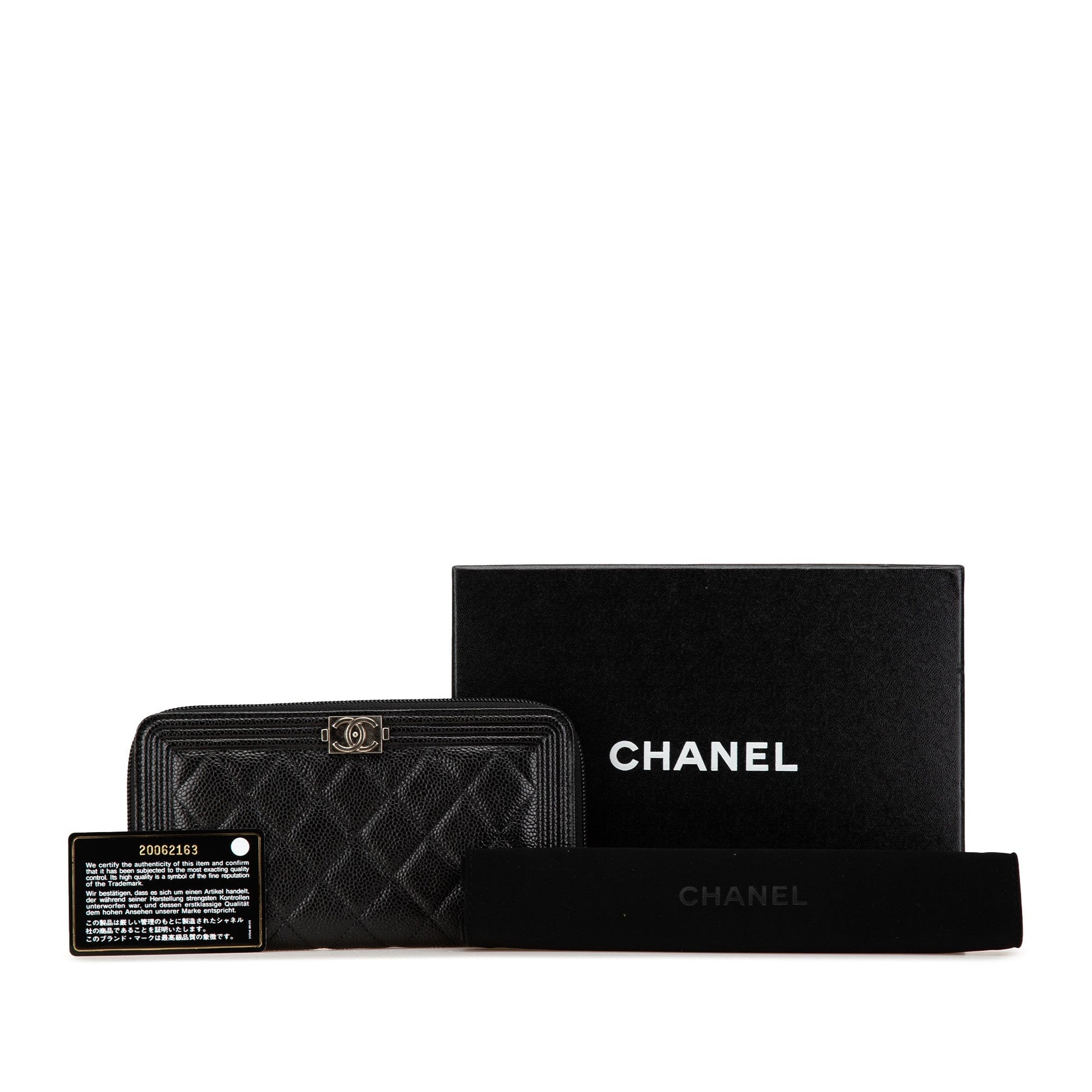 Product Details: Black Chanel Caviar Boy Long Zip Around Wallet. This long wallet features a quilted caviar leather body, a zip around closure, an interior zip compartment, and interior card slots. 4.1" L x 7.5" W x 0.8" D. Serial number 20062163.