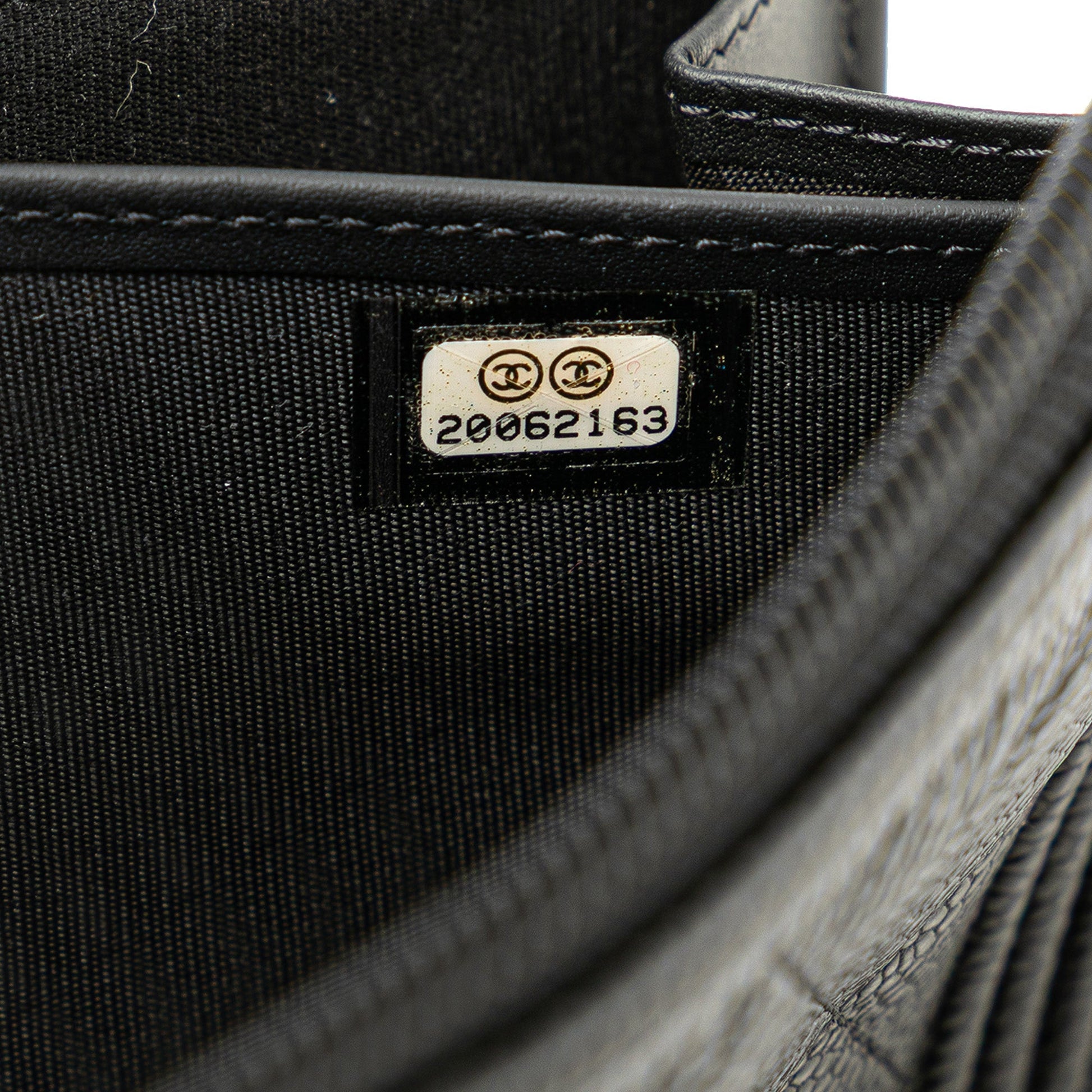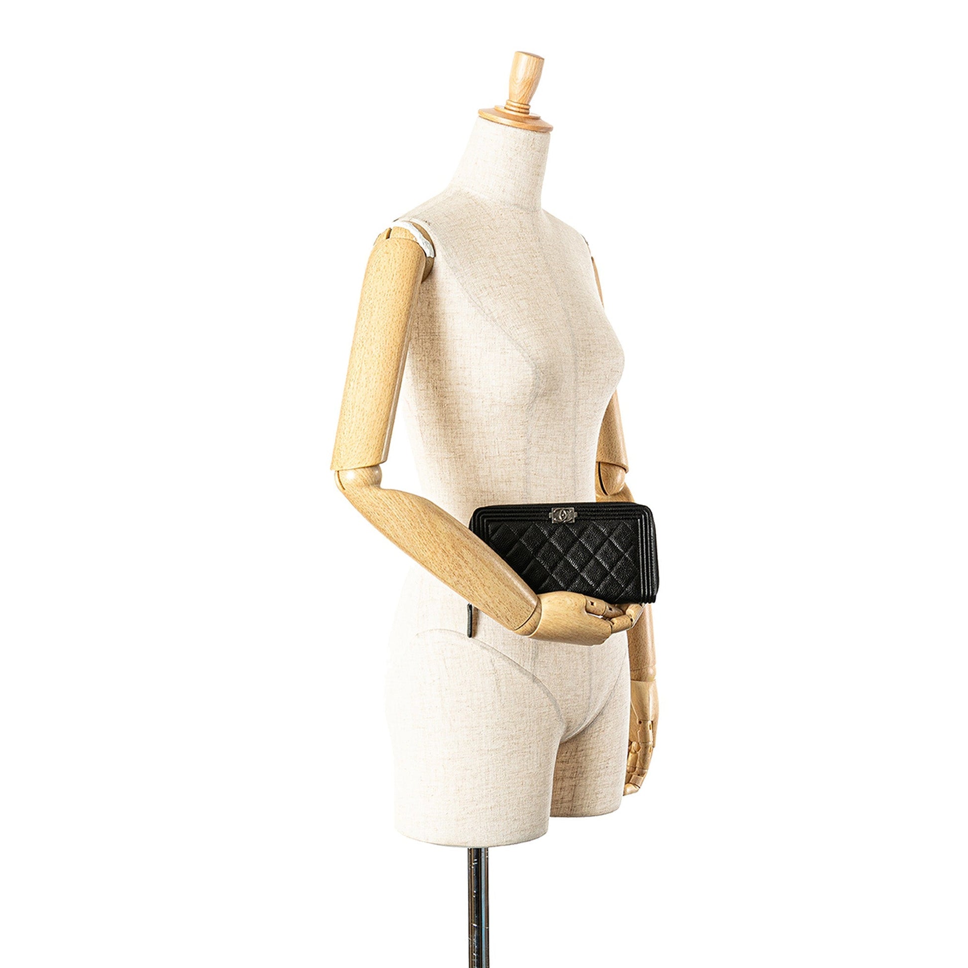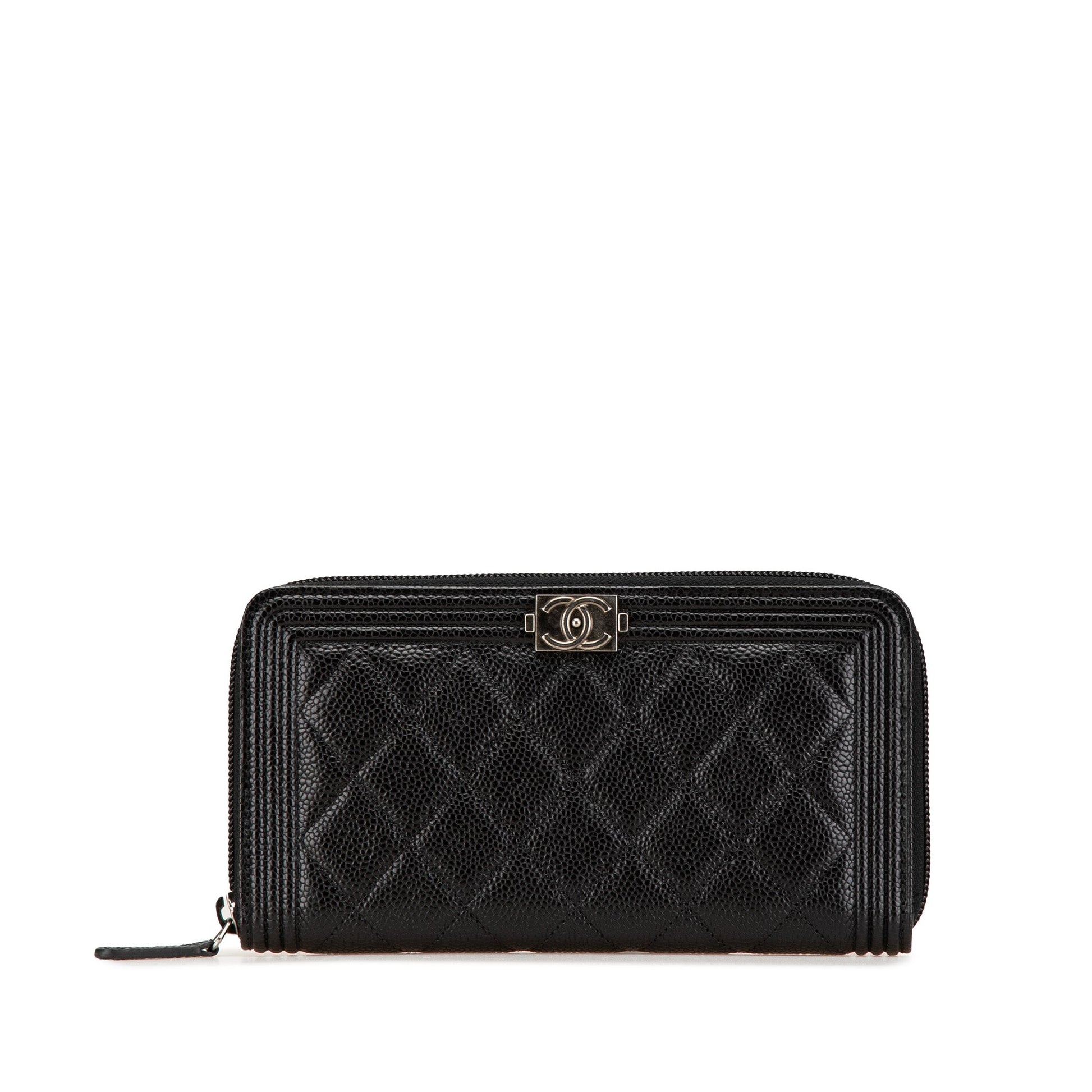 Product Details: Black Chanel Caviar Boy Long Zip Around Wallet. This long wallet features a quilted caviar leather body, a zip around closure, an interior zip compartment, and interior card slots. 4.1" L x 7.5" W x 0.8" D. Serial number 20062163.