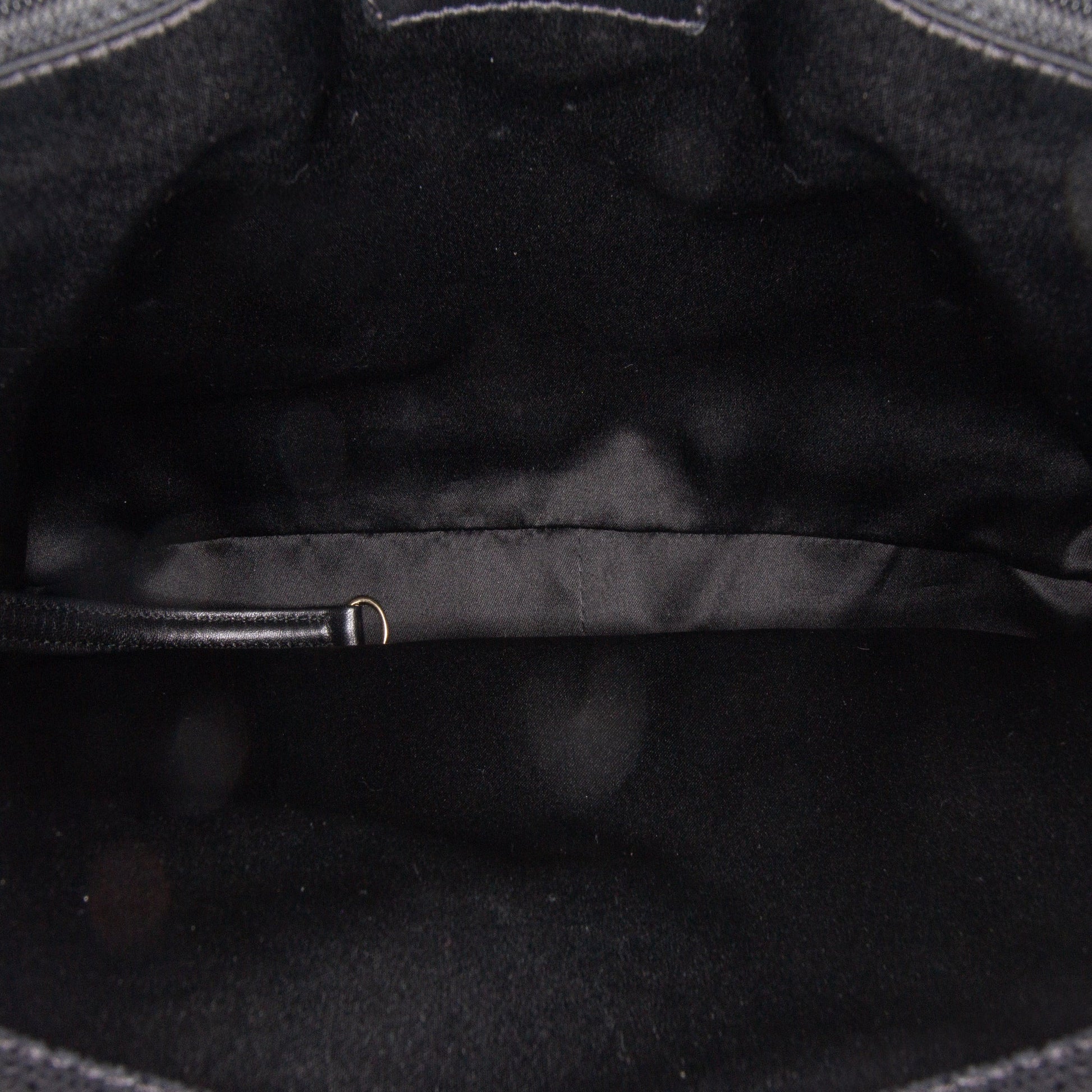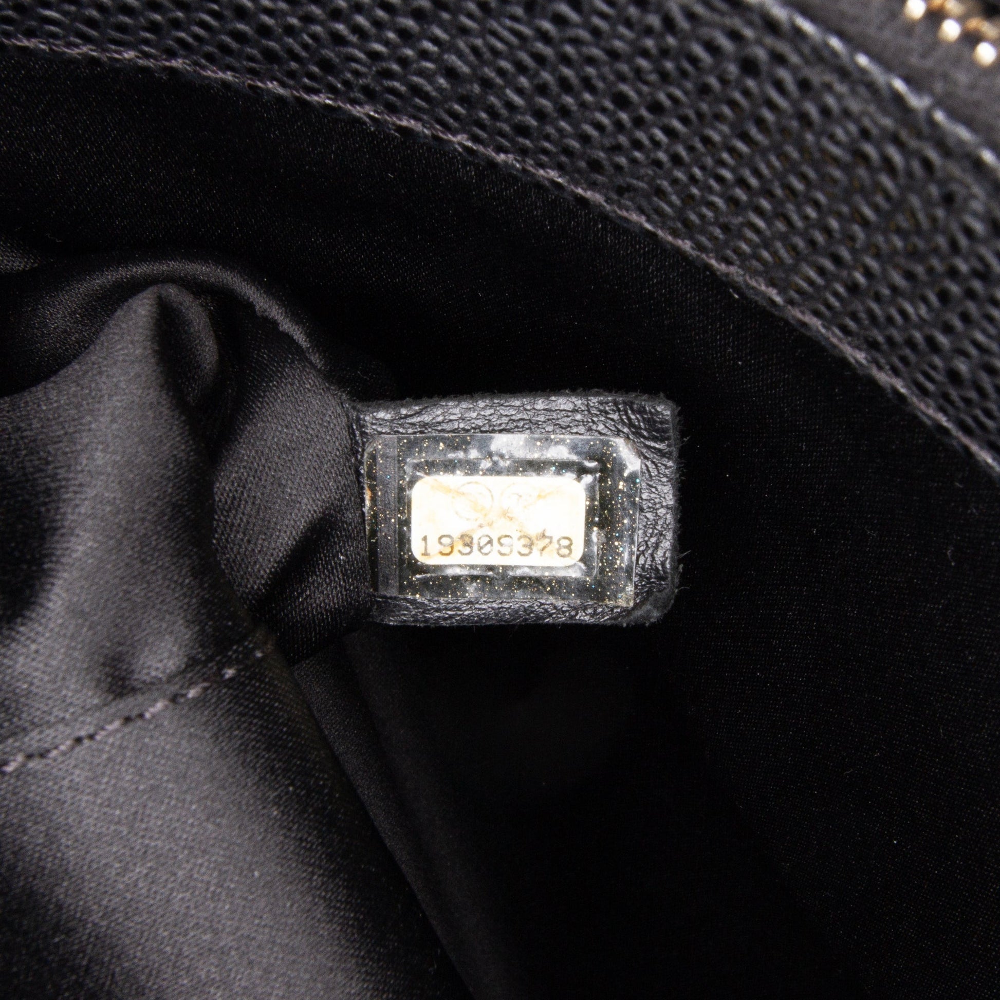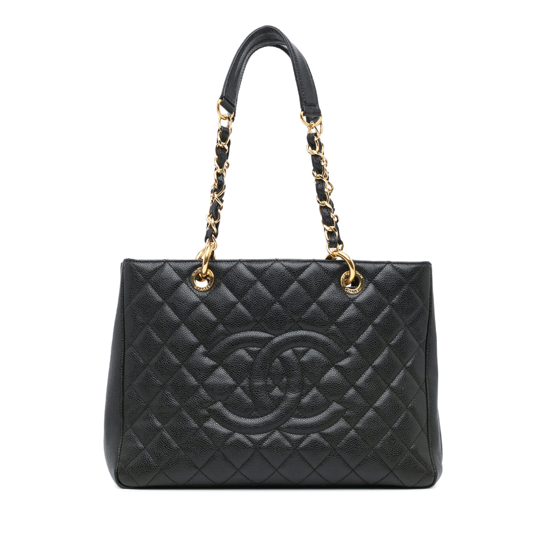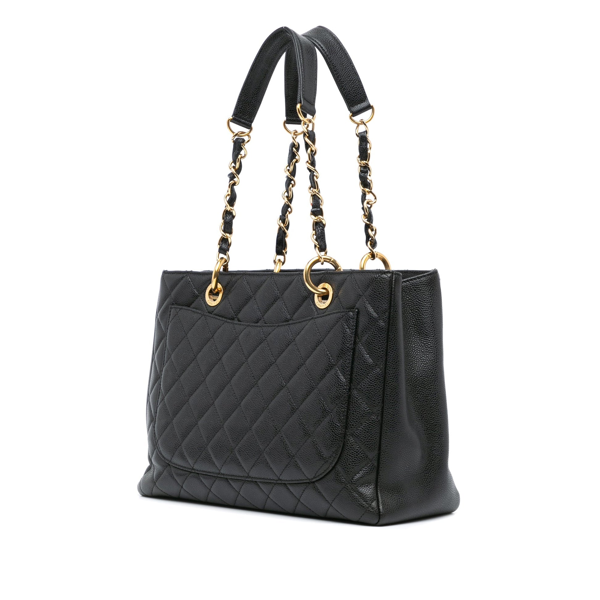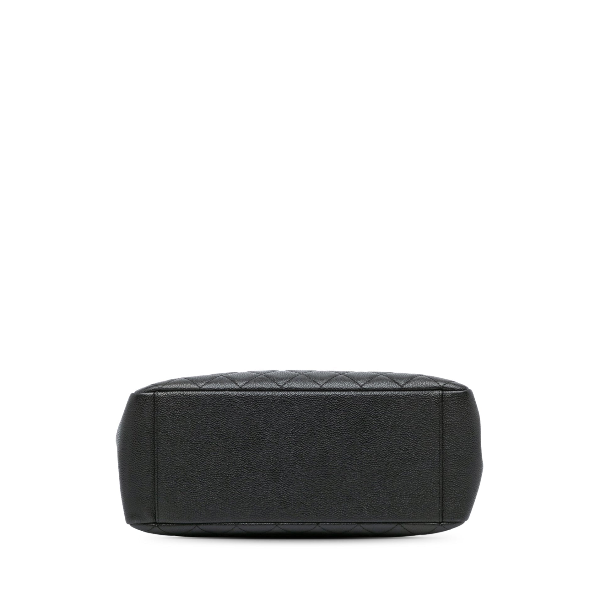 Product Details: Black Chanel Caviar Grand Shopping Tote. The Grand Shopping Tote features a quilted caviar leather body, leather woven chain shoulder straps, an open top, an exterior slip pocket, and interior zip and slip pockets. 9.4" L x 13" W x 5.1" D. Serial number 19309378.