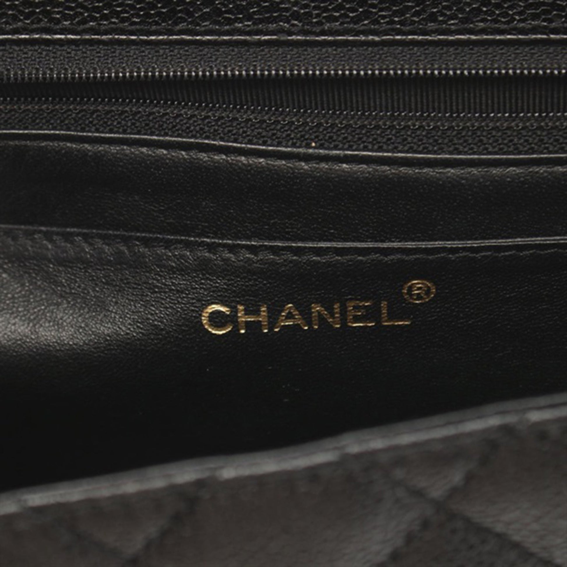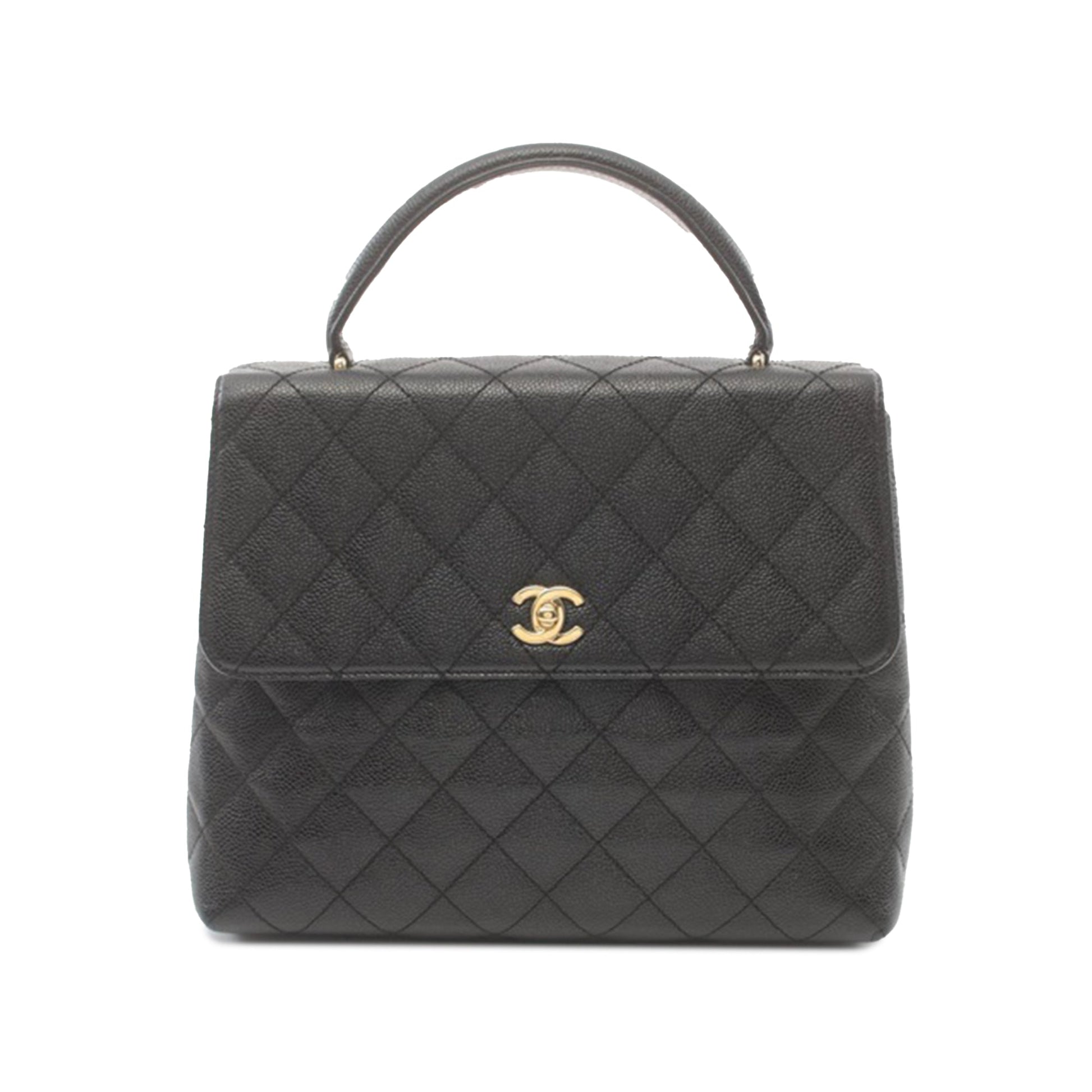 Product Details: Black Chanel Caviar Kelly Top Handle Bag. The Kelly features a quilted caviar leather body, rolled top handle, a top flap with CC turn lock closure, an exterior slip pocket, and interior zip and slip pockets. 9.1" L x 11.4" W x 4.3" D, 3.1" drop. Serial number 7781297.