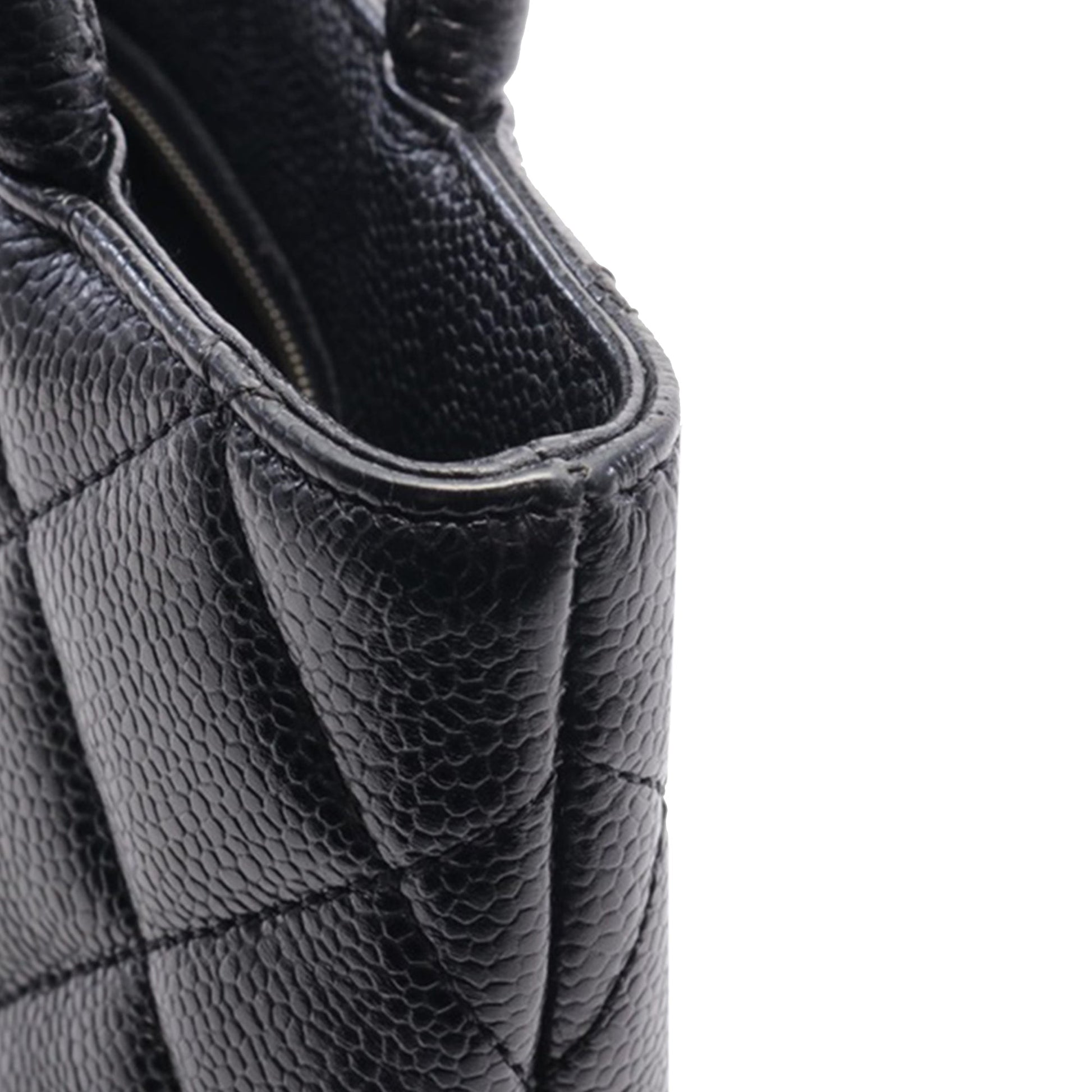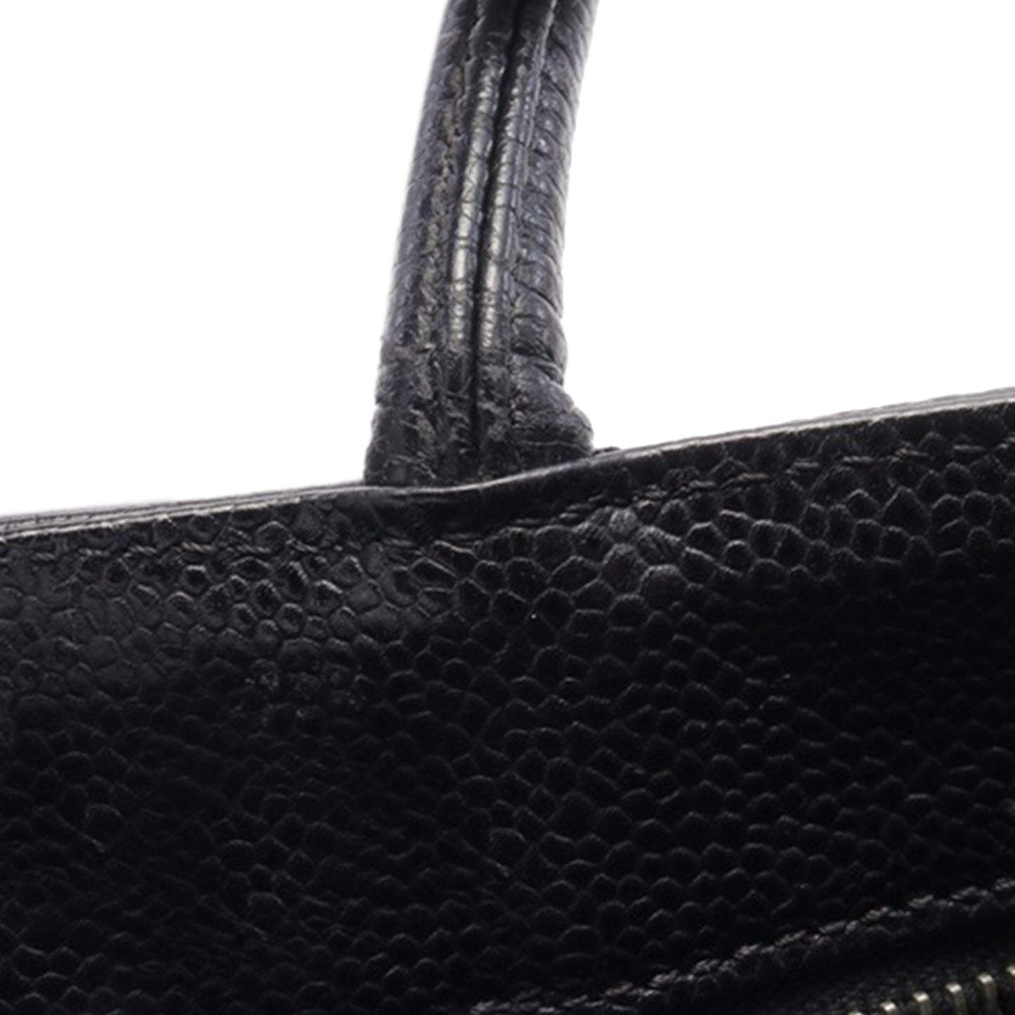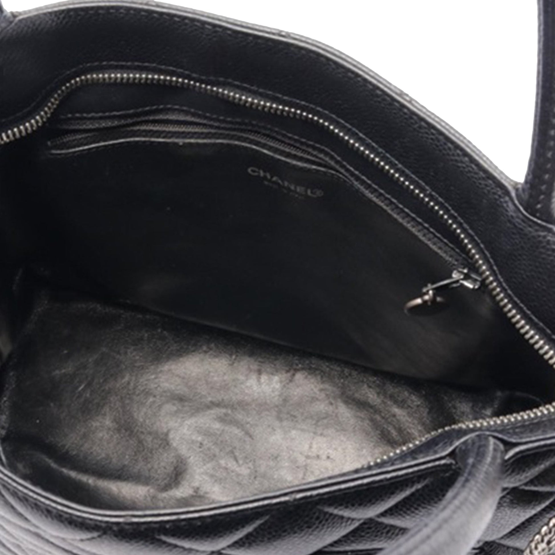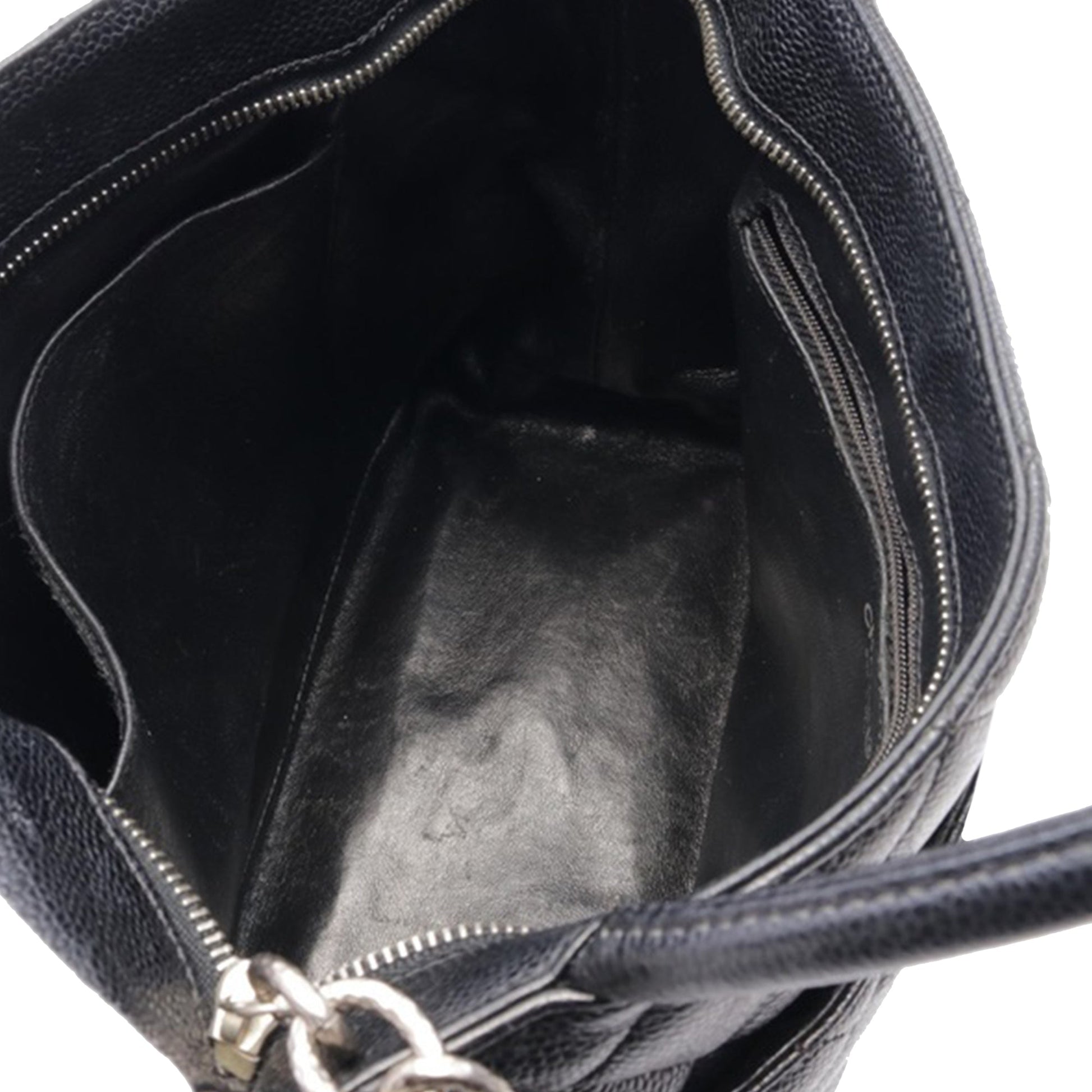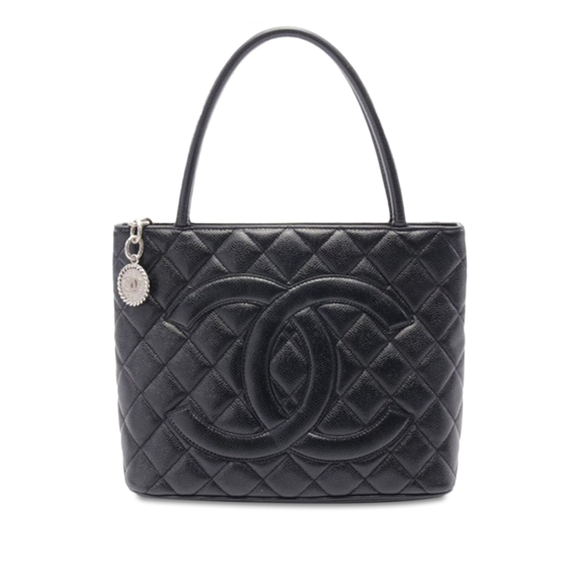 Product Details: Black Chanel Caviar Medallion Tote. The Medallion tote bag features a quilted caviar leather body, rolled leather handles, a top zip closure, an exterior back slip pocket, and interior zip and slip pockets. 9.8" L x 11.8" W x 6.3" D, 5.9" drop. Serial number 7639054.