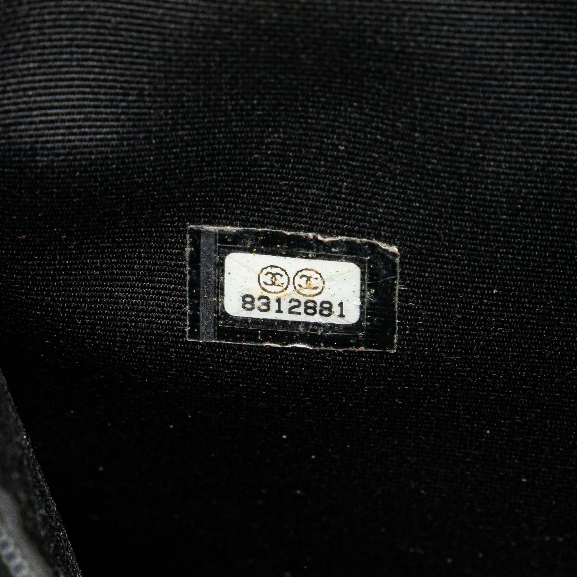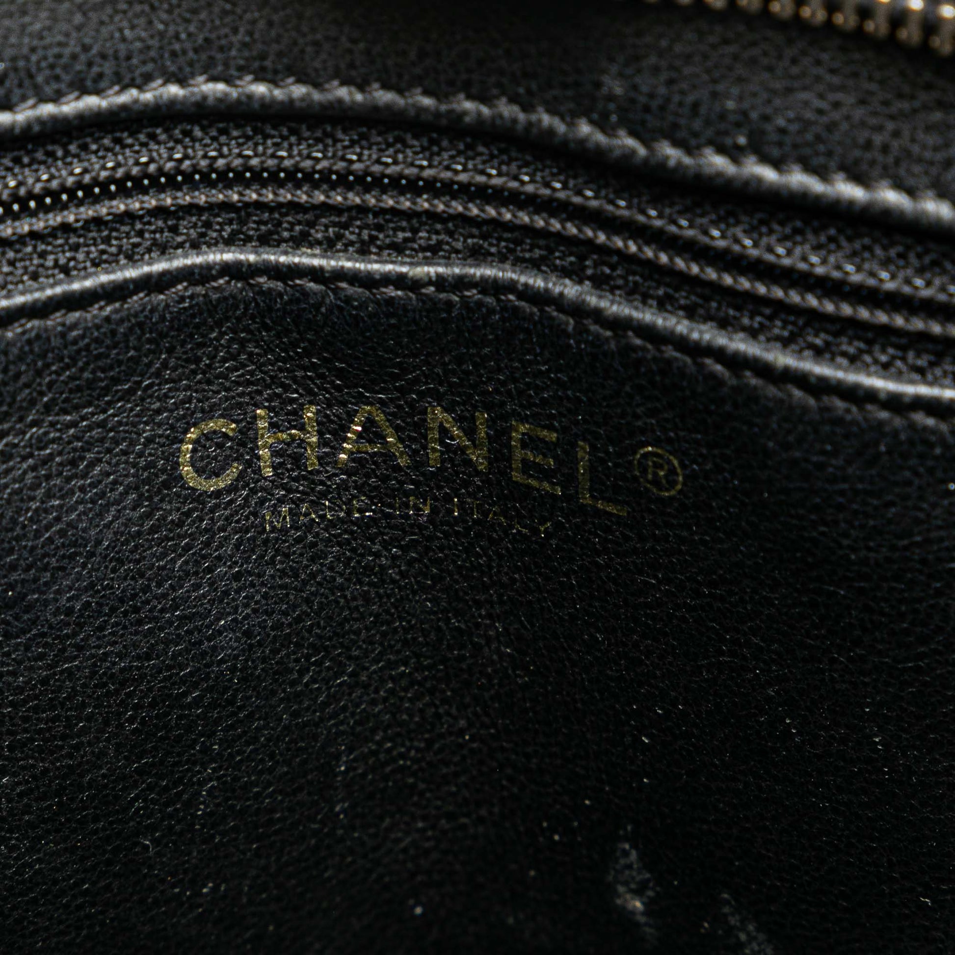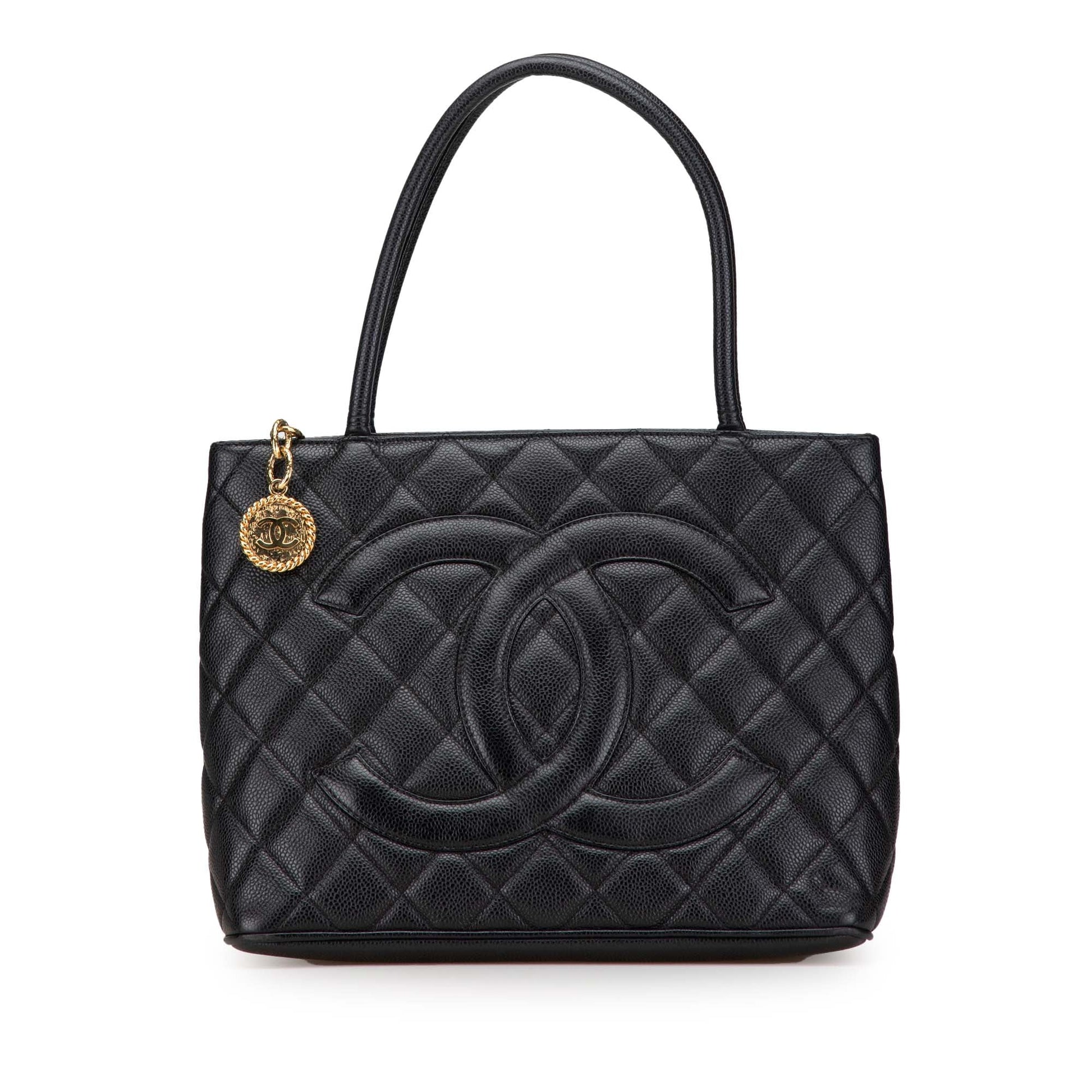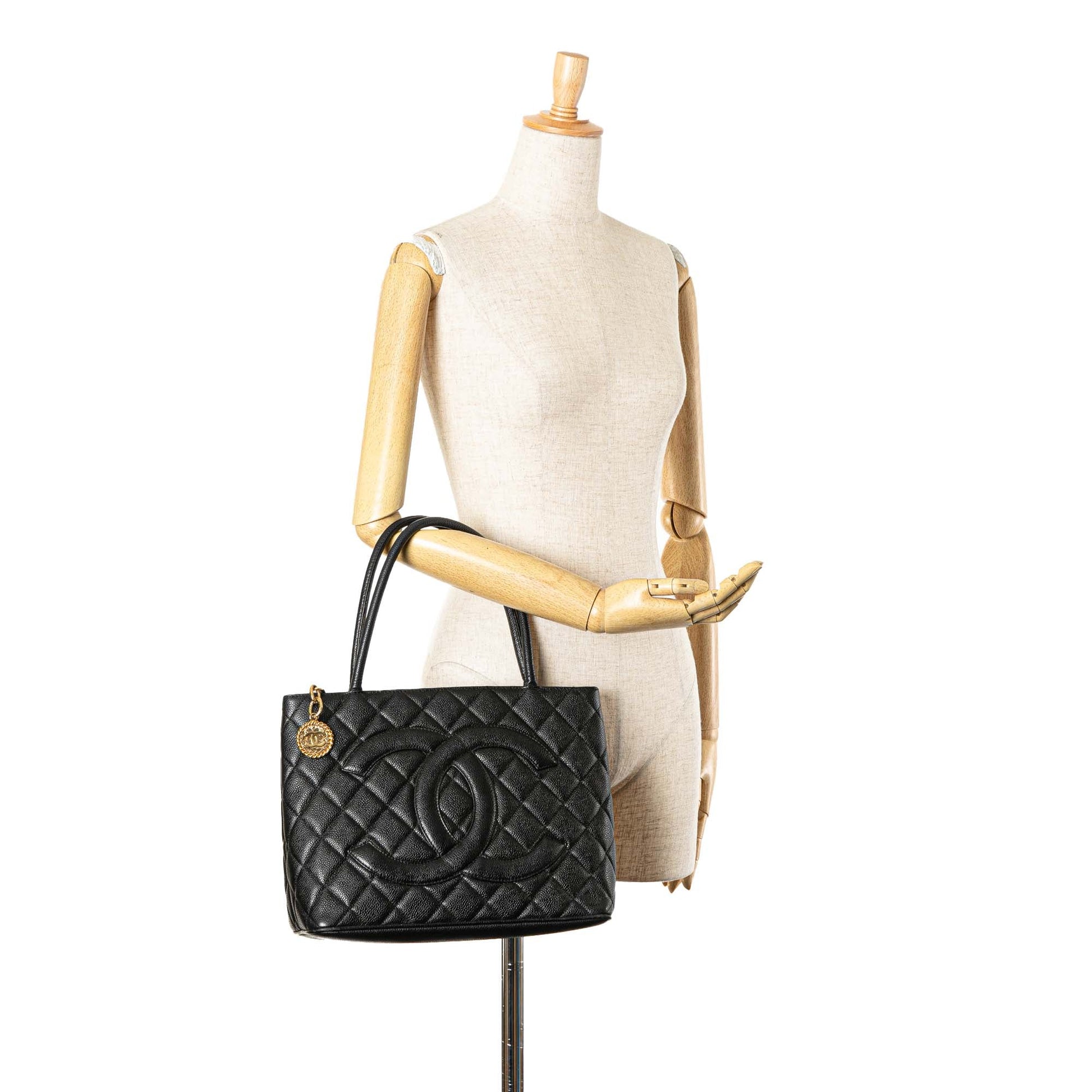 Product Details: Black Chanel Caviar Medallion Tote. The Medallion tote bag features a quilted caviar leather body, rolled leather handles, a top zip closure, an exterior back slip pocket, and interior zip and slip pockets. 9.6" L x 11.4" W x 5.5" D, 6.5" drop. Serial number 8312881.