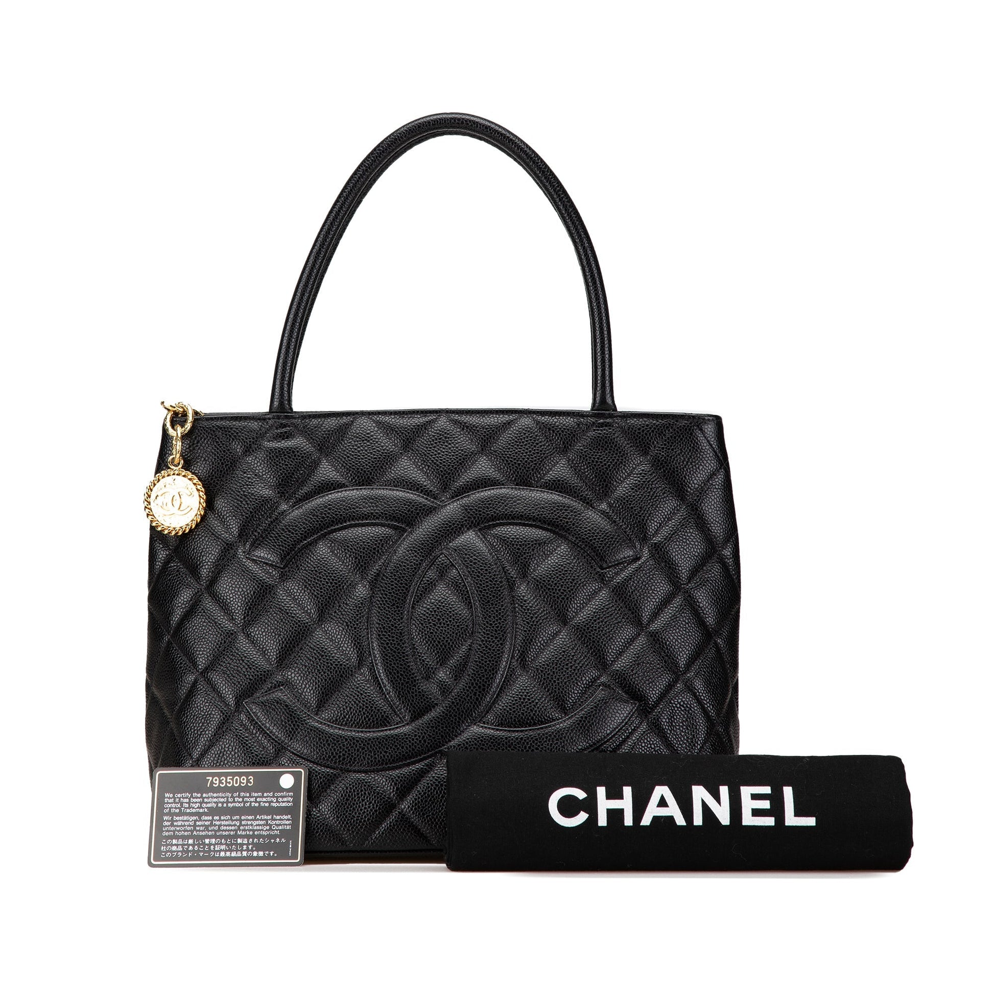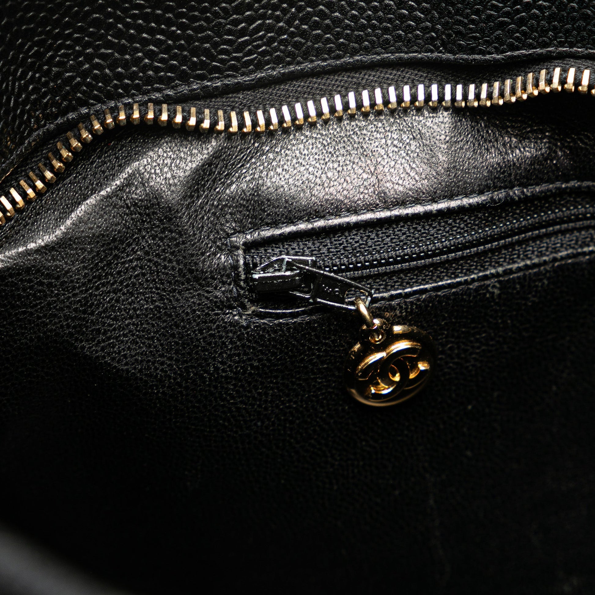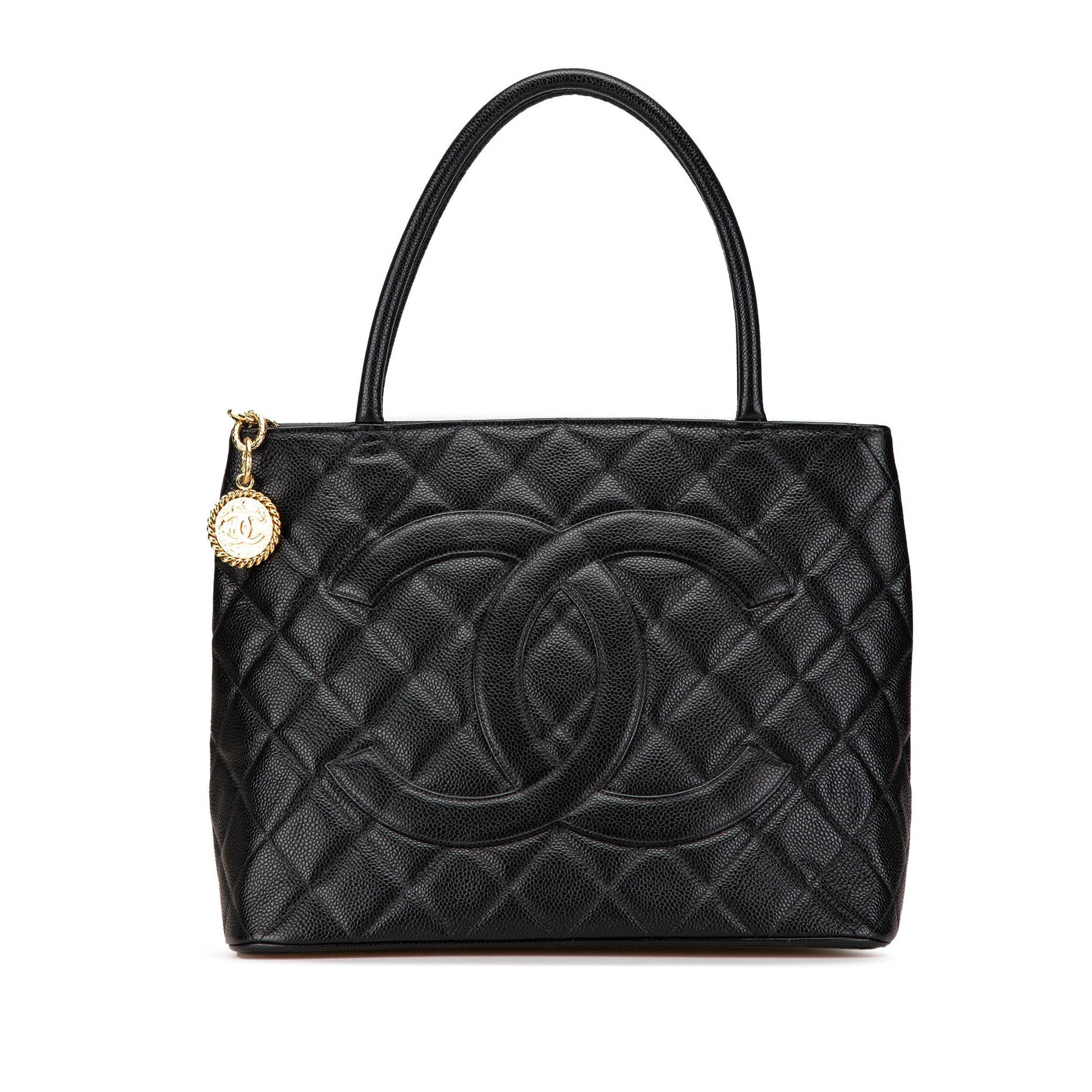Product Details: Black Chanel Caviar Medallion Tote. The Medallion tote bag features a quilted caviar leather body, rolled leather handles, a top zip closure, an exterior back slip pocket, and interior zip and slip pockets. The straps are reglued. 9.6" L x 12" W x 6.1" D. Serial number 7635093.