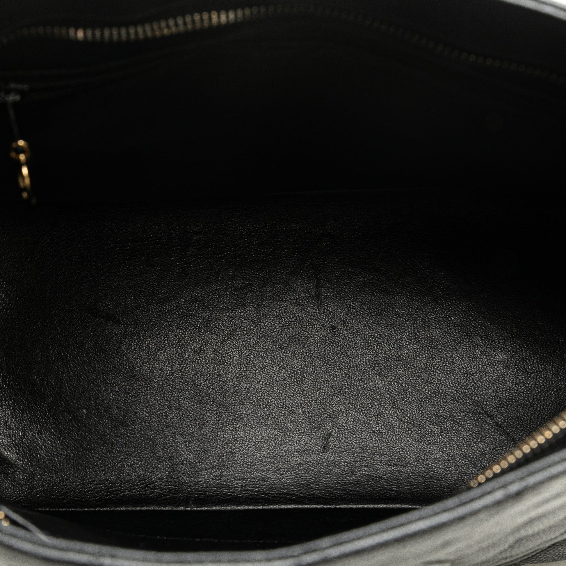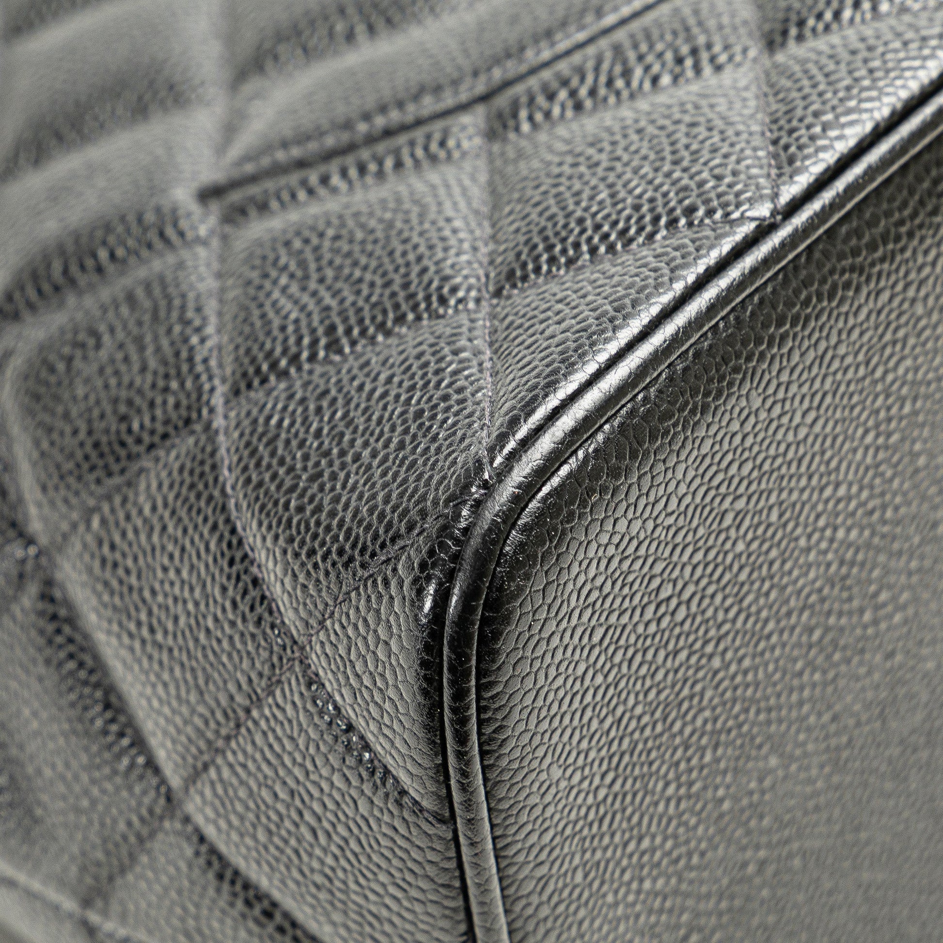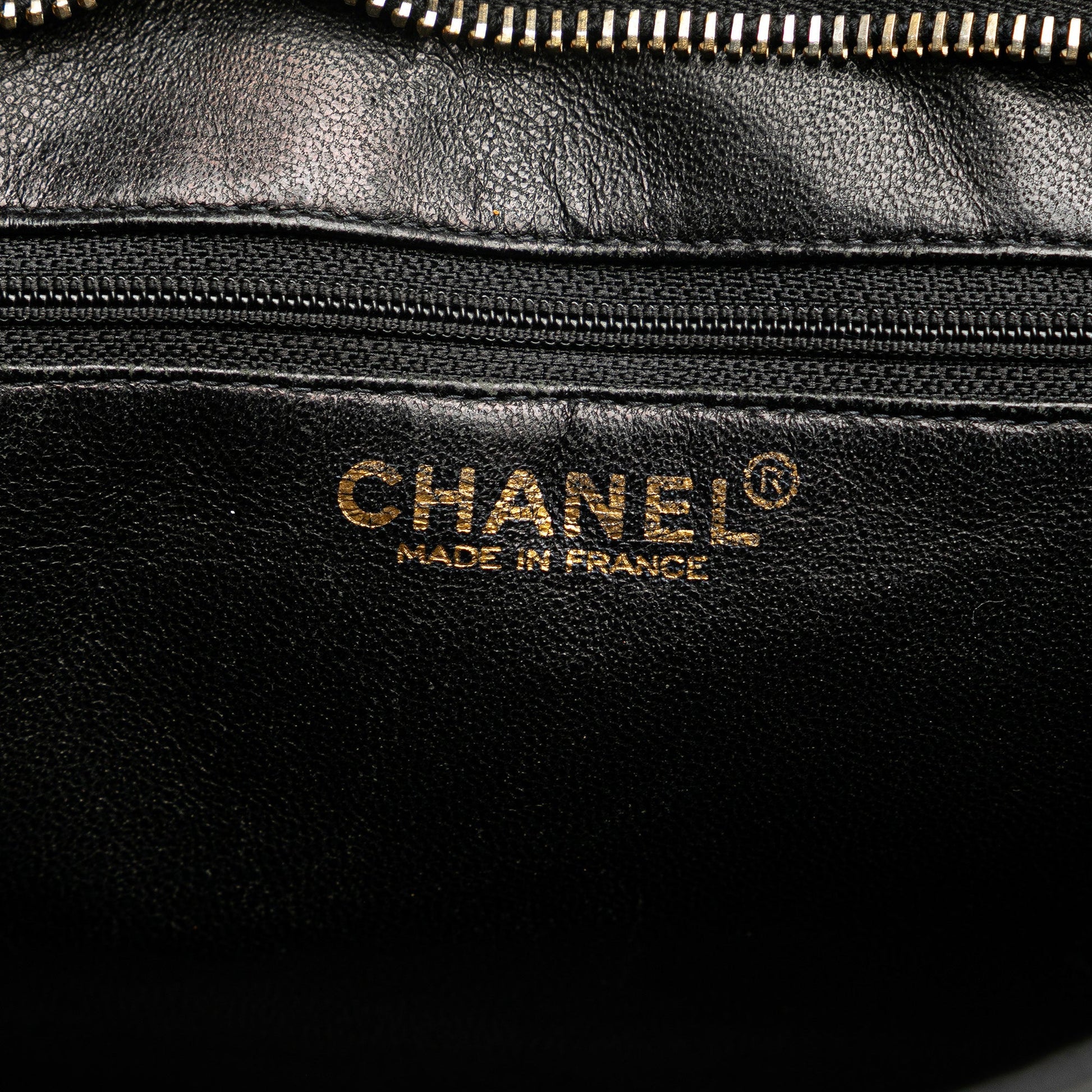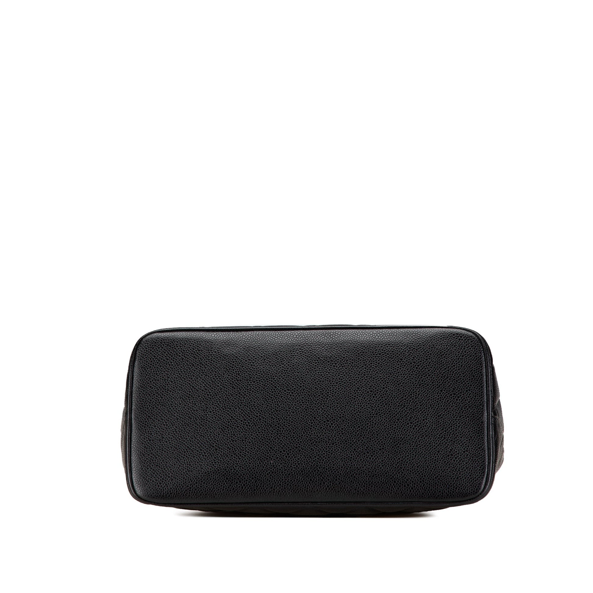 Product Details: Black Chanel Caviar Medallion Tote. The Medallion tote bag features a quilted caviar leather body, rolled leather handles, a top zip closure, an exterior back slip pocket, and interior zip and slip pockets. The straps are reglued. 9.6" L x 12" W x 6.1" D. Serial number 7635093.