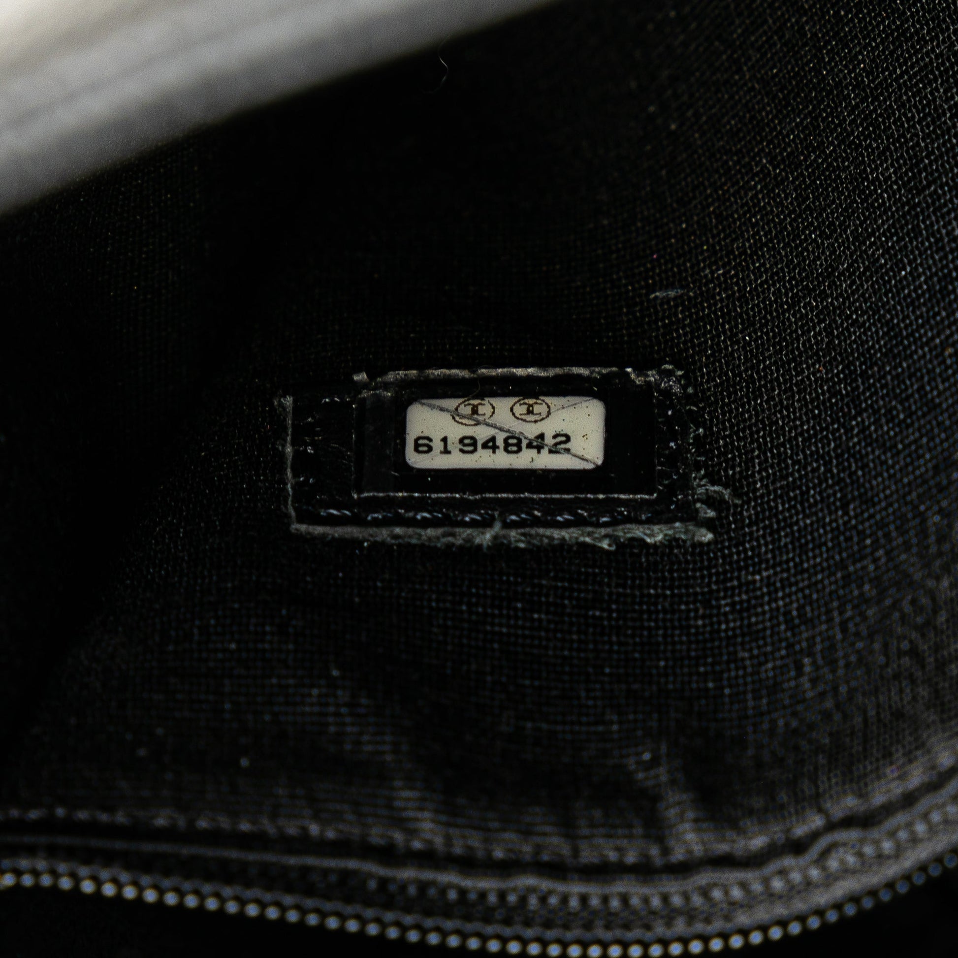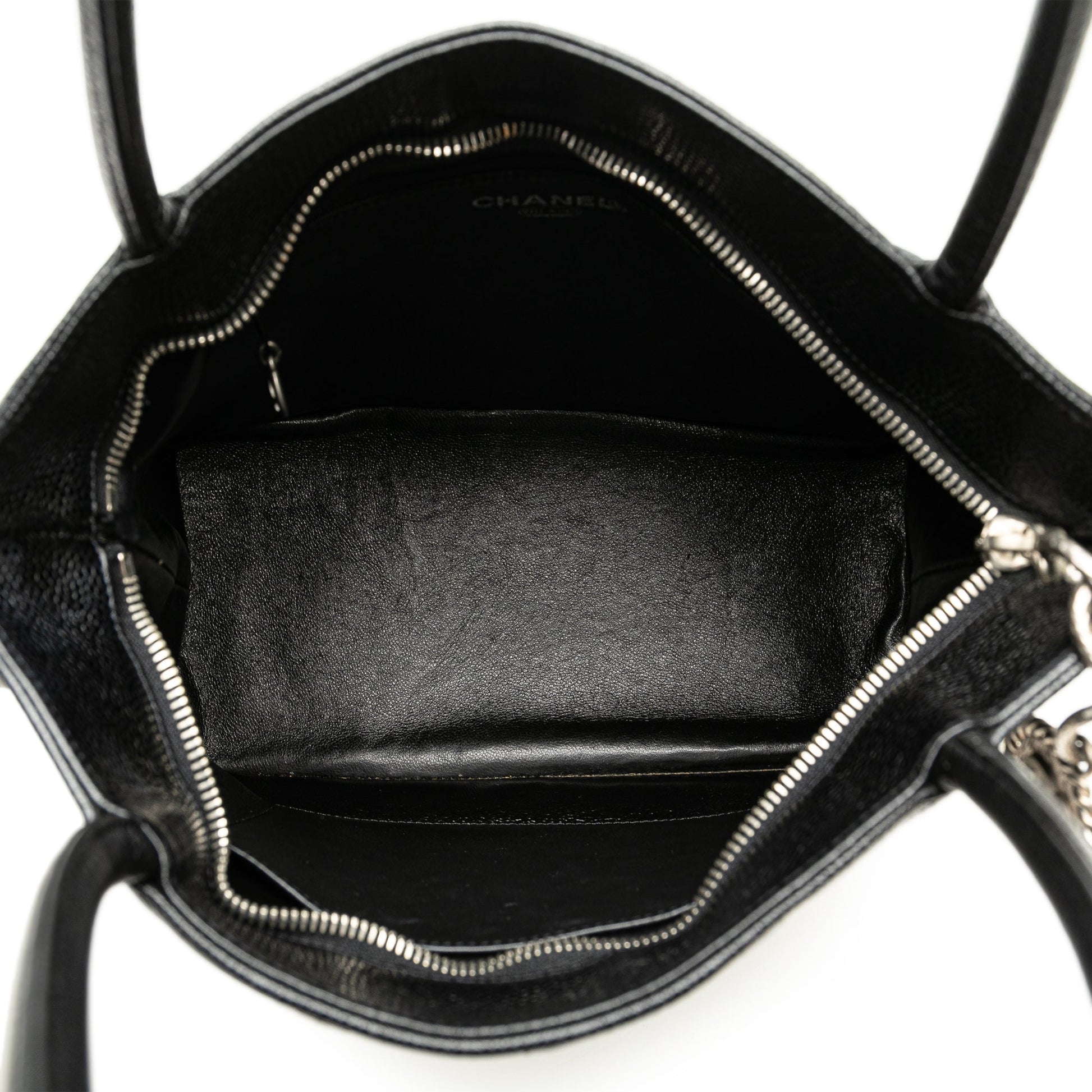 Product Details: Black Chanel Caviar Medallion Tote. The Medallion tote bag features a quilted caviar leather body, rolled leather handles, a top zip closure, an exterior back slip pocket, and interior zip and slip pockets. 9.1" L x 11.8" W x 5.9" D, 6.7" drop. Serial number 6194842.