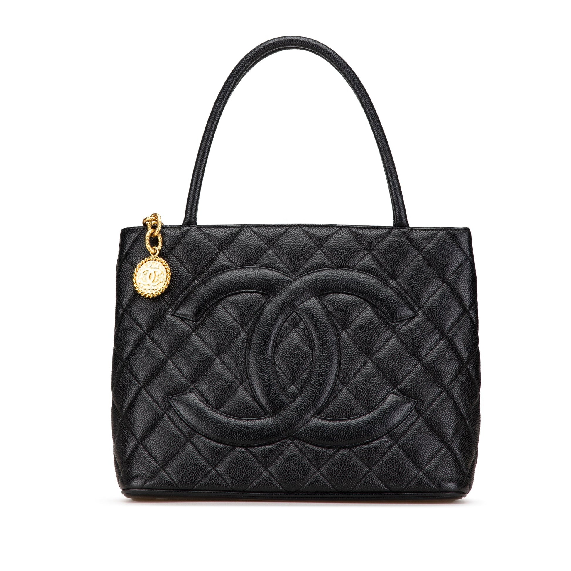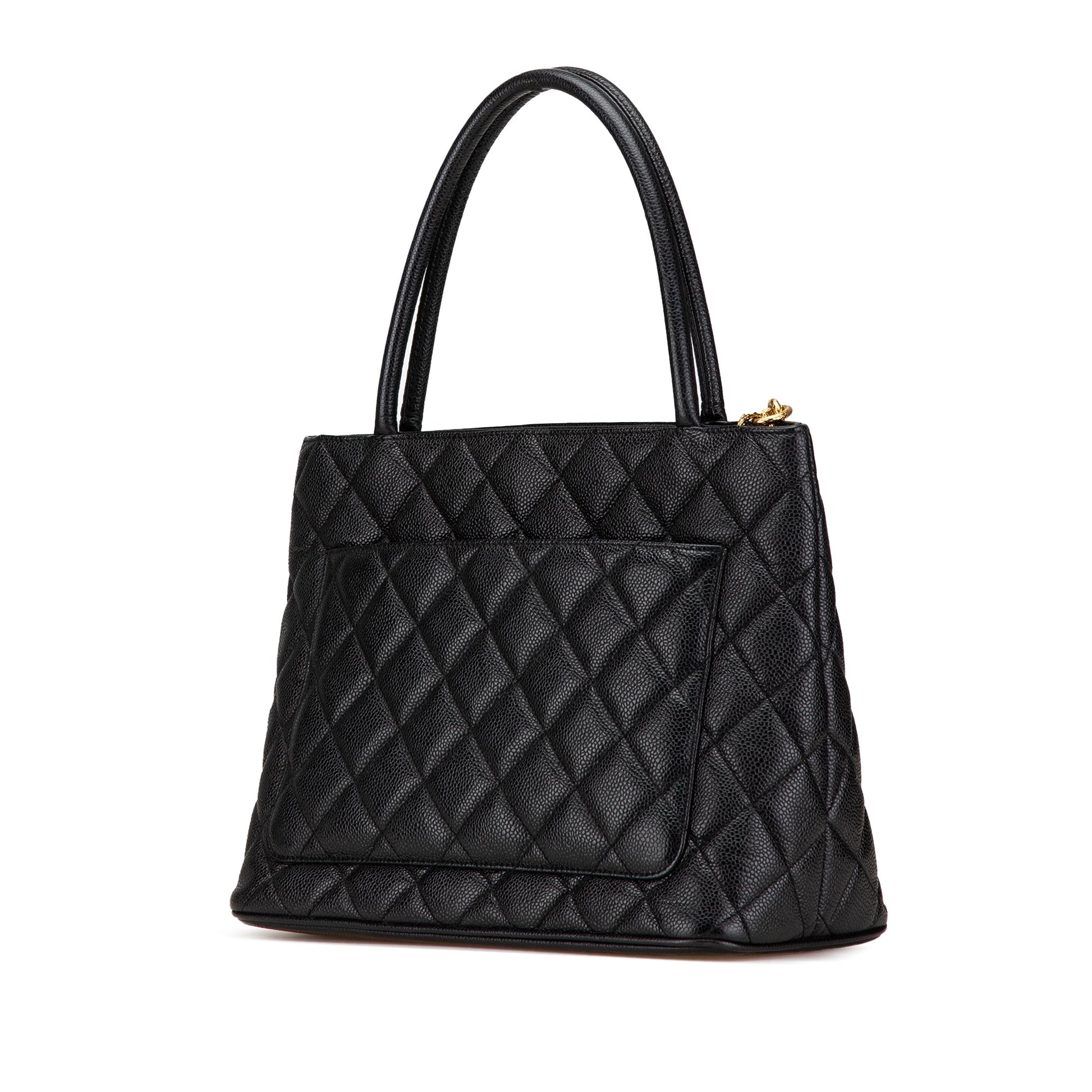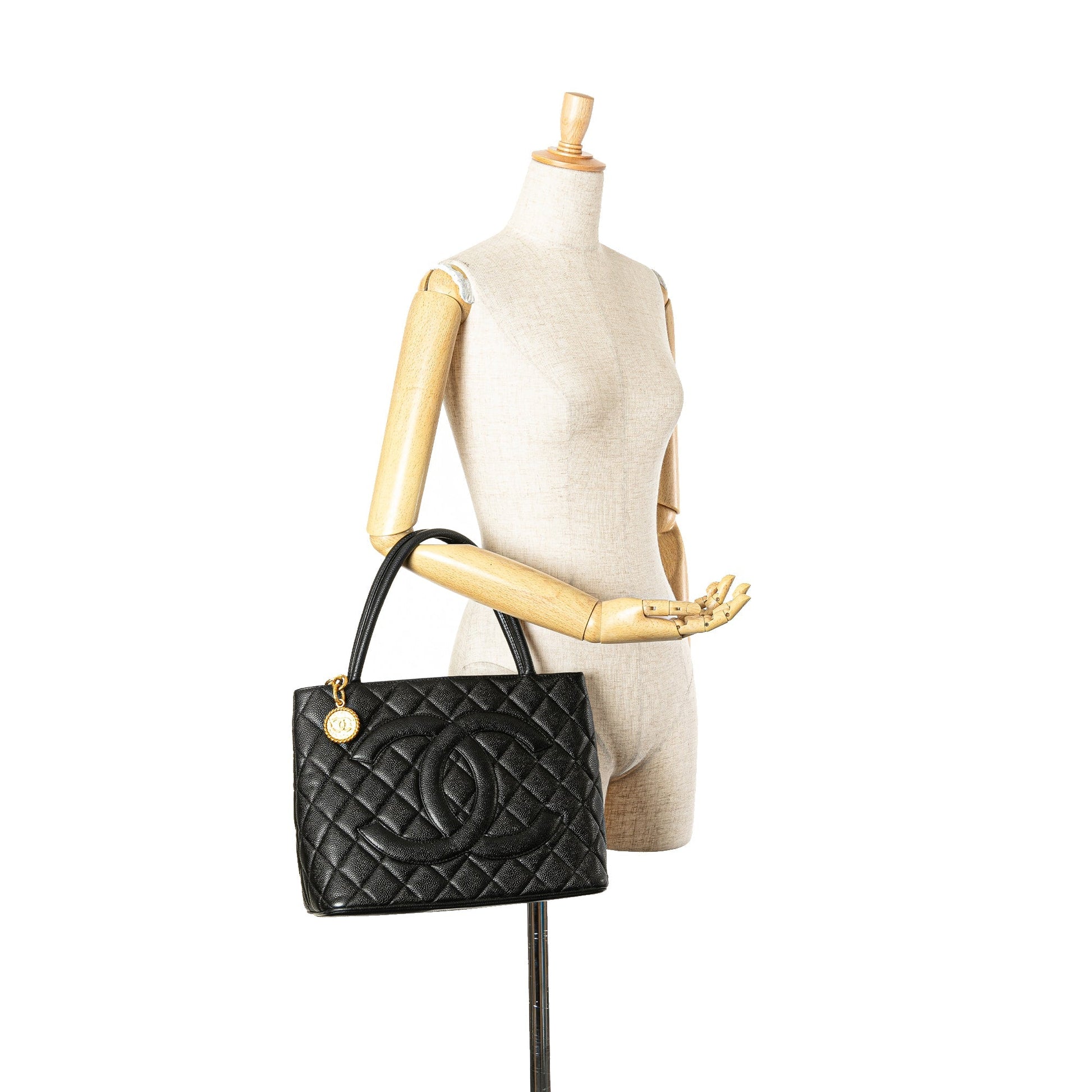 Product Details: Black Chanel Caviar Medallion Tote. The Medallion tote bag features a quilted caviar leather body, rolled leather handles, a top zip closure, an exterior back slip pocket, and interior zip and slip pockets. 9.1" L x 11.4" W x 5.9" D, 6.3" drop. Serial number 7723686.