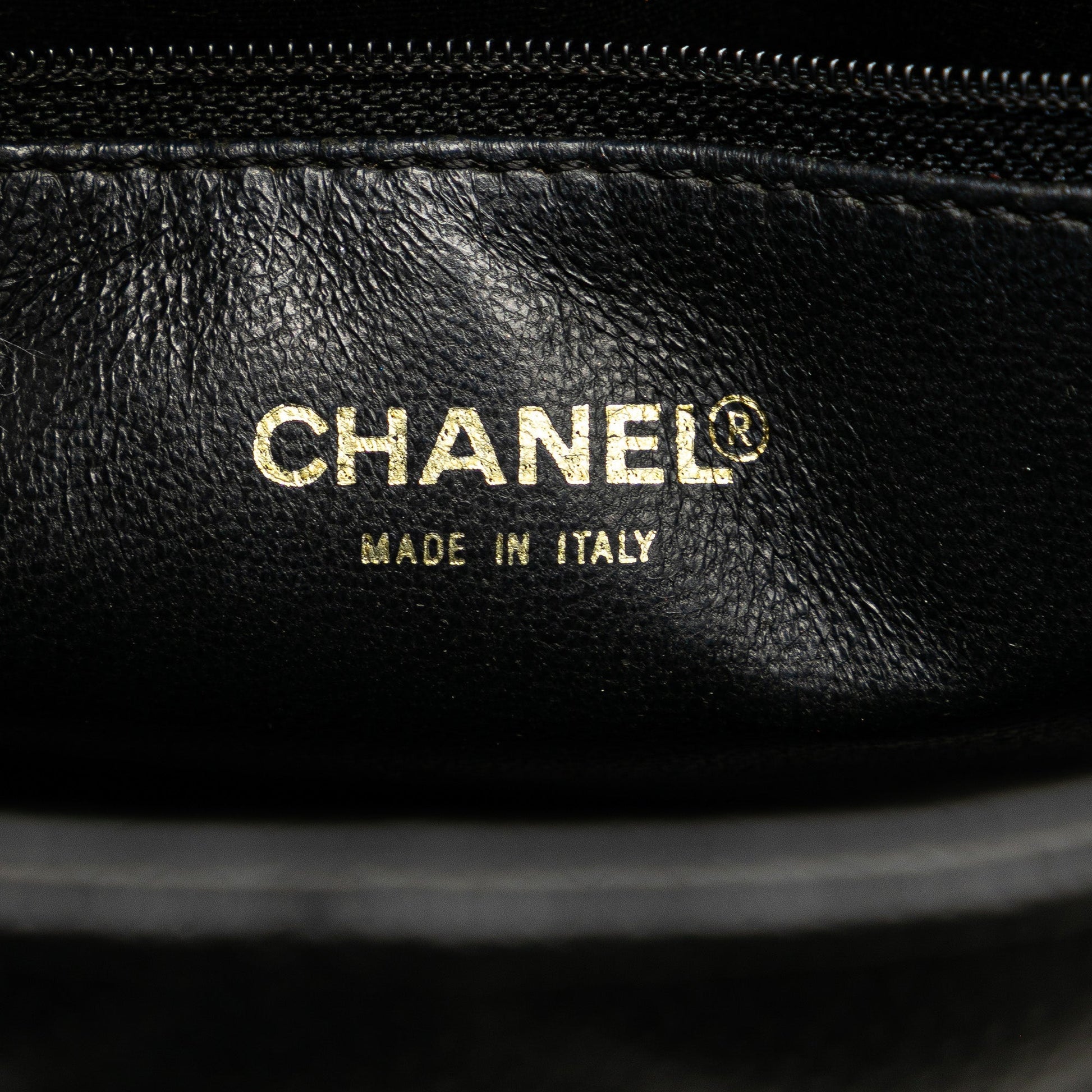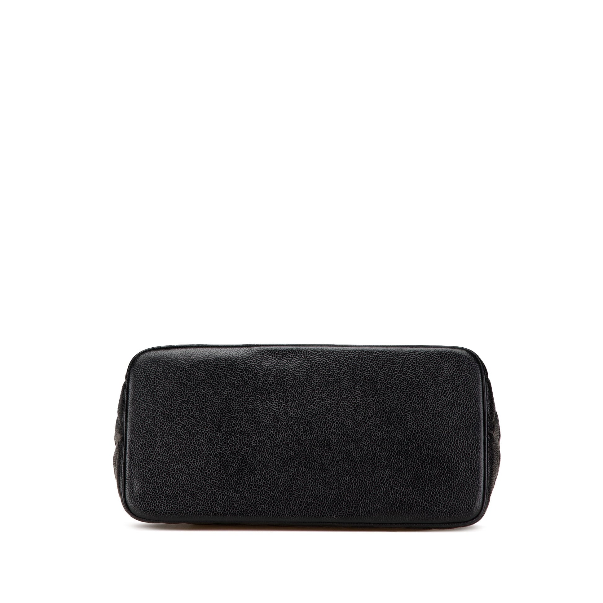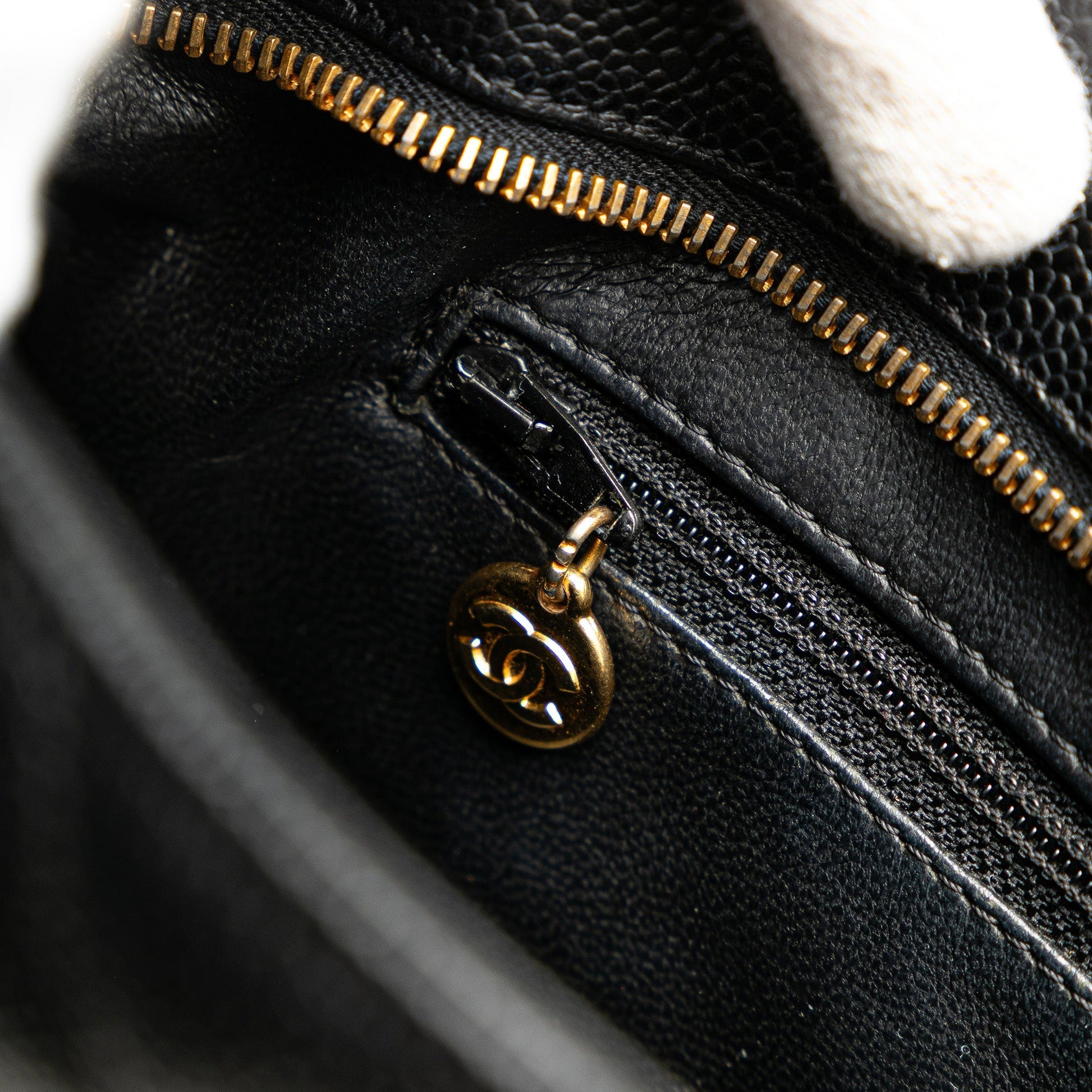 Product Details: Black Chanel Caviar Medallion Tote. The Medallion tote bag features a quilted caviar leather body, rolled leather handles, a top zip closure, an exterior back slip pocket, and interior zip and slip pockets. 9.1" L x 11.4" W x 5.9" D, 6.3" drop. Serial number 7723686.