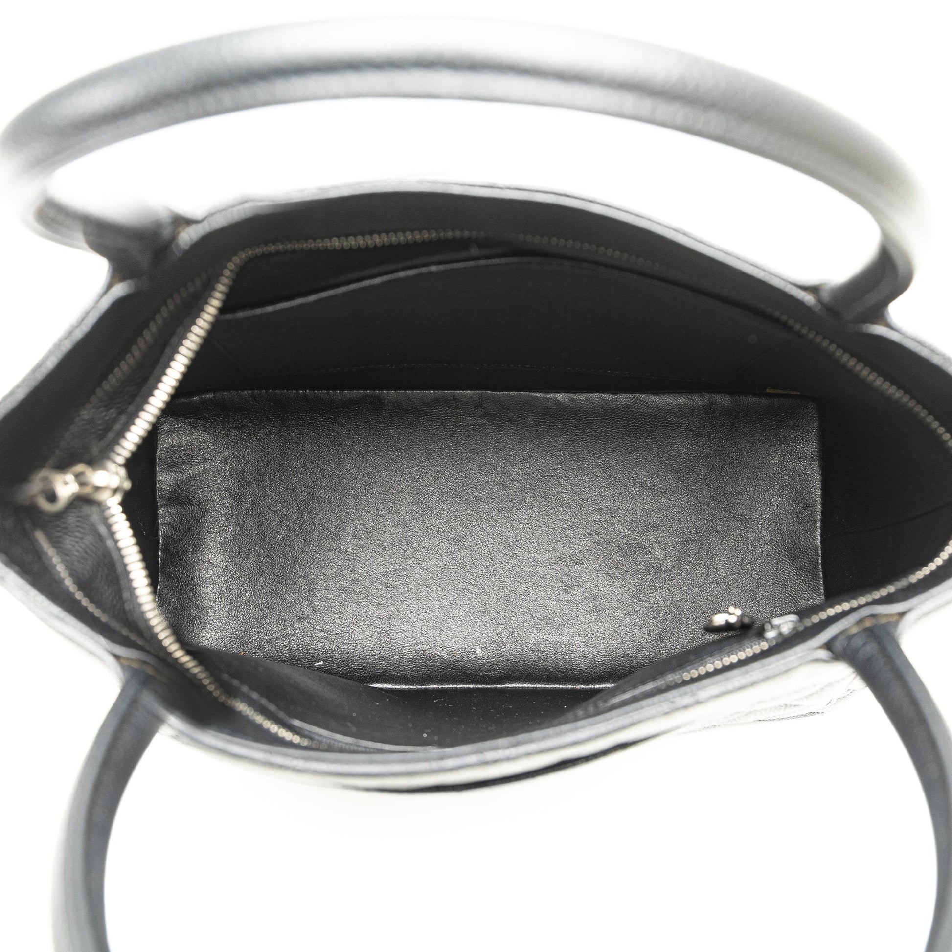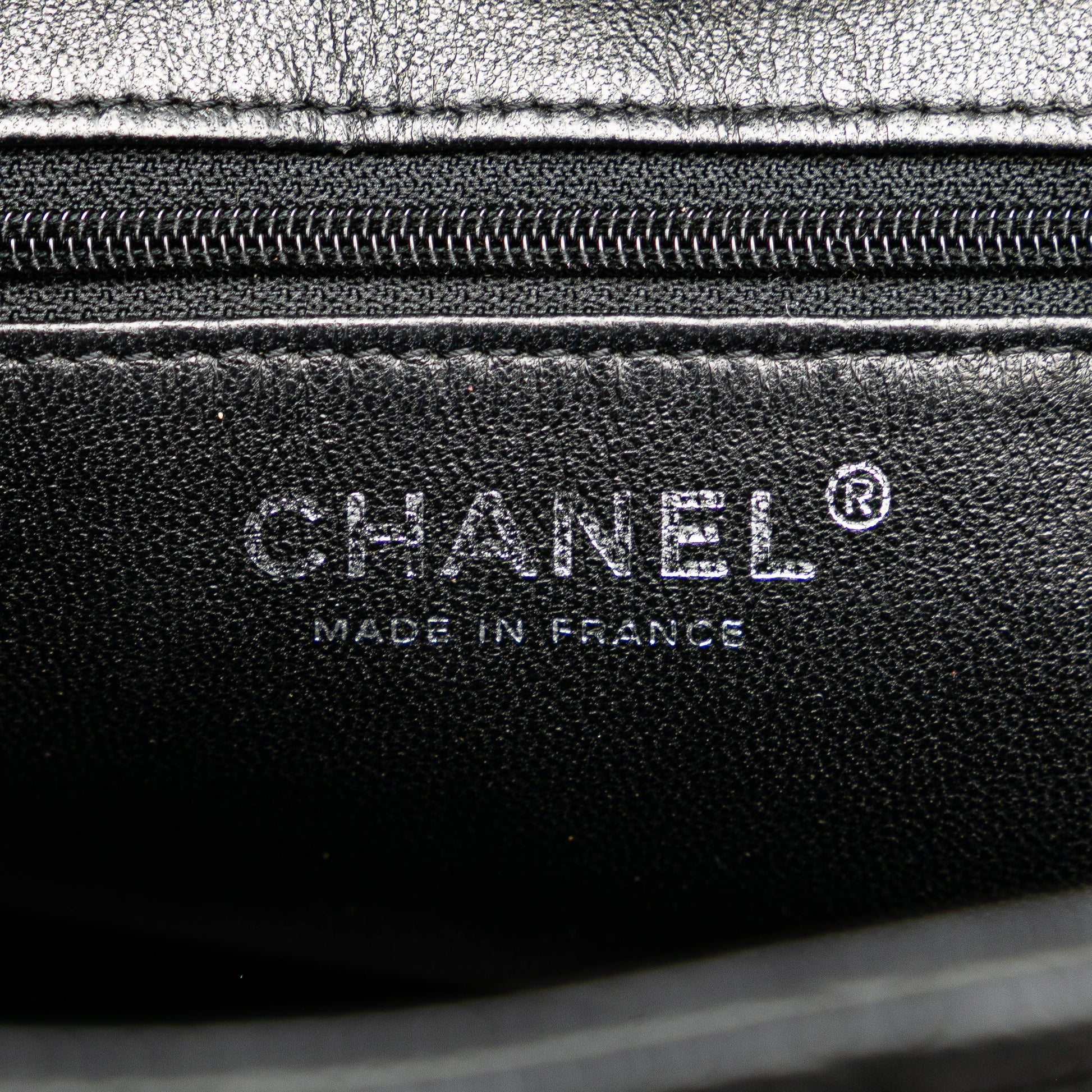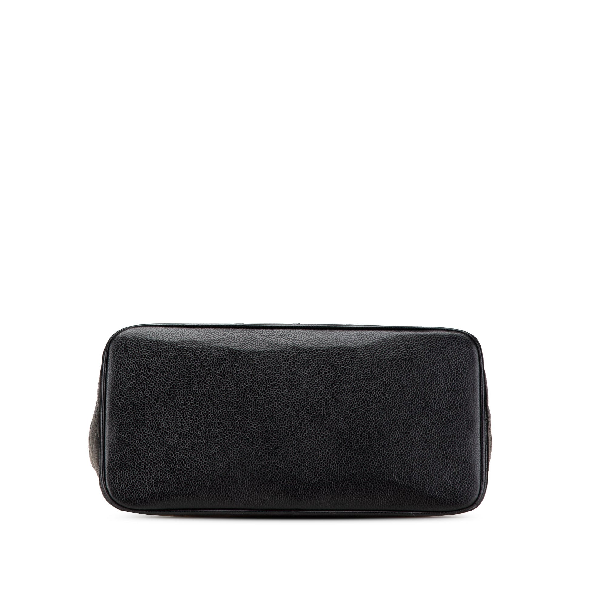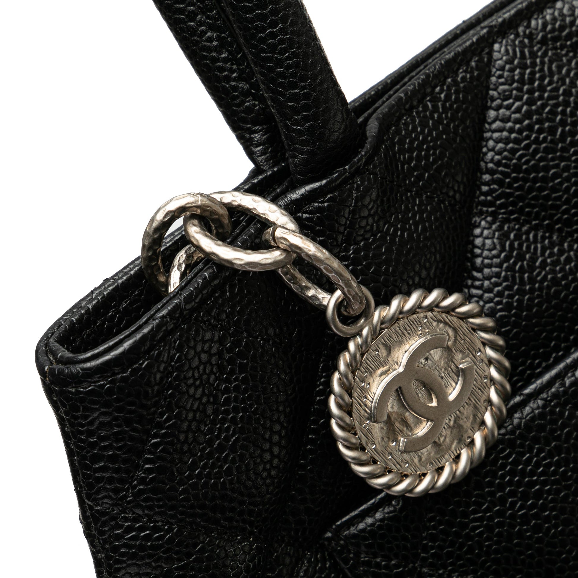 Product Details: Black Chanel Caviar Medallion Tote. The Medallion tote bag features a quilted caviar leather body, rolled leather handles, a top zip closure, an exterior back slip pocket, and interior zip and slip pockets. 9.4" L x 11.8" W x 5.9" D, 5.5" drop. Serial number 10242080.