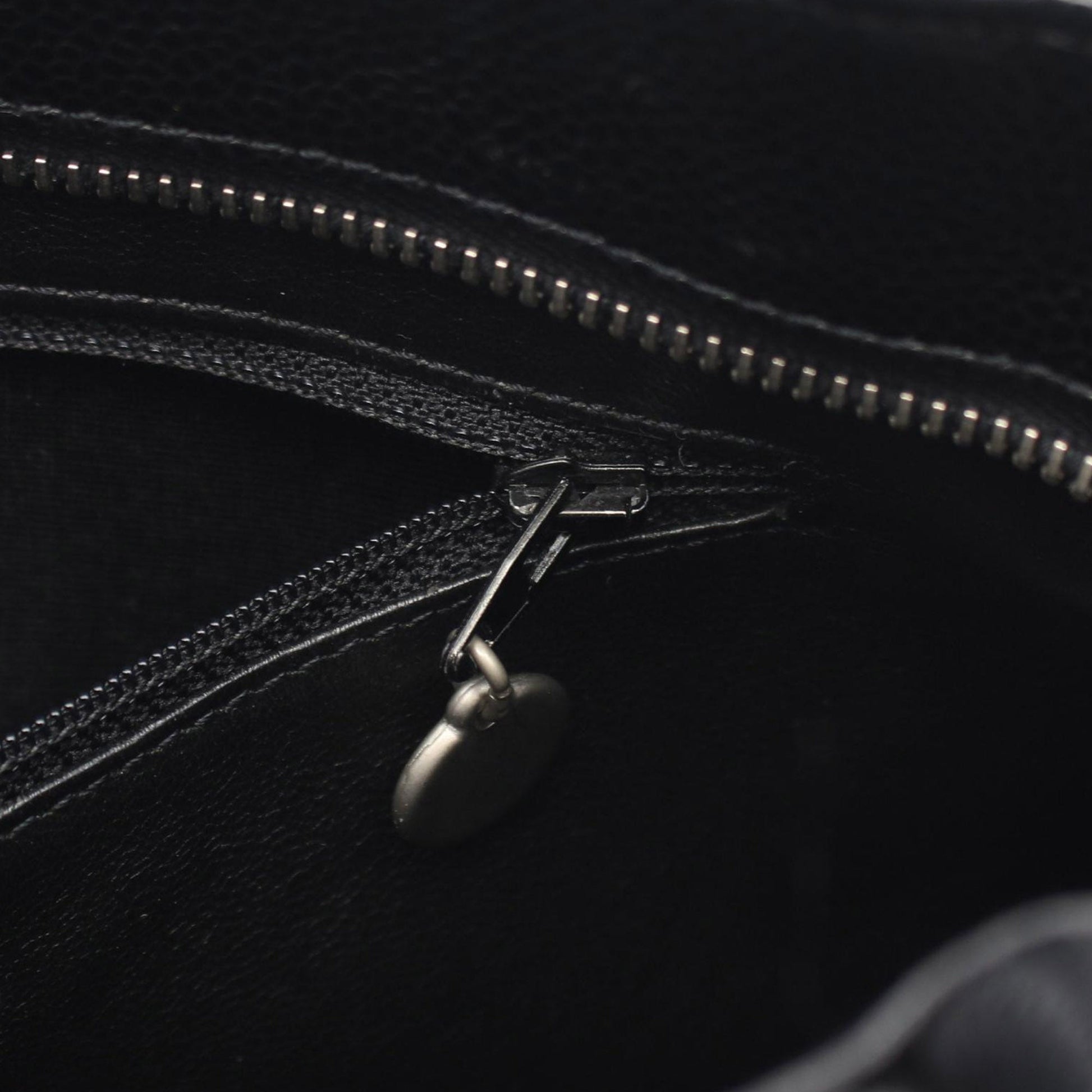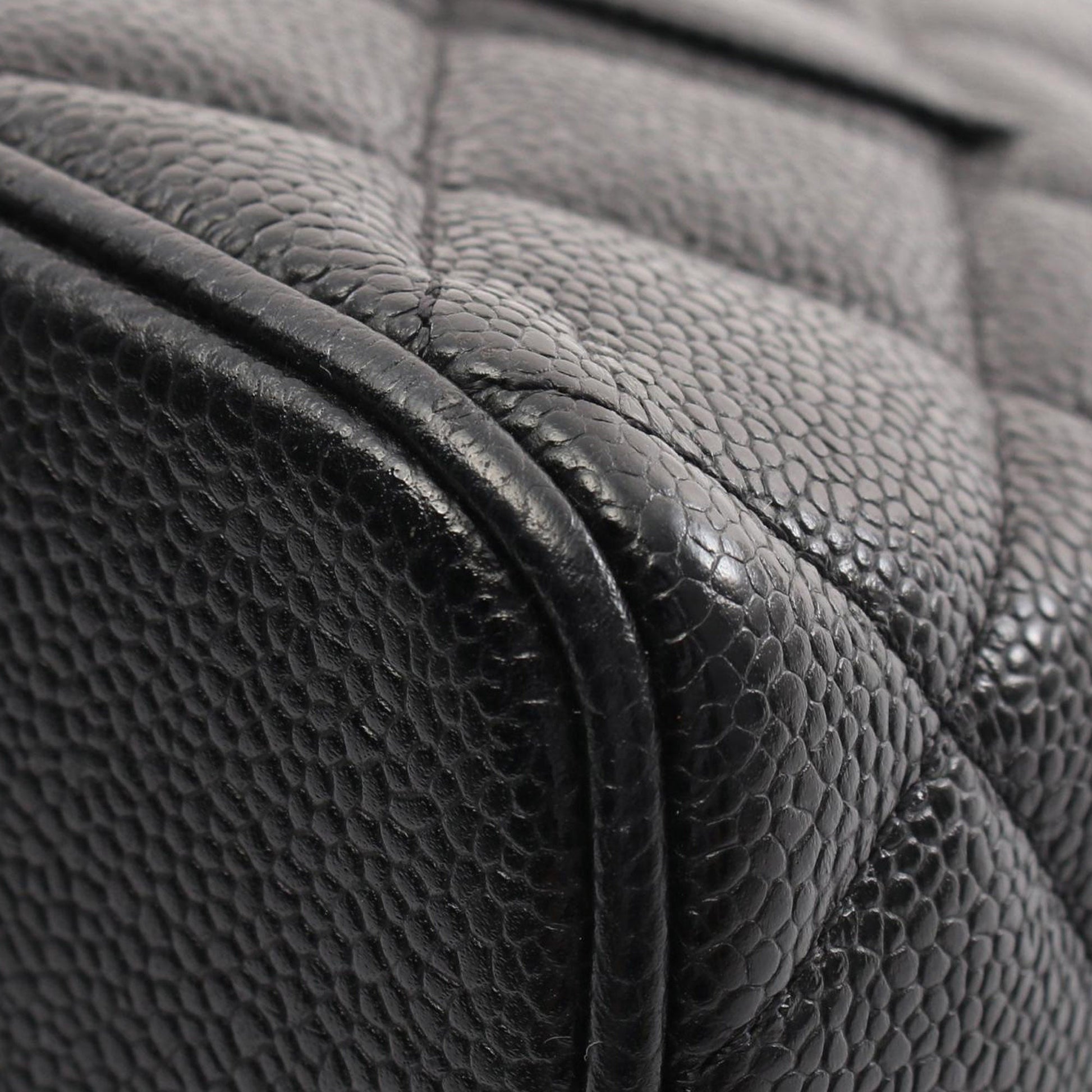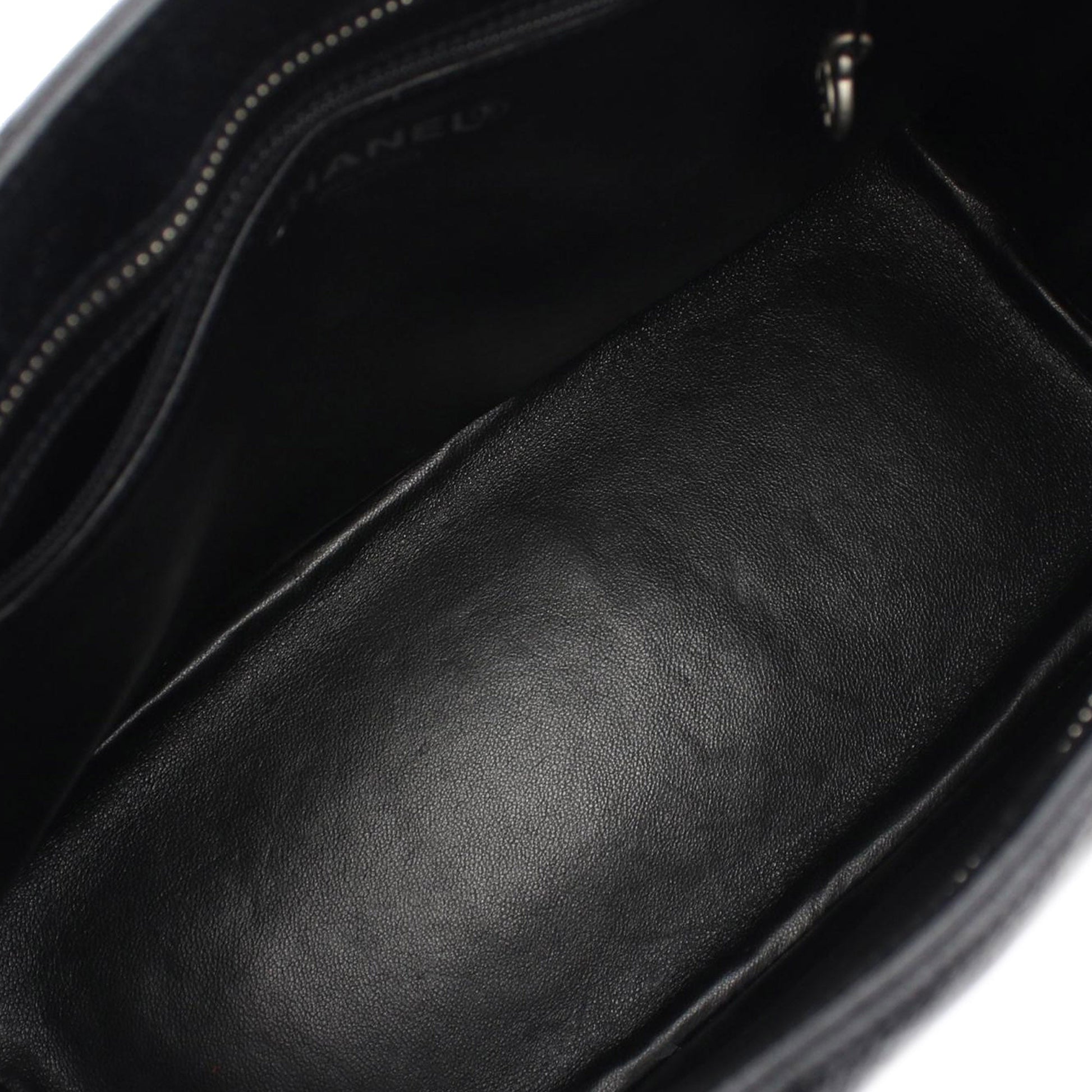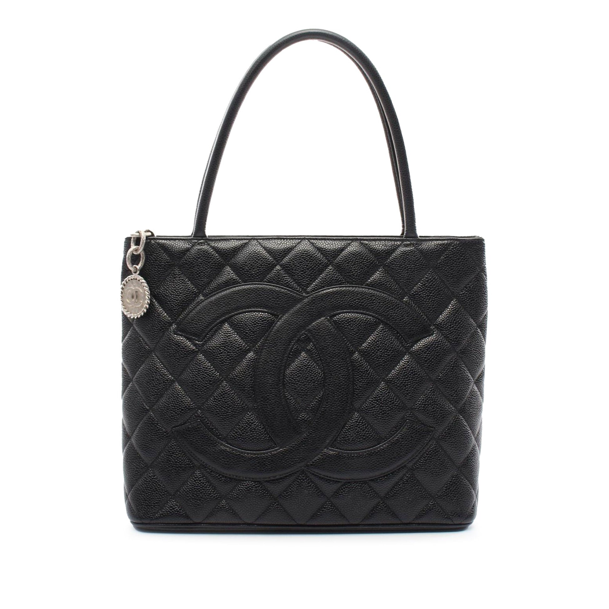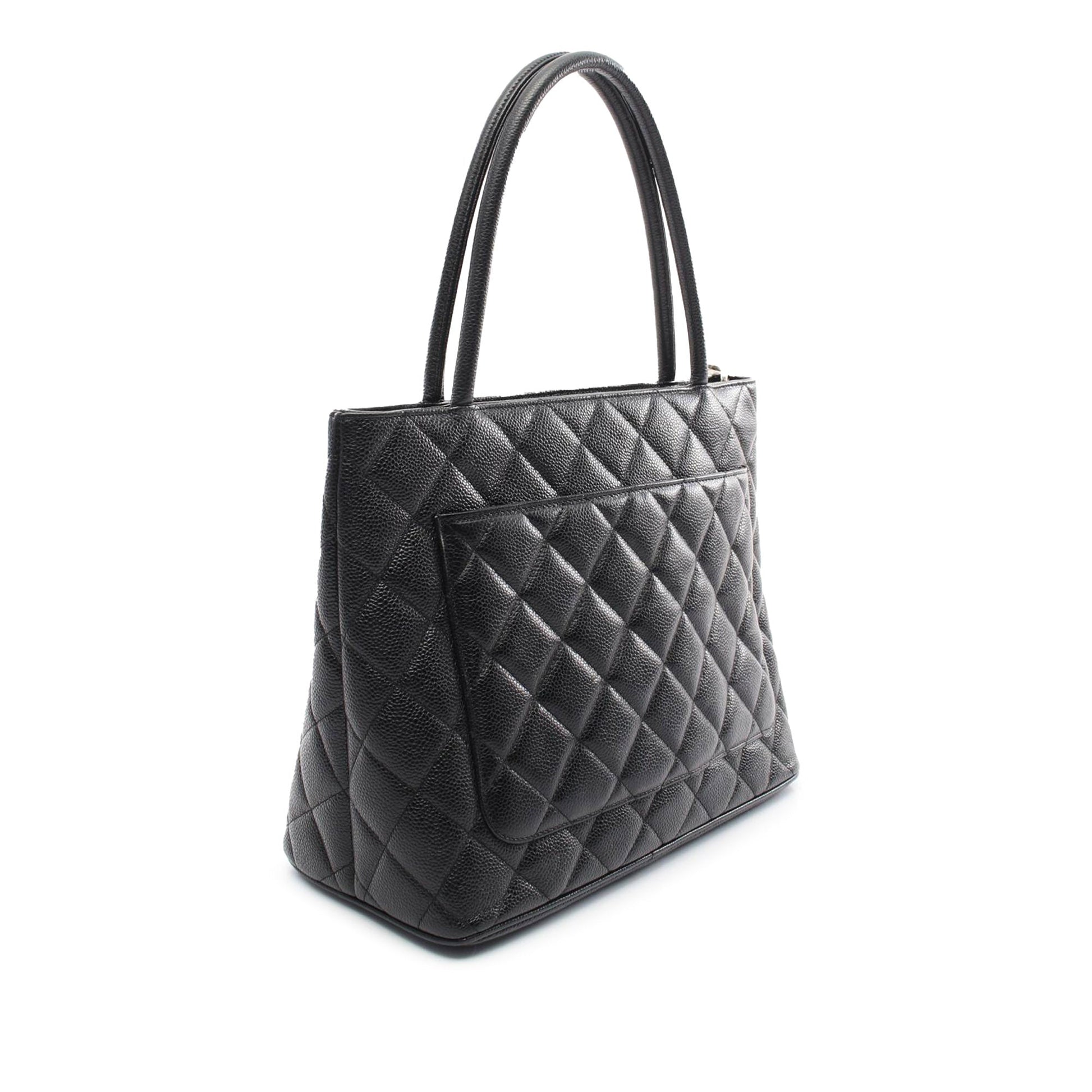 Product Details: Black Chanel Caviar Medallion Tote. The Medallion tote bag features a quilted caviar leather body, rolled leather handles, a top zip closure, an exterior back slip pocket, and interior zip and slip pockets. 9.8" L x 11.8" W x 5.5" D, 5.9" drop. Serial number 6505198.