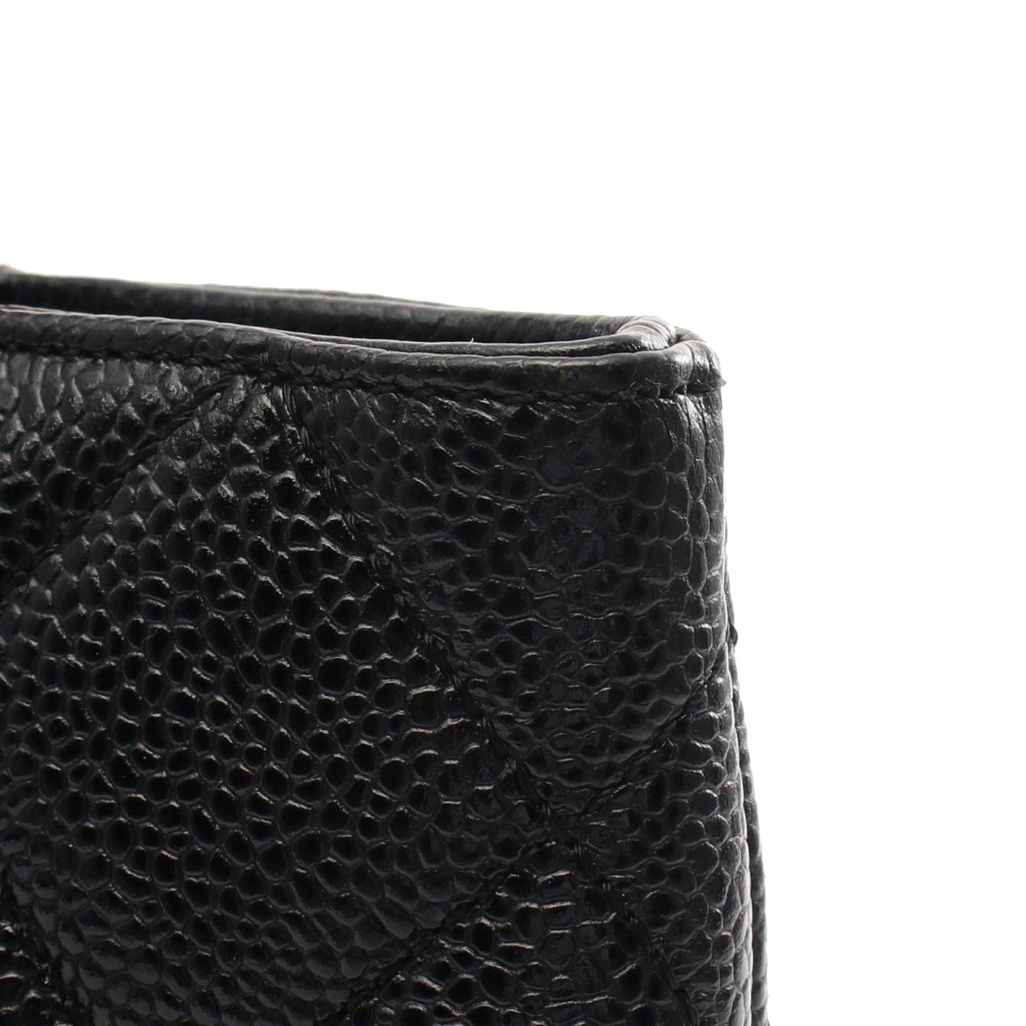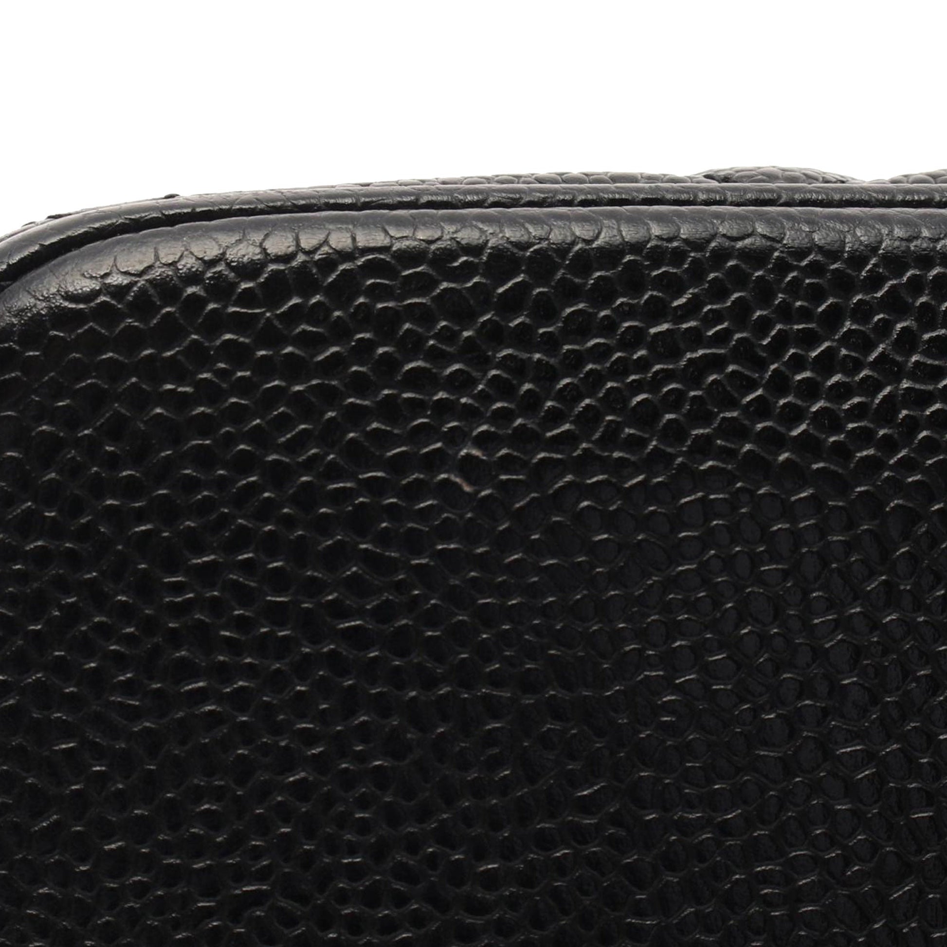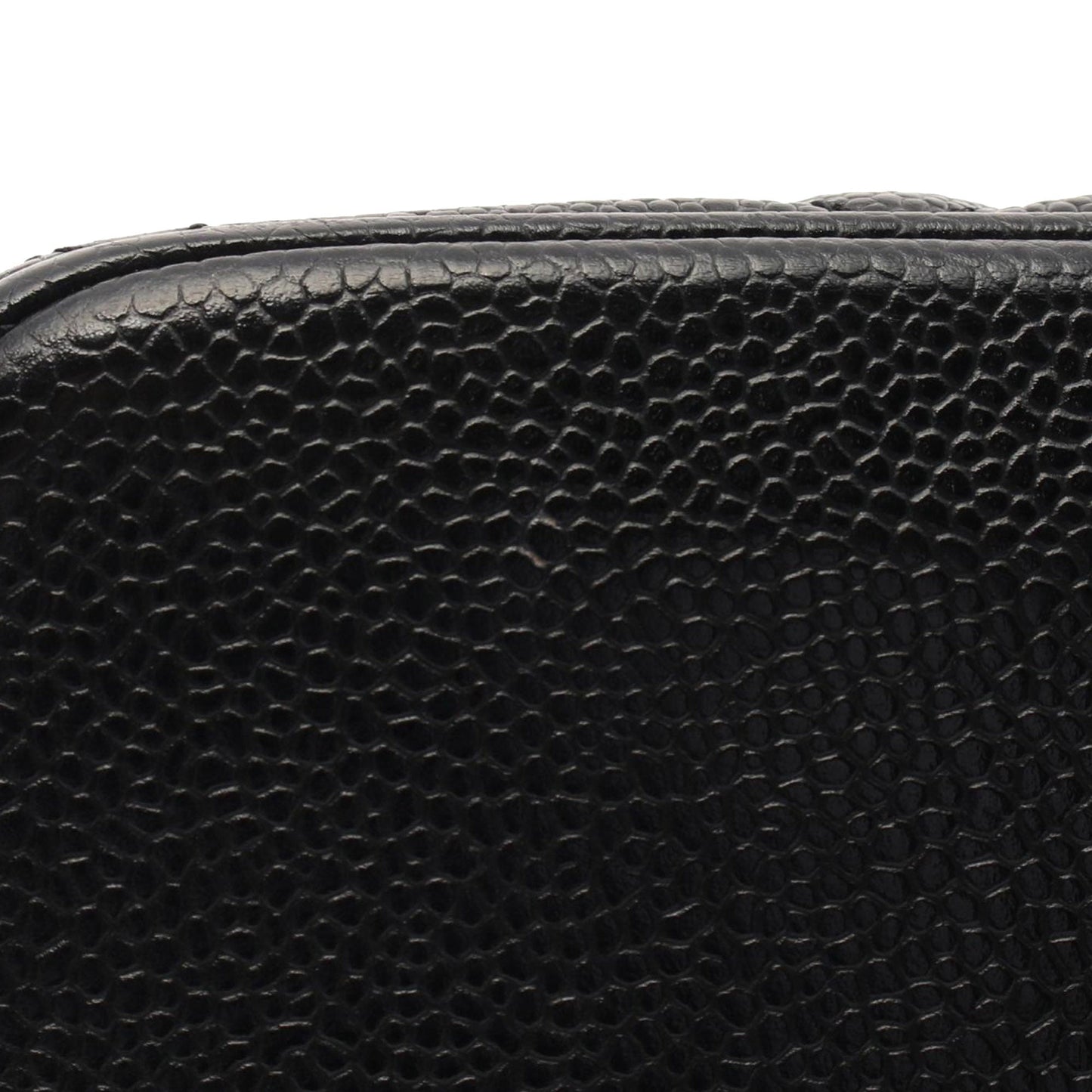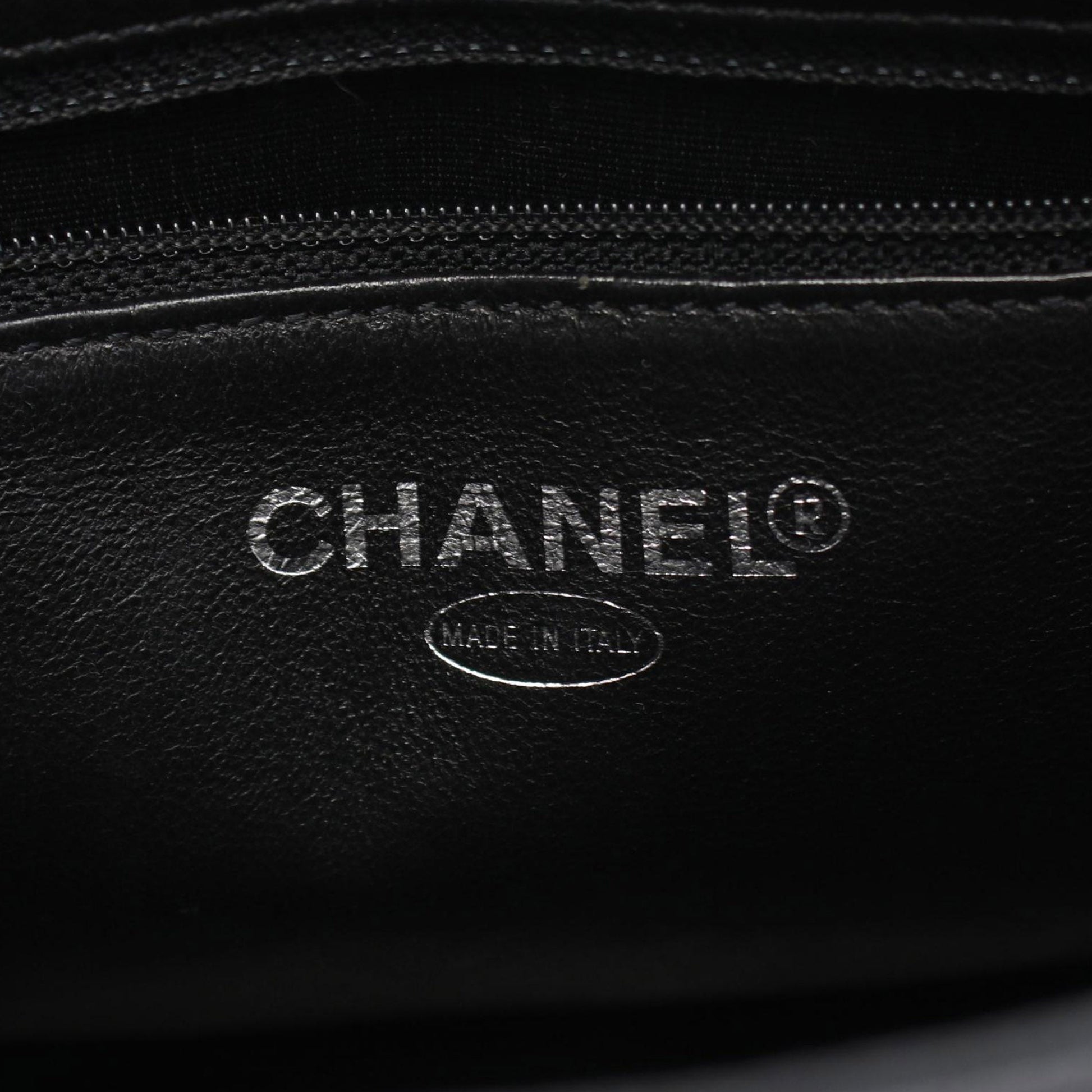 Product Details: Black Chanel Caviar Medallion Tote. The Medallion tote bag features a quilted caviar leather body, rolled leather handles, a top zip closure, an exterior back slip pocket, and interior zip and slip pockets. 9.8" L x 11.8" W x 5.5" D, 5.9" drop. Serial number 6505198.