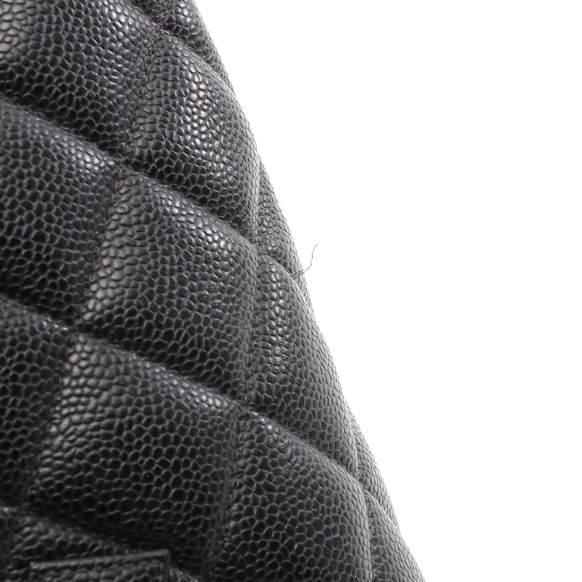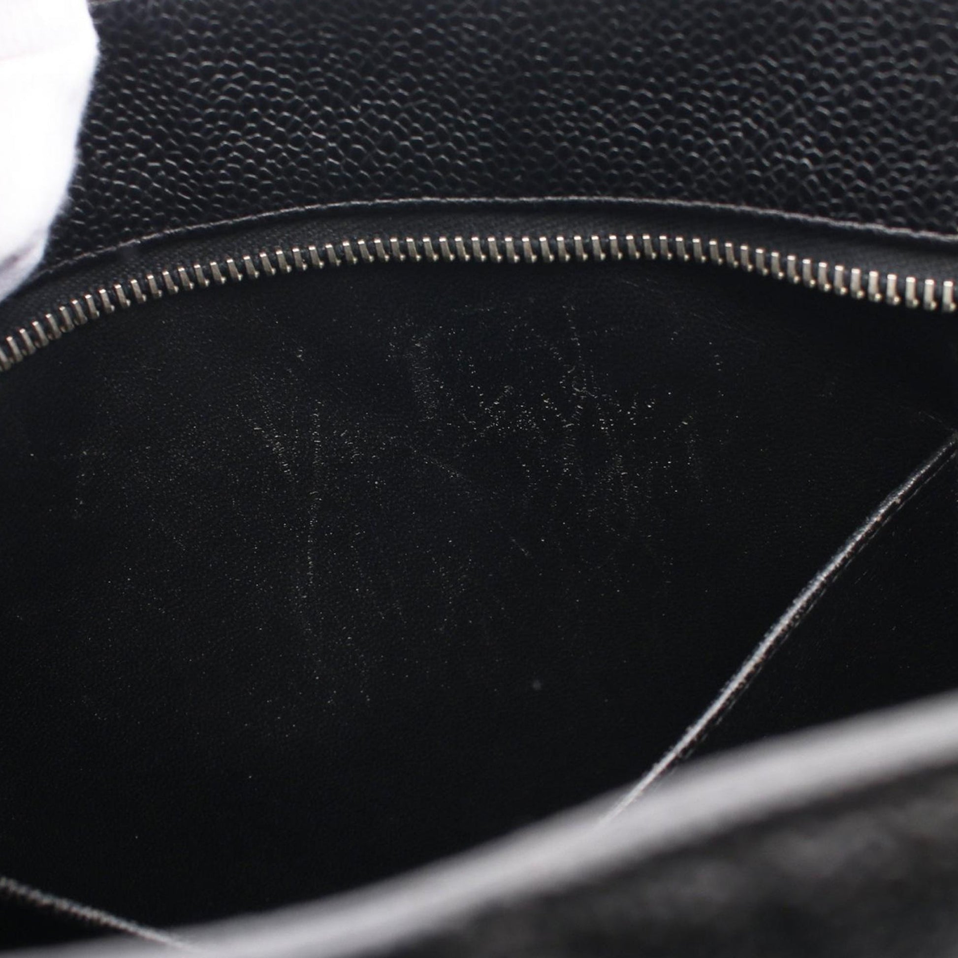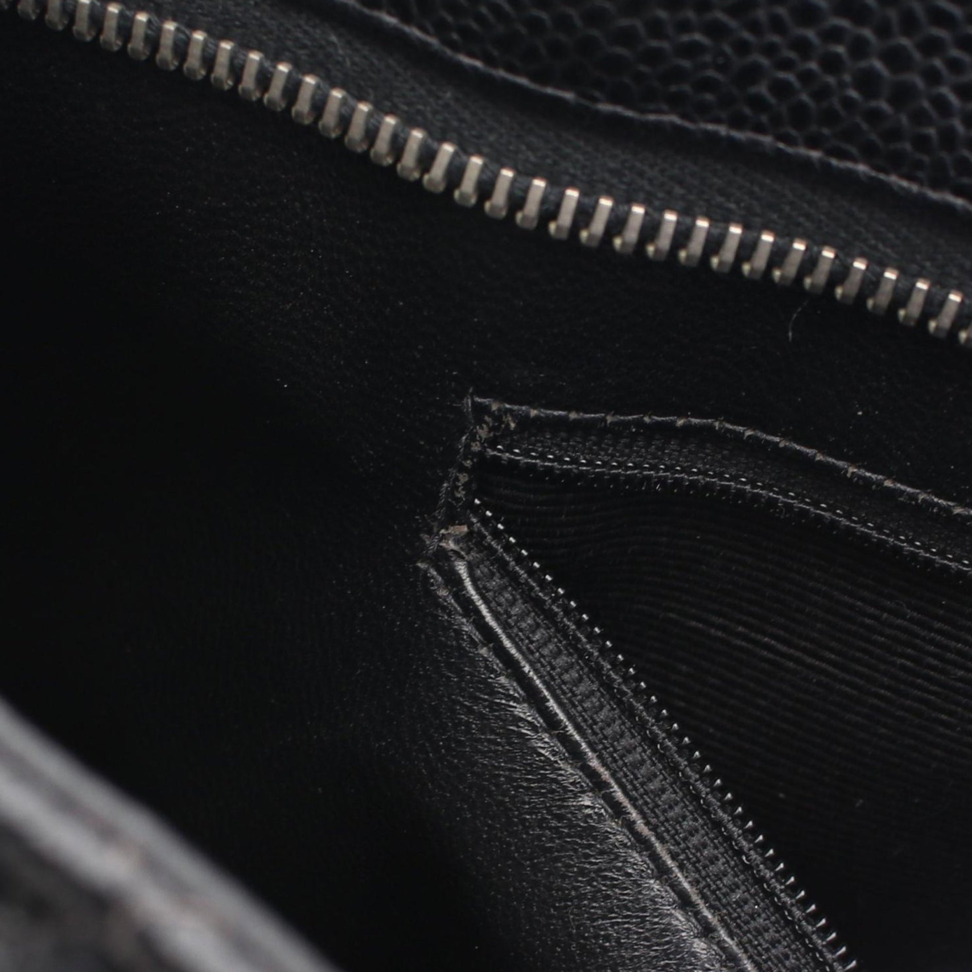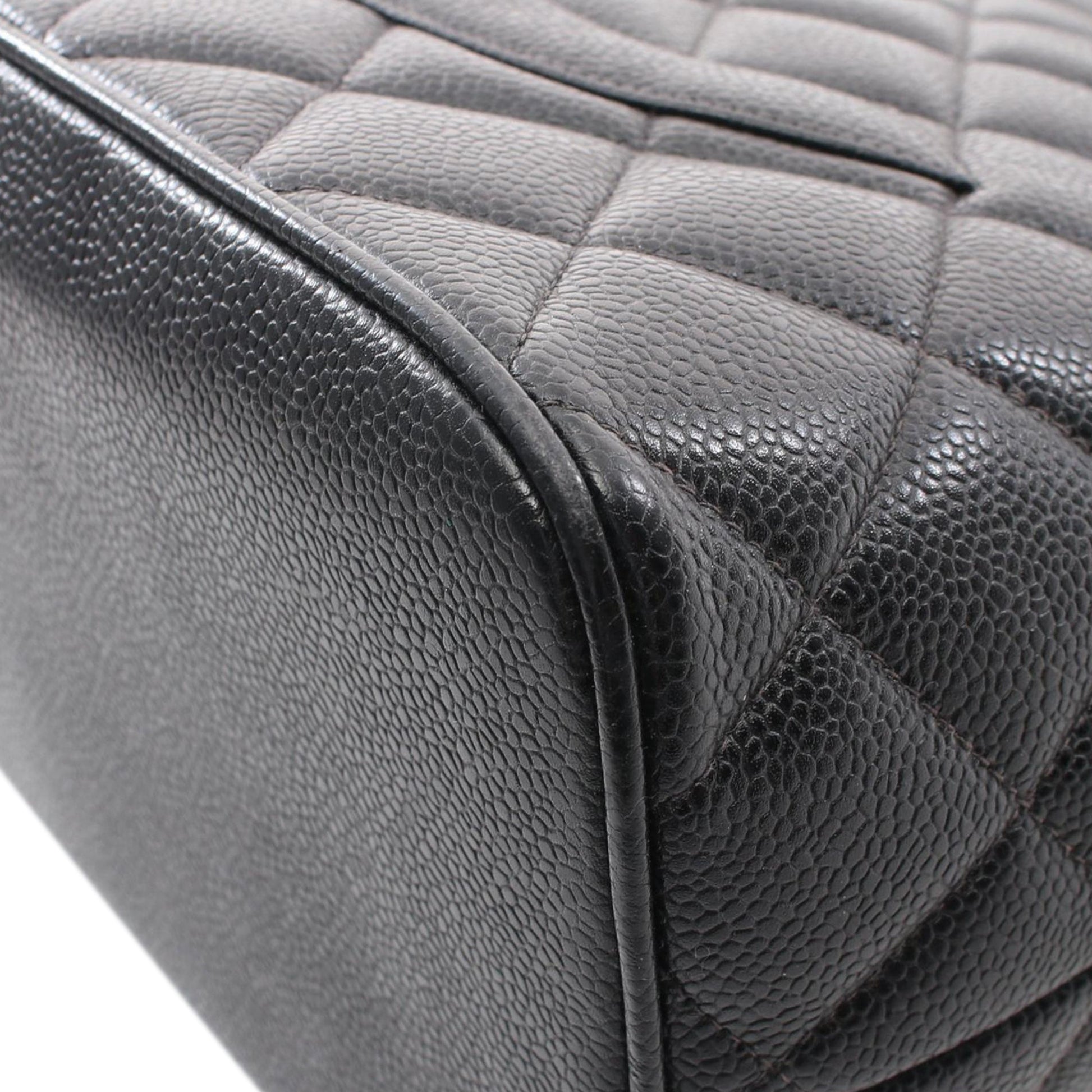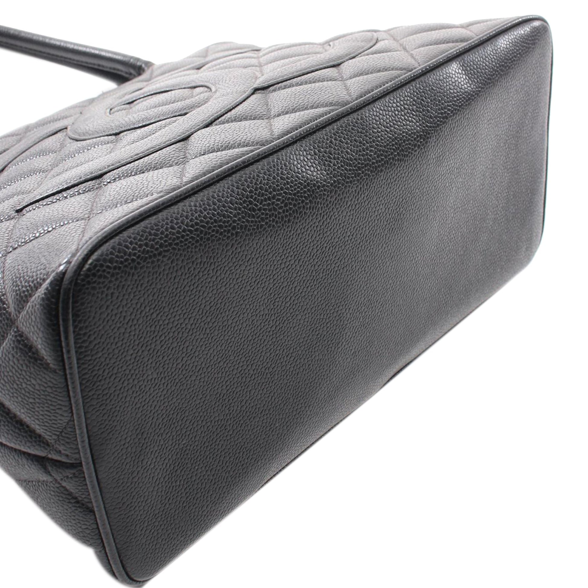 Product Details: Black Chanel Caviar Medallion Tote. The Medallion tote bag features a quilted caviar leather body, rolled leather handles, a top zip closure, an exterior back slip pocket, and interior zip and slip pockets. 9.8" L x 11.8" W x 5.5" D, 5.9" drop. Serial number 6071078.