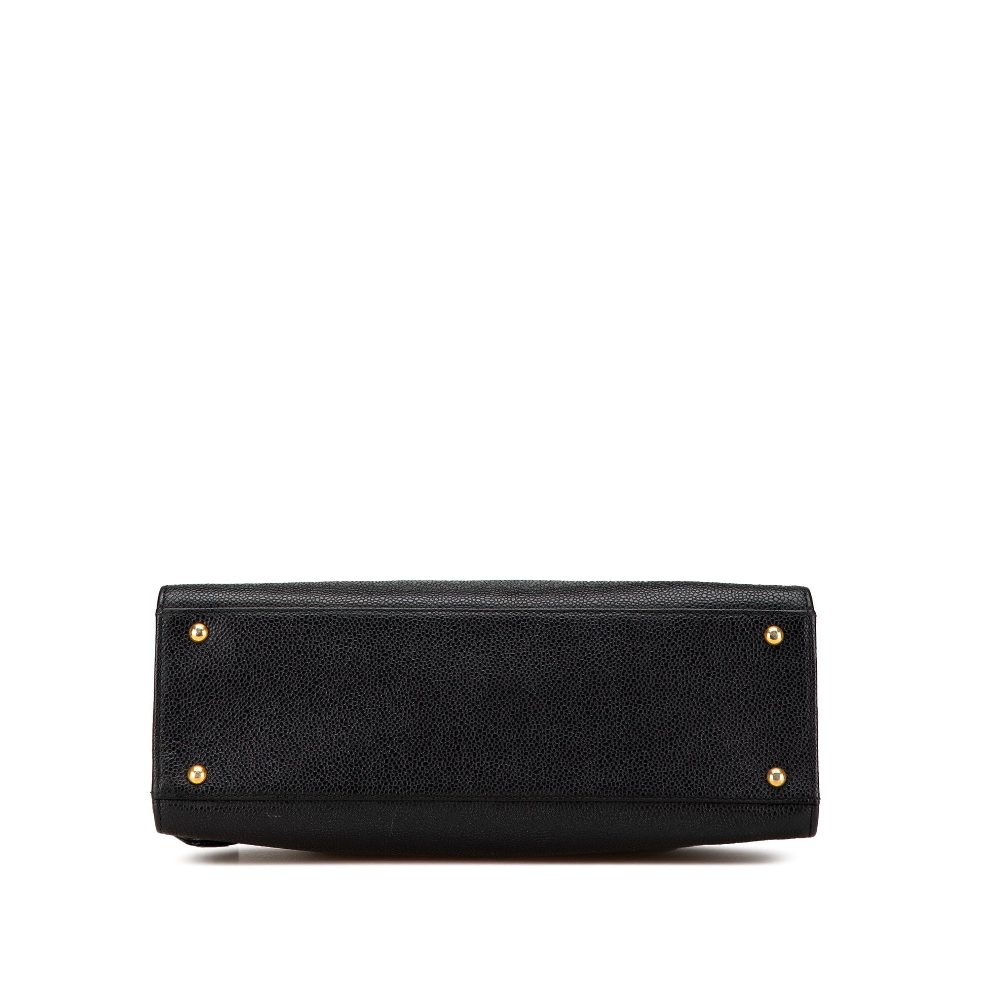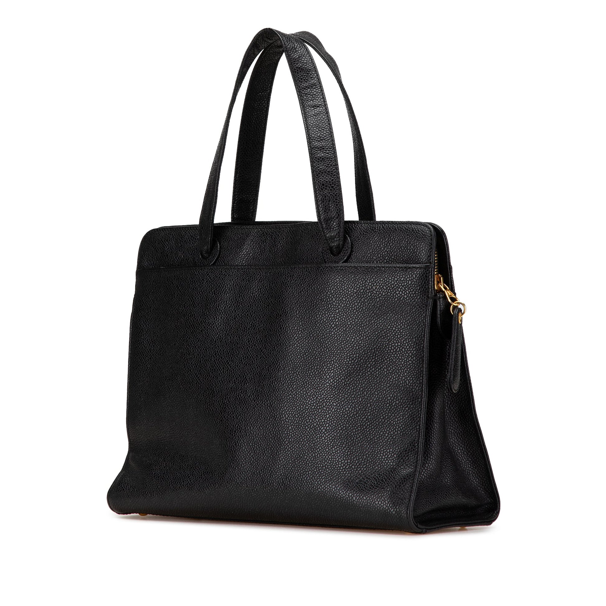 Product Details: Black Chanel Caviar Zip Handbag. This tote bag features a caviar leather body, flat leather handles, a top zip closure, exterior slip pockets, and interior zip pockets. 9.1" L x 11.8" W x 4.3" D, 5.7" drop. Serial number 5326141.